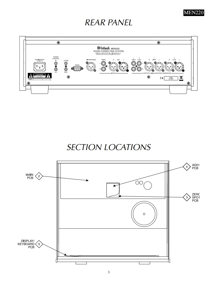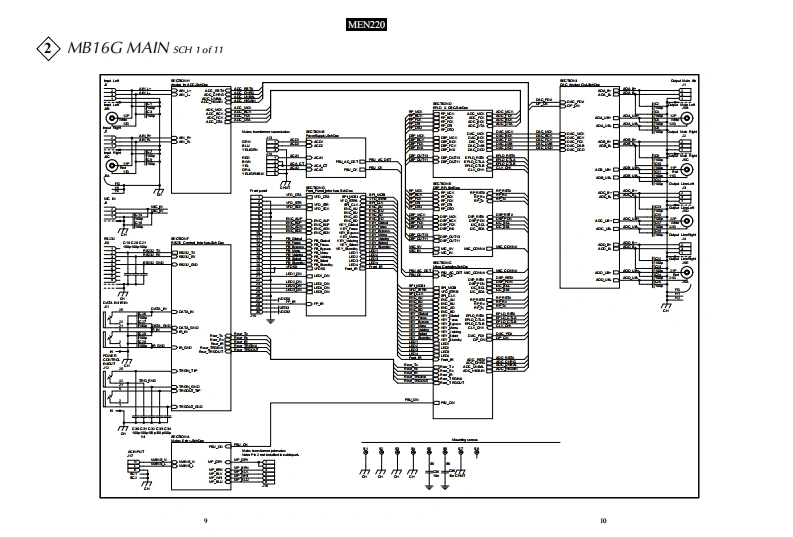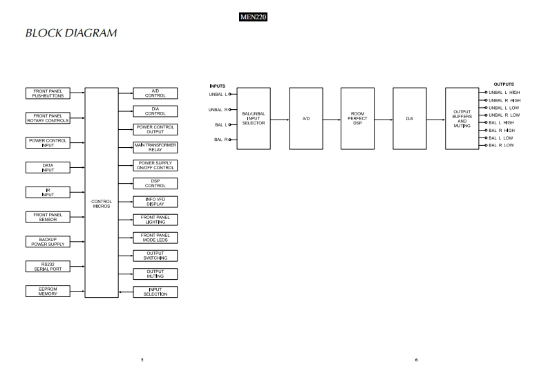MEN220ROOM CORRECTIONSYSTEMSERIAL NO.ZN1001 And AboveIelnfoshMEN220 ROOM CORRECTION BYSTEMRoomPerfect:Focus 1Voicing 0:NeutralàCONTENTSPerformance SpecificationsMain Schematic and PCB...9.30NOtes.2SP01 Schematic and PCB..31-38Rear Panel3AD01 Schematic and PCB.........39.42Section Location.................3Display/Keyboard Schematic and PCB................43-46Block Diagram..5.6Parts List.………47-68Interconnection Diagram..8Repacking Instruction.69SERVICE MANUAL