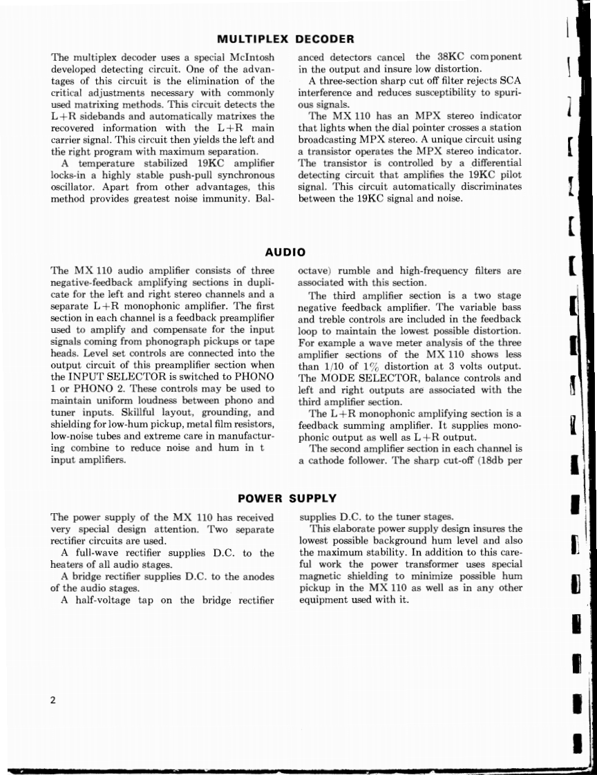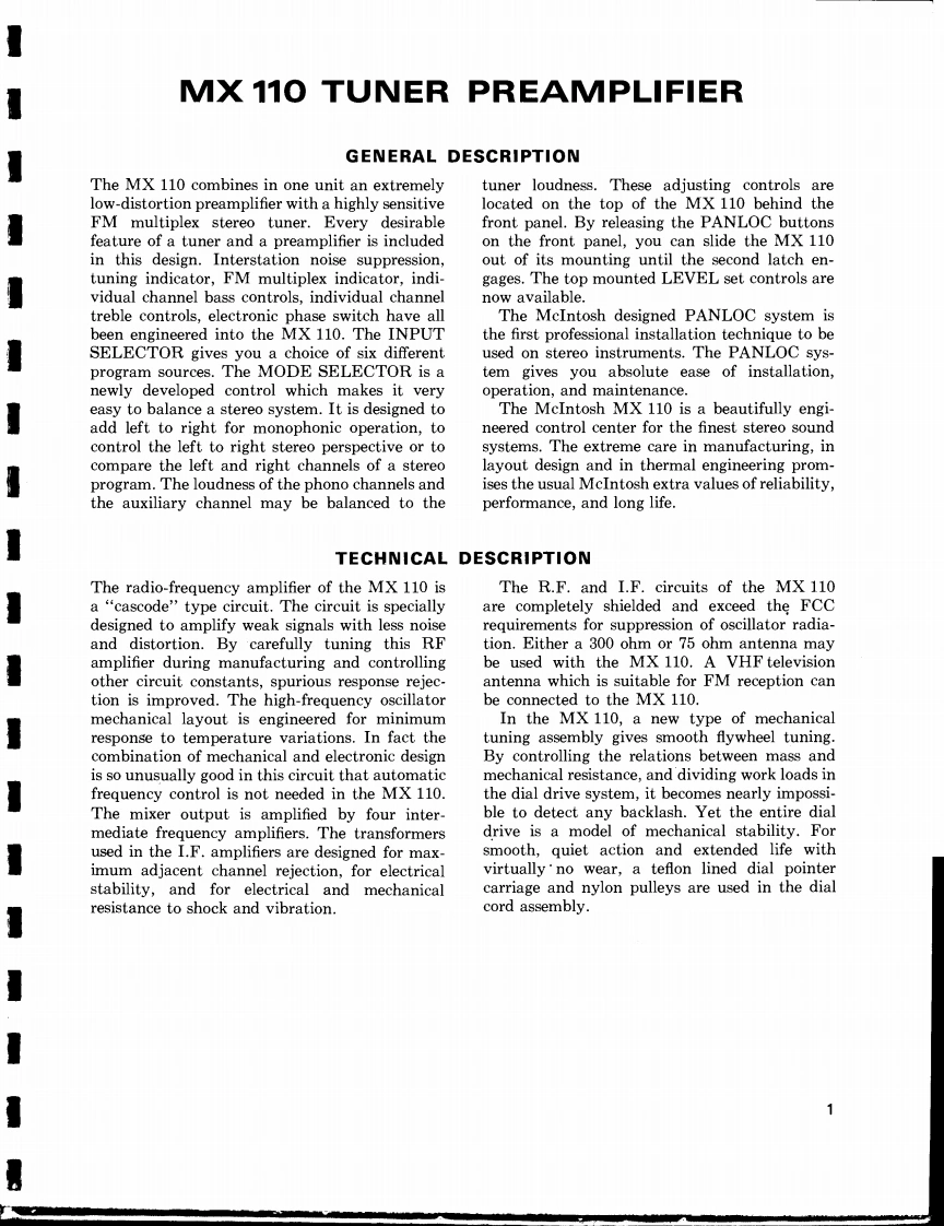 WARRANTY STATIONTEREO TUNER PREAMPLIFIERMX110SERVICE MANUAL■CONTENTSEGENERAL DESCRIPTION.TECHNICAL DESCRIPTION..............INTRODUCTION.......................3FM ALIGNMENT.·MULTIPLEX ALIGNMENT...··6SCHEMATIC..................DIAL STRINGING......................11PARTS LIST.…12SPECIFICATIONS......................16CHASSIS LAYOUT.·18OPERATING CURVES...................0M AND X SERIES SCHEMATICS......POCKETIInlosh2 CHAMBERS ST.BINGHAMTON,N.Y.llltIntosh Mx 110