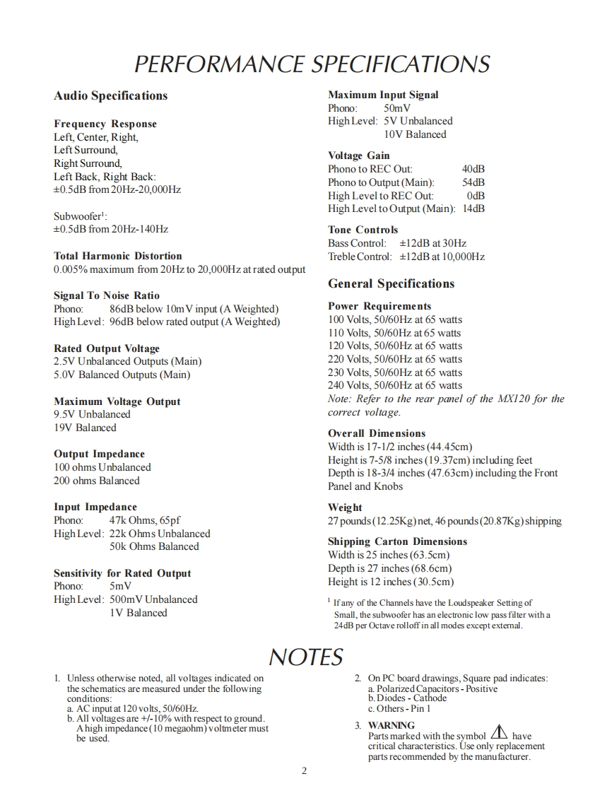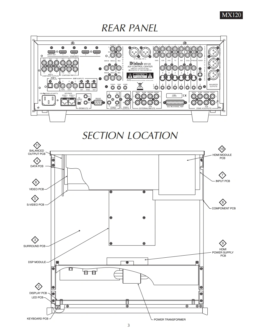 hMX120A/V CONTROL CENTERSERIAL NO.XN1001 And AboveNPUTMclnfoshMX120 A/V CONTROL CENTER20440DKDI28TRIM SELECTSURROUND MODECENTEn SPK两⊙dHOMIPREL④NA©r四oo▣✉LATE MOHT⊙CONTENTSPerformance Specifications.2-3S-Video Schematic and PCB37.40Notes.....3Video Schematic and PCB41-44Rear Panel............3Input Schematic and PCB....45-50Section LocationComponent Video Schematic and PCB........51-54Block Diagram5-8HDMI Power Supply Schematic and PCB..........55-56Interconnection Diagram9-10HDMI Module Schematic and PCB................57-58Display Schematic and PCB...….11-18Balanced Output Schematic and PCB ..............59-60Surround Schematic and PCB........19-32Parts List61-74Data Schematic and PCB.........33-36Repacking Instruction.5SERVICE MANUALSerial Number XN1001 And Above