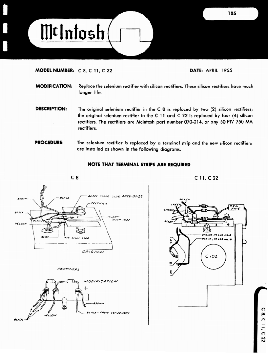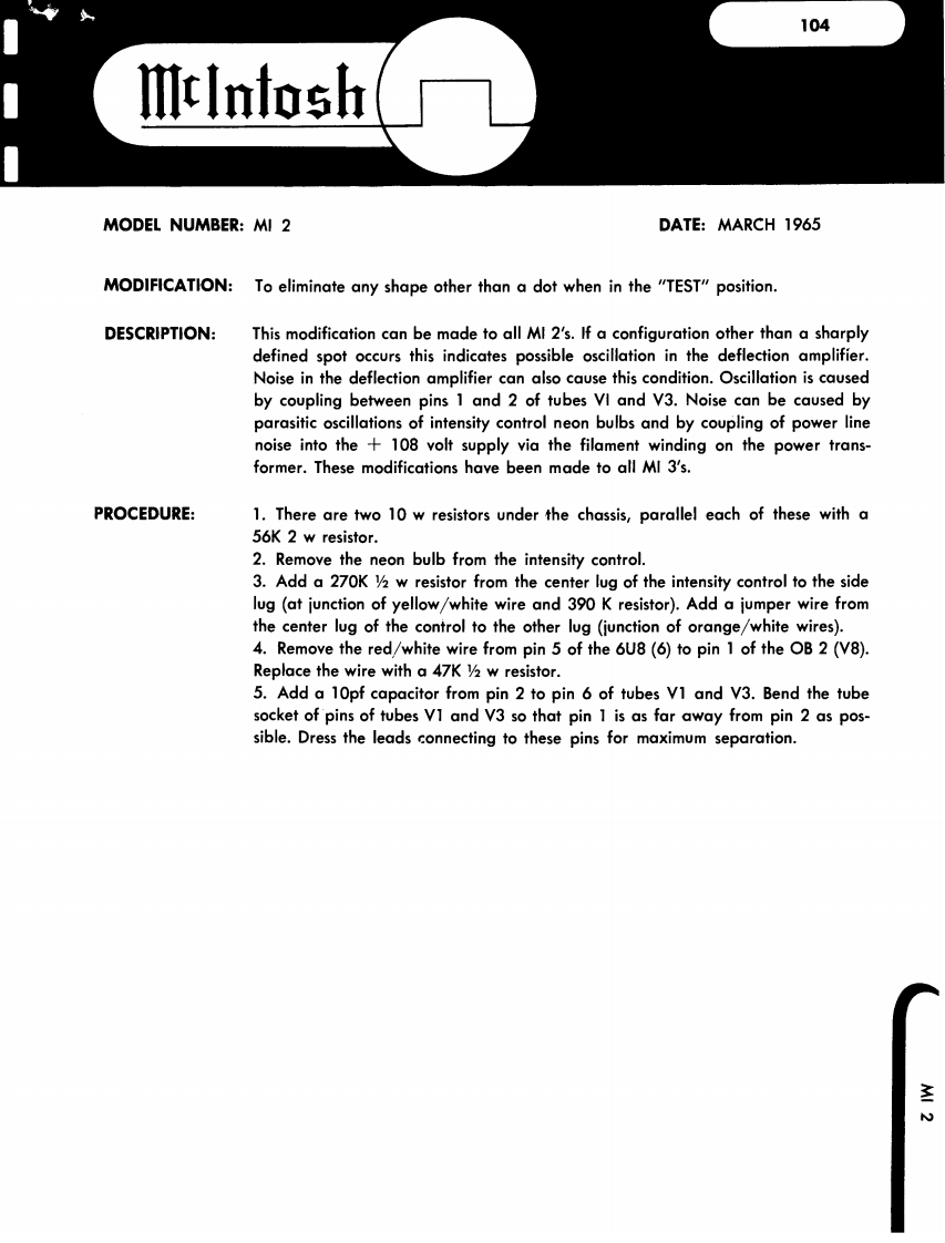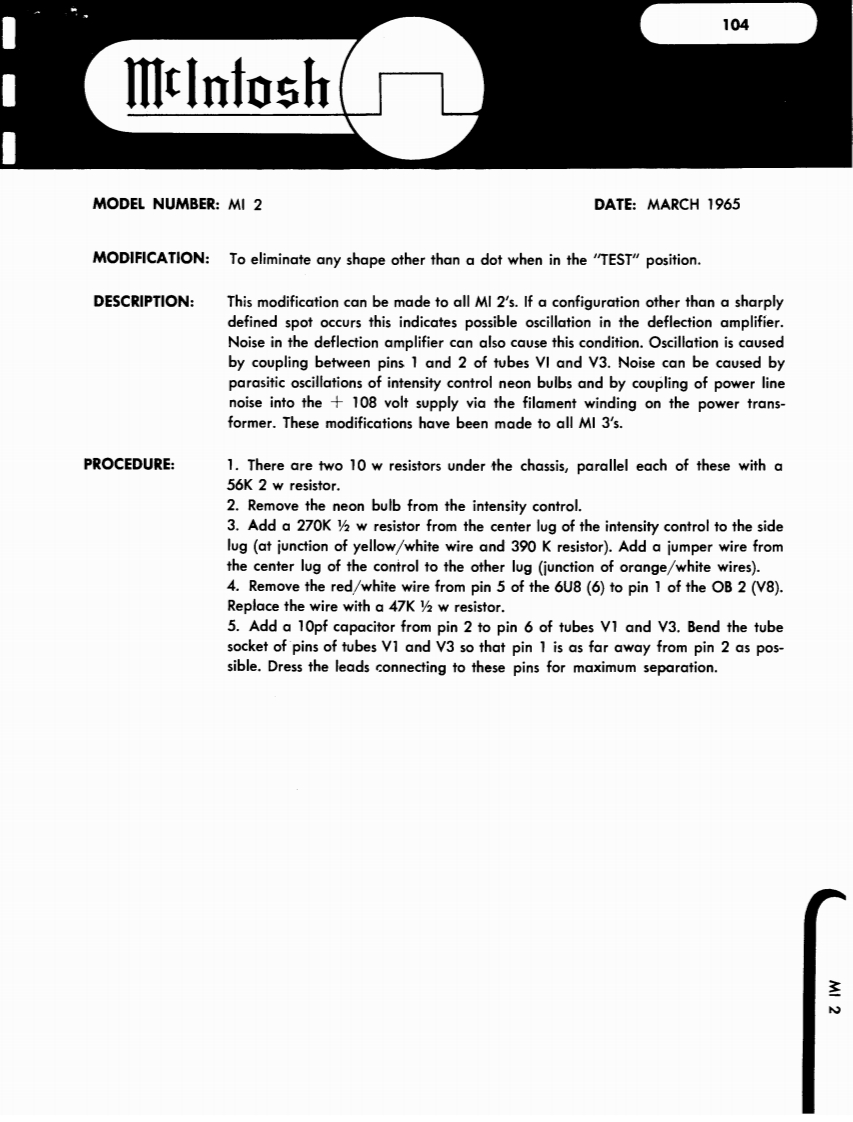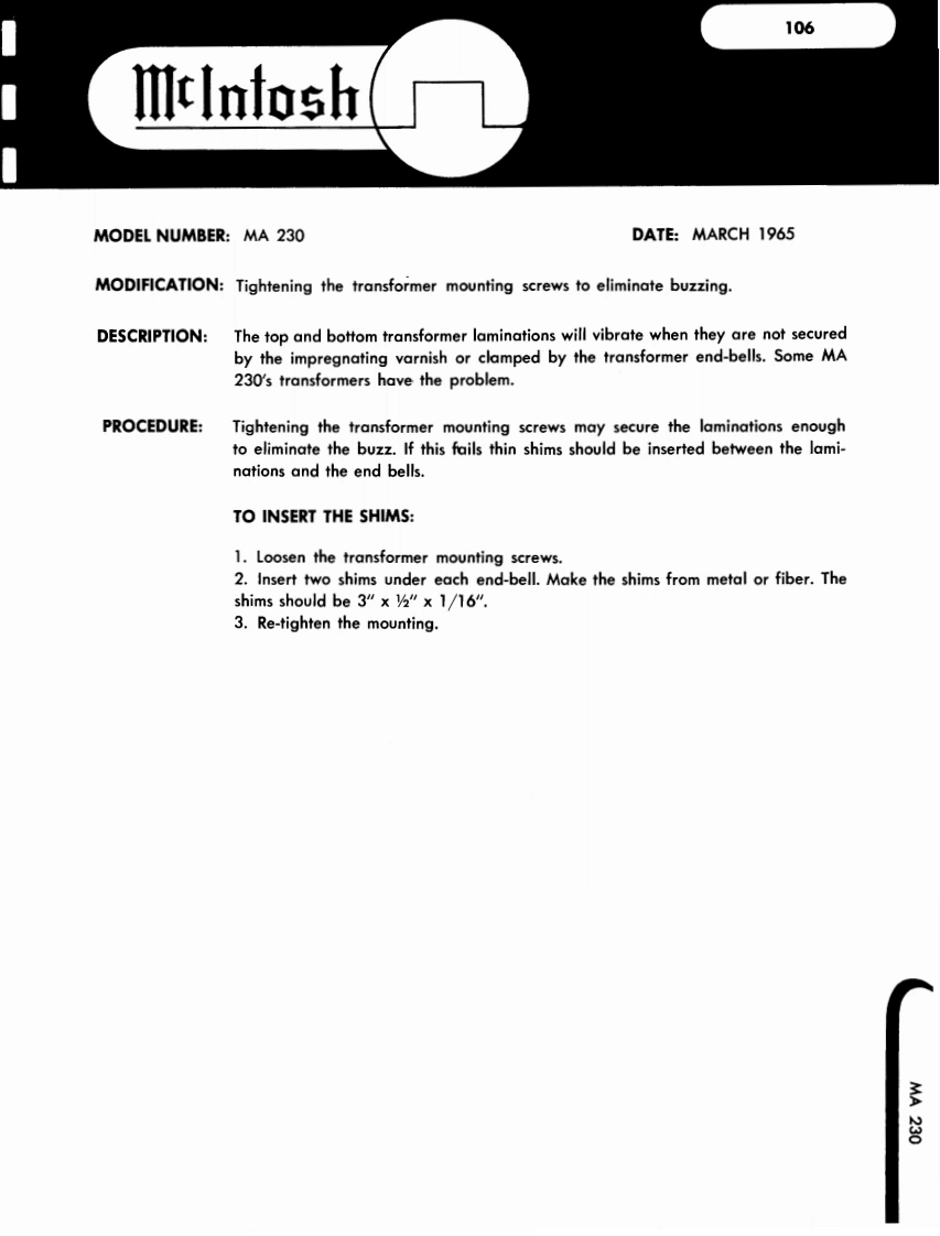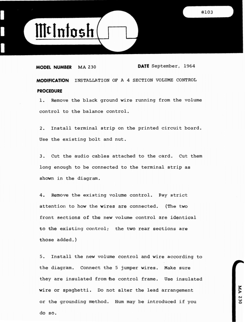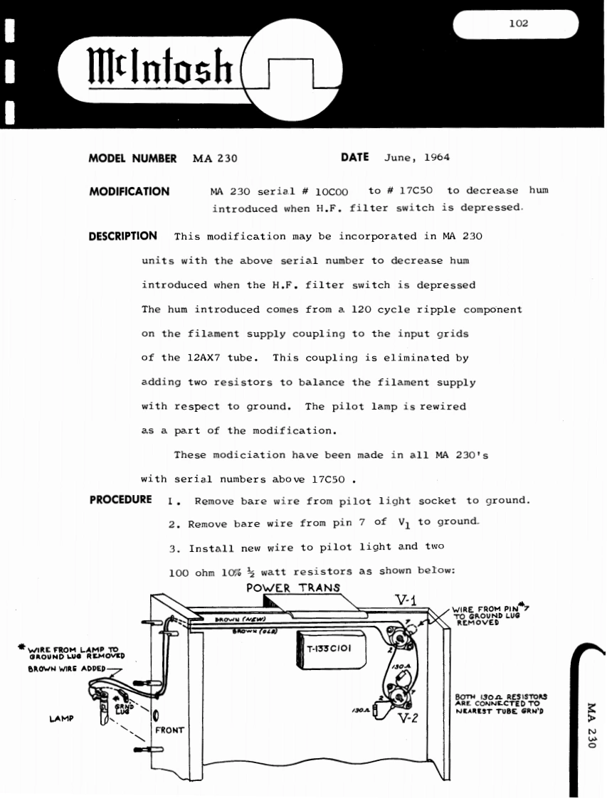 101IllnfoshMODEL NUMBER MA 230DATE June,1964MODIFICATION MA 230 serial #10c00 to 13C03 to increase overall gain.DESCRIPTION This modification may be incorporated in MA 230units having the above serial numbers to increase theoverall gain.The gain is increased two ways:1.The feedback loop in the phono-tape headinput stages is modified by changing the inputtransistor emitter resistors (R 17 and R 18)from 1.8K 5%watt to 1.2K 5%watt.2.The volume control taper characteristicis changed to allow more amplification at alower setting of the control knob by changing theresistors connected to the rear of the loudnesscontrol (R 39 and R 40)for 47K 10%watt to100K10%老watt.These modifications have been made in all MA 230with serial numbers above 13C03MA230