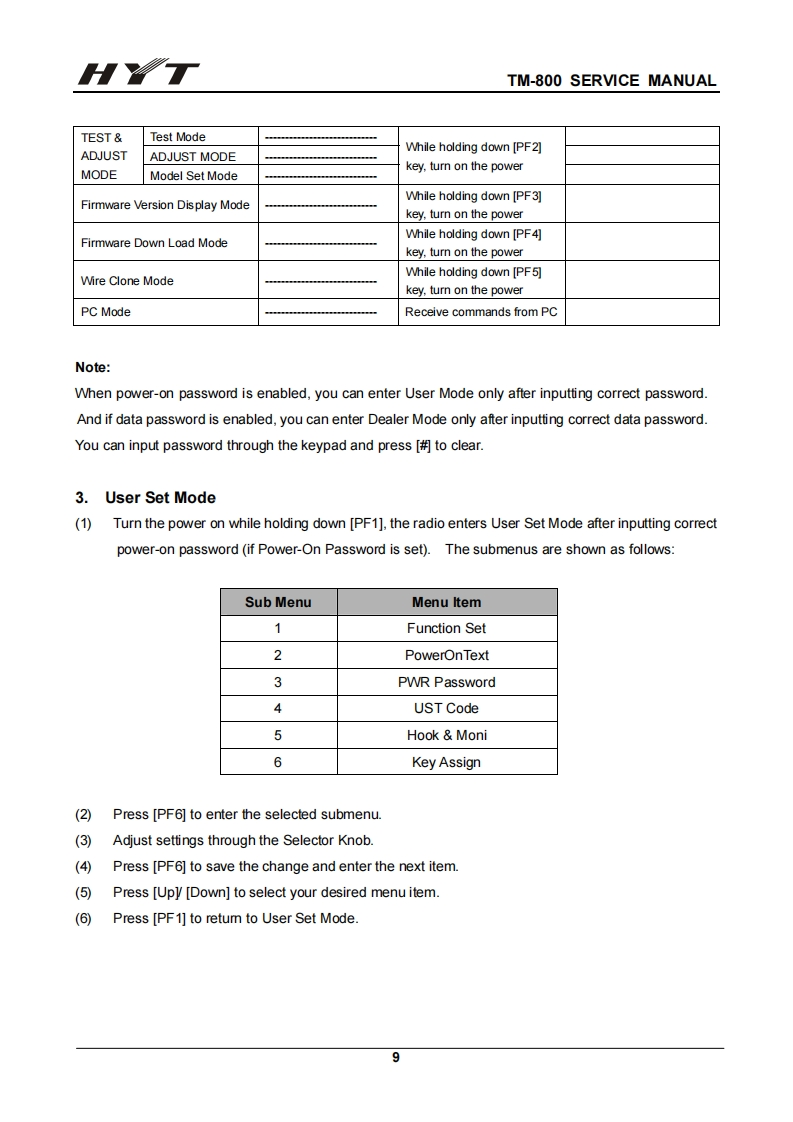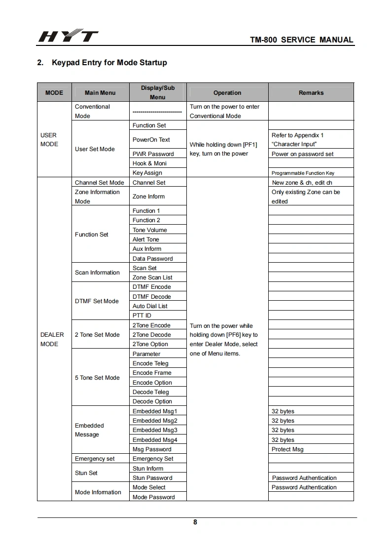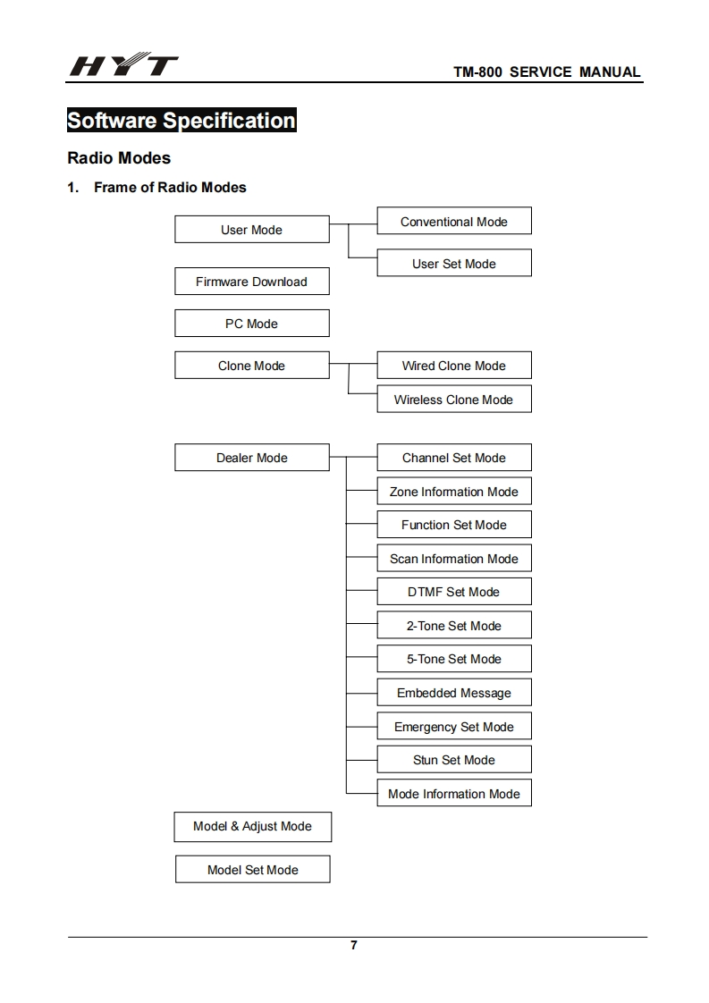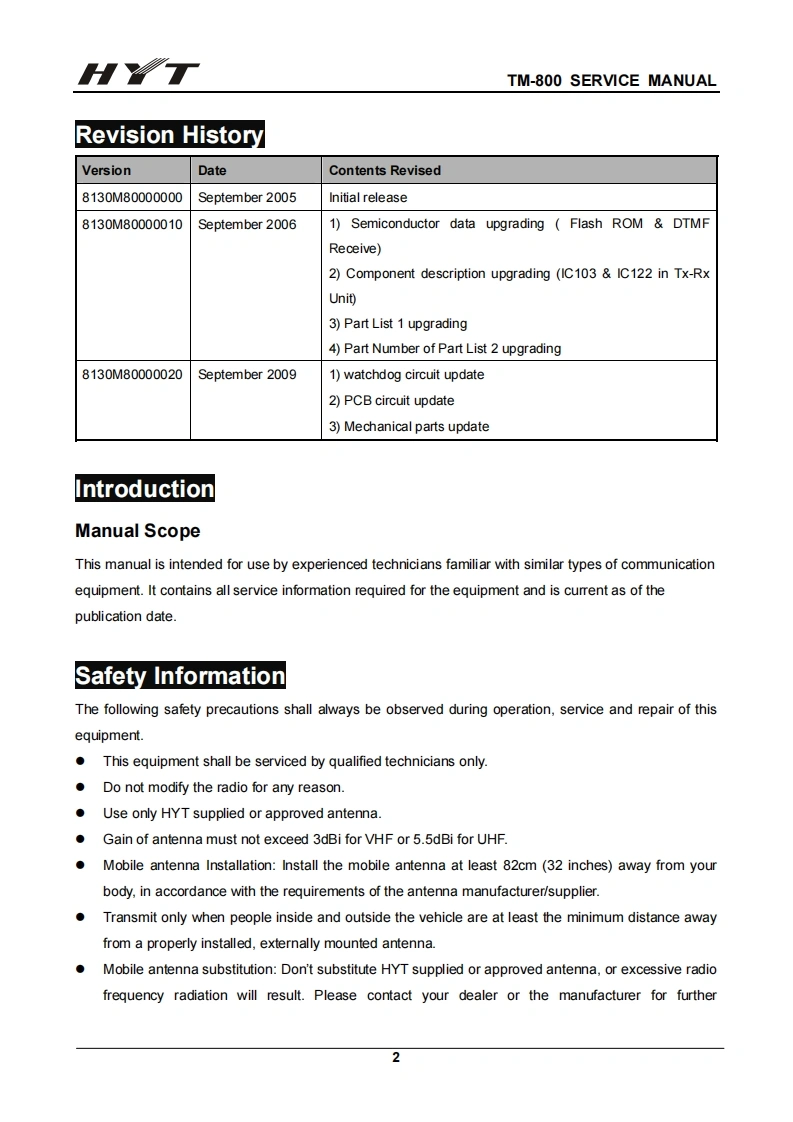 HYTTM-800 SERVICE MANUALCONTENTSRevision History....2Introduction........2Safety Information....2Radio Overview.........4Software Specification ............7Circuit Description......77Semiconductor Data..............83Component Description....90TM-800 Parts List 1........91Tuning..132Adjustment Description ........139Terminal Function...........145Troubleshooting Flow Chart....…149Disassembly and Reassembly for Repair..153TM-800 UHF Exploded View...............157TM-800 UHF Parts List 2....................158TM-800 VHF Exploded View........160TM-800 VHF Parts List 2.....161Packing....163TM-800 UHF PCB View ............164TM-800 VHF PCB View ......166TM-800 UHF Block Diagram......168TM-800 VHF Block Diagram.........169TM-800 UHF Schematic Diagram....170TM-800 VHF Schematic Diagram...............174Specifications..….178Appendix:Entering Characters...........1791
