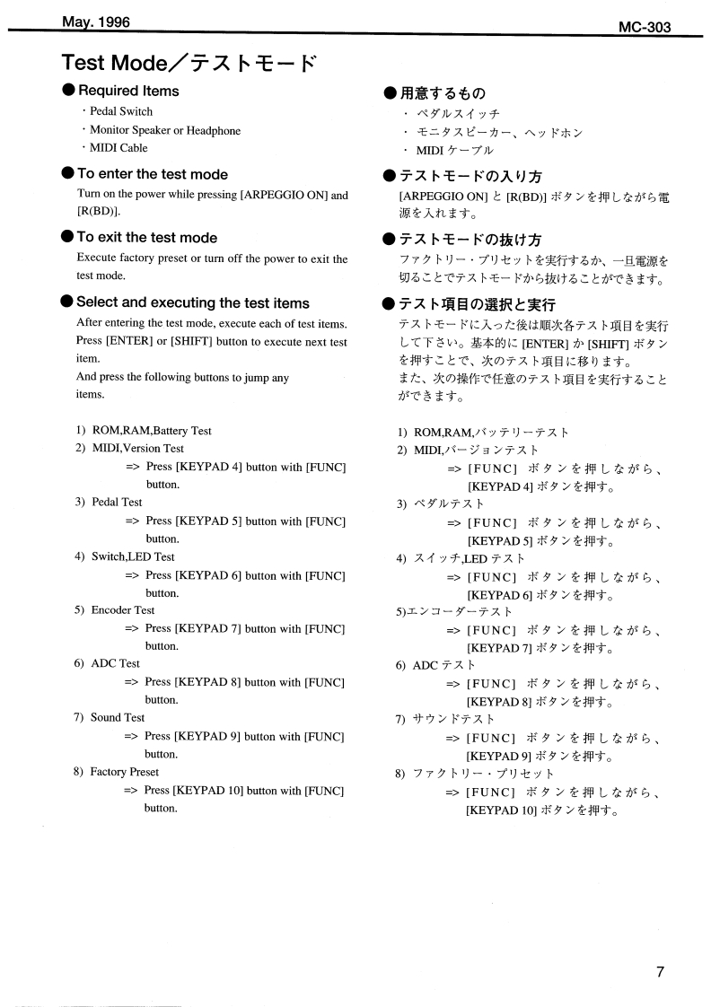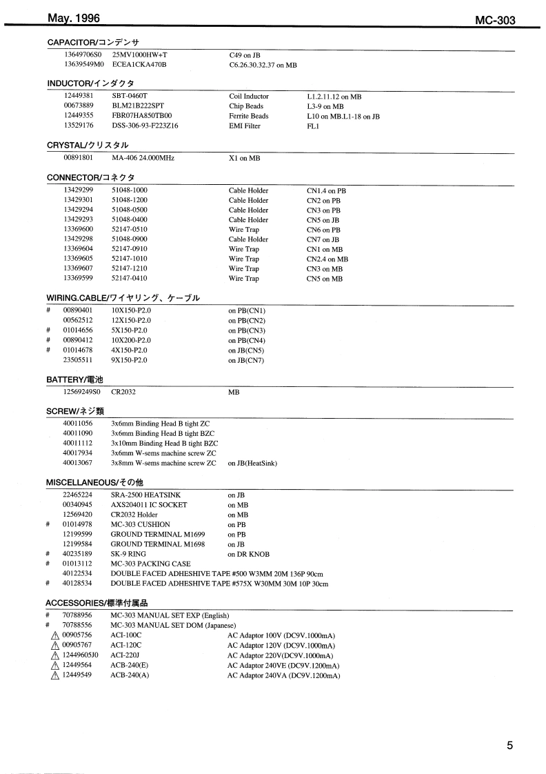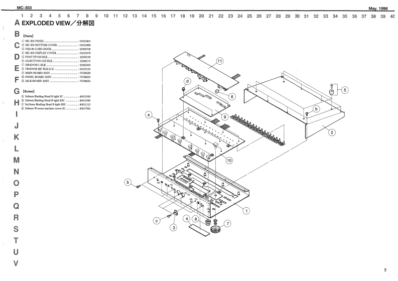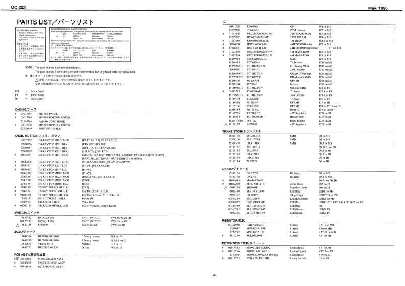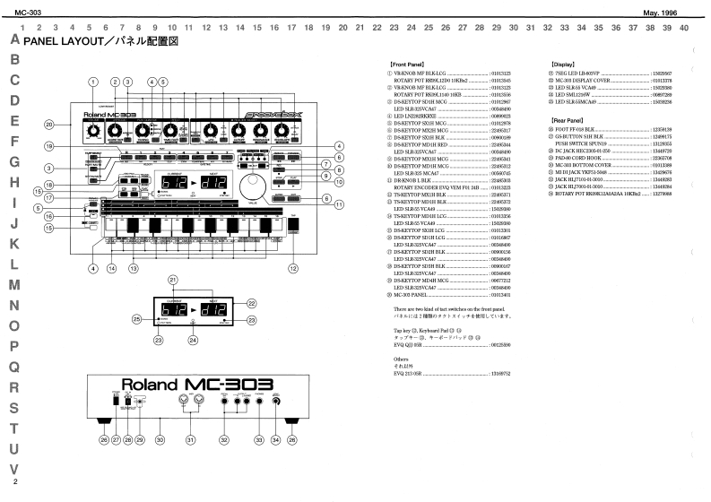 MC-303May.1996C-马▣3SERVICE NOTESSPECIFICATIONS/仕樣First Edition●TONE GENERATORgroaveboxIssued by RJAAINTOASETS.●EDUENCERTABLE OF CONTENTS目次PageSPECFICATIONB仕一WR ATIONPATTORNELOCATION OF CONTROLS单4配置国EXPLODED VIEW骨M区..3PARTS UST一y刂其FATTERN BET_BLOCK DIAGRAM7口3分国0M8南-10oi400TEST MODE于又卡t=下7-12FACTOAY PRESET18●CONNECTORS.CHECK UP VERION AND NATTERY VOLTAGE代一分36,罗)-量庄0m圆13BULK DUMP67y:寸14-15CIRCUIT BOARD (MN!多板M补CIRCUIT DIAGRAM IMAN国毫2MA017CIRCUIT BOARD IPANE且L)琴G同PANEL.CUCUIT DIAGRAM (PANELNEL..........CIACUT BOARD IJACK料香析回C20CRCUT DIAGRAN ACKI区mC21CHANGE INFORNATON蜜更情智,22DTm琴●KEYB0 RD PAD1裙举●DIBPLAY于9w0n●POWER SUPPLYAC Acapo dhc m●CR9 ENT DR4WSaunA●OMEN8et格●wT1GHT5●CCESSORE5ML5e”EMANLAL SET DOMHEVE24C4AC4a网4124454●0PTOw8FP9p-24划■Roland17059847Cc军ge1yA起位eWPrinted in Japan AF00 [DP-P)1