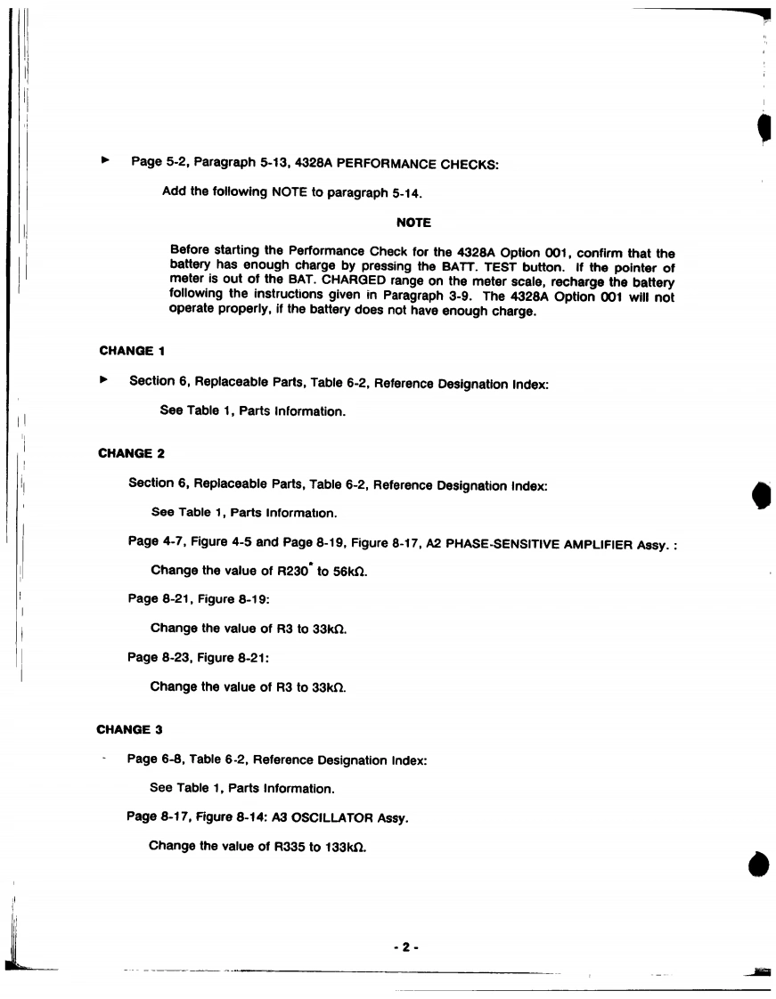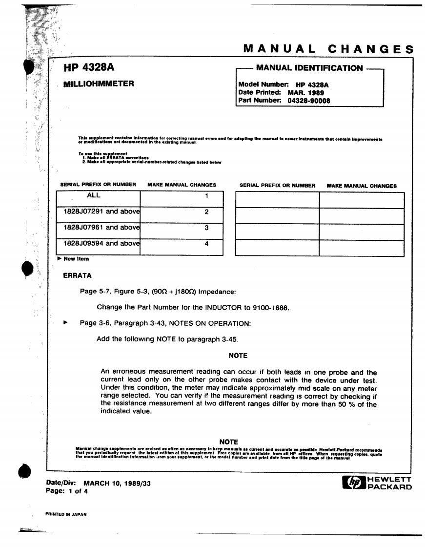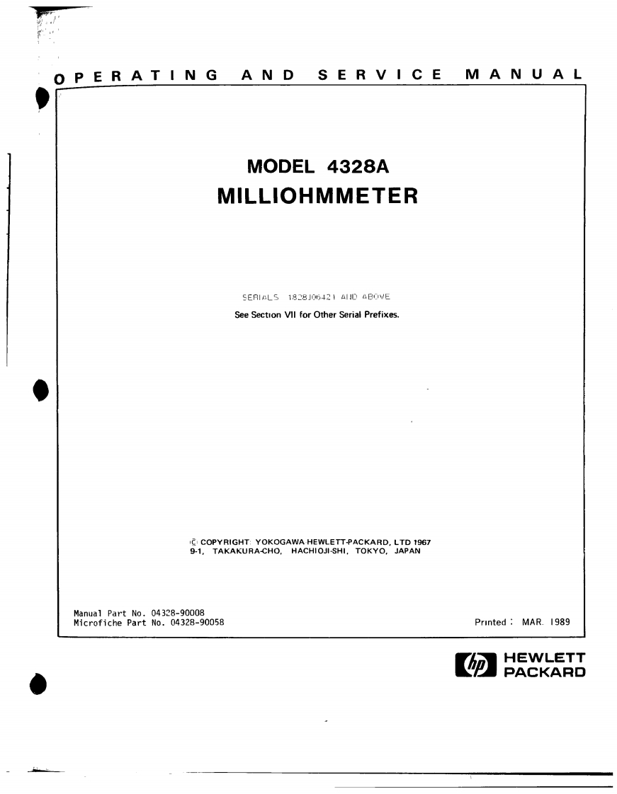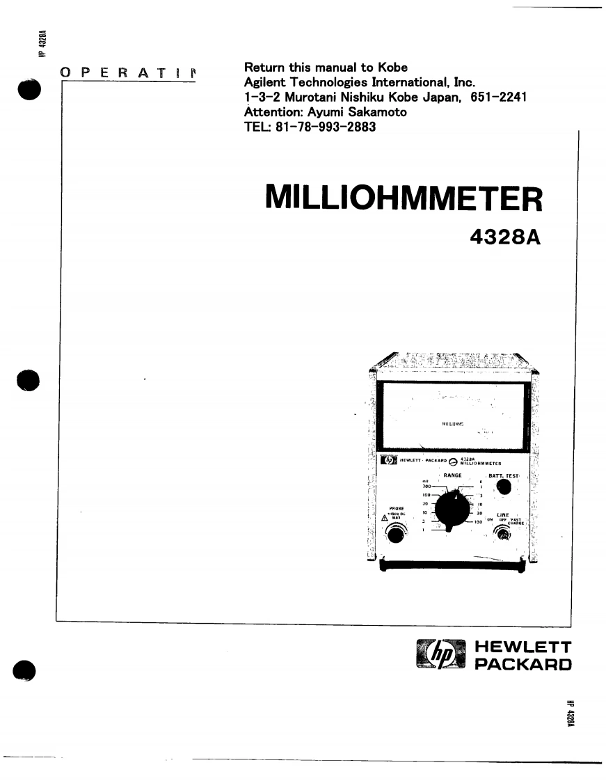 ErrataTitle Document Type:4328A Milliohmmeter Operating and Service ManualManual Part Number:04328-90008Revision Date:March 1989HP References in this ManualThis manual may contain references to HP or Hewlett-Packard.Please note that Hewlett-Packard's former test and measurement,semiconductor products and chemical analysisbusinesses are now part of Agilent Technologies.We have made no changes to thismanual copy.The HP XXXX referred to in this document is now the Agilent XXXXFor example,model number HP8648A is now model number Agilent 8648A.About this ManualWe've added this manual to the Agilent website in an effort to help you support yourproduct.This manual provides the best information we could find.It may be incompleteor contain dated information,and the scan quality may not be ideal.If we find a bettercopy in the future,we will add it to the Agilent website.Support for Your ProductAgilent no longer sells or supports this product.You will find any other availableproduct information on the Agilent Test Measurement website:www.tm.agilent.comSearch for the model number of this product,and the resulting product page will guideyou to any available information.Our service centers may be able to perform calibrationif no repair parts are needed,but no other support from Agilent is available.Agilent Technologies