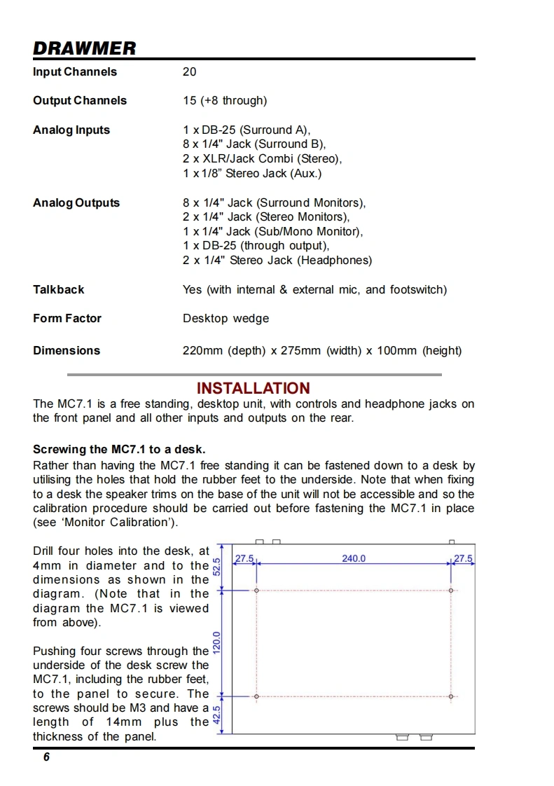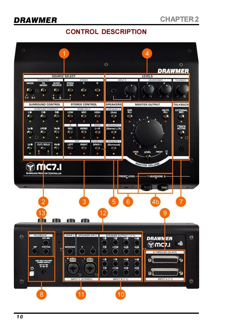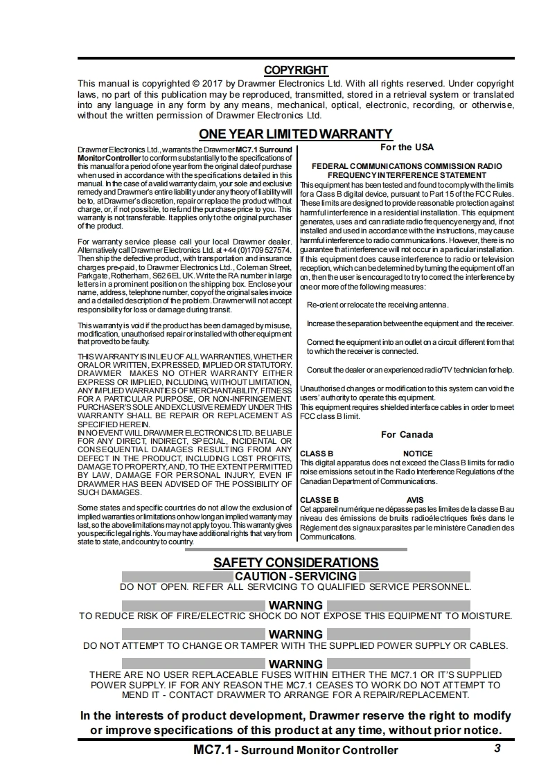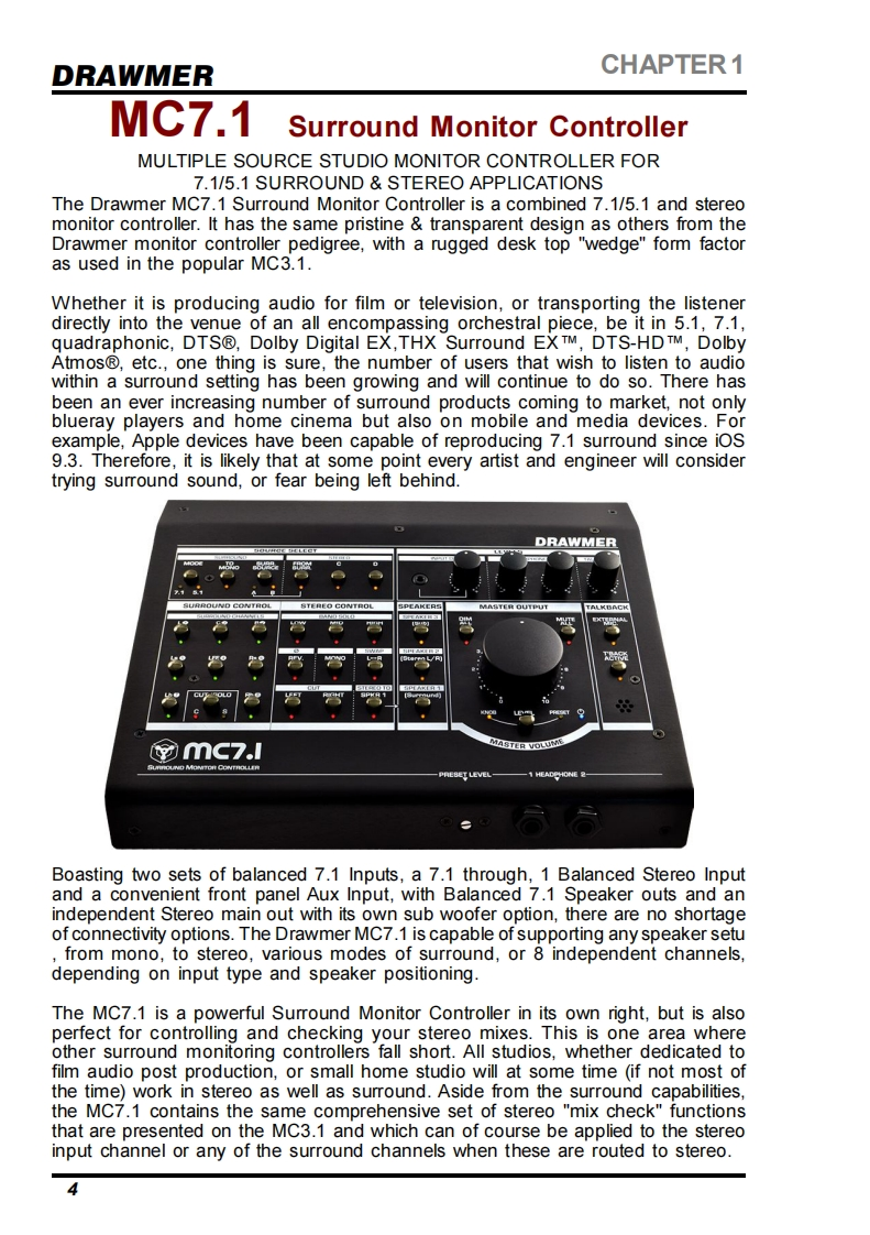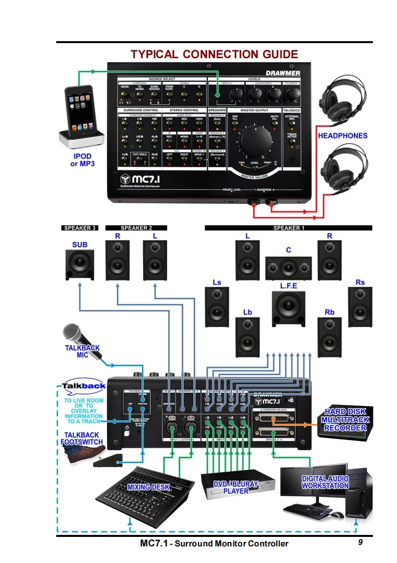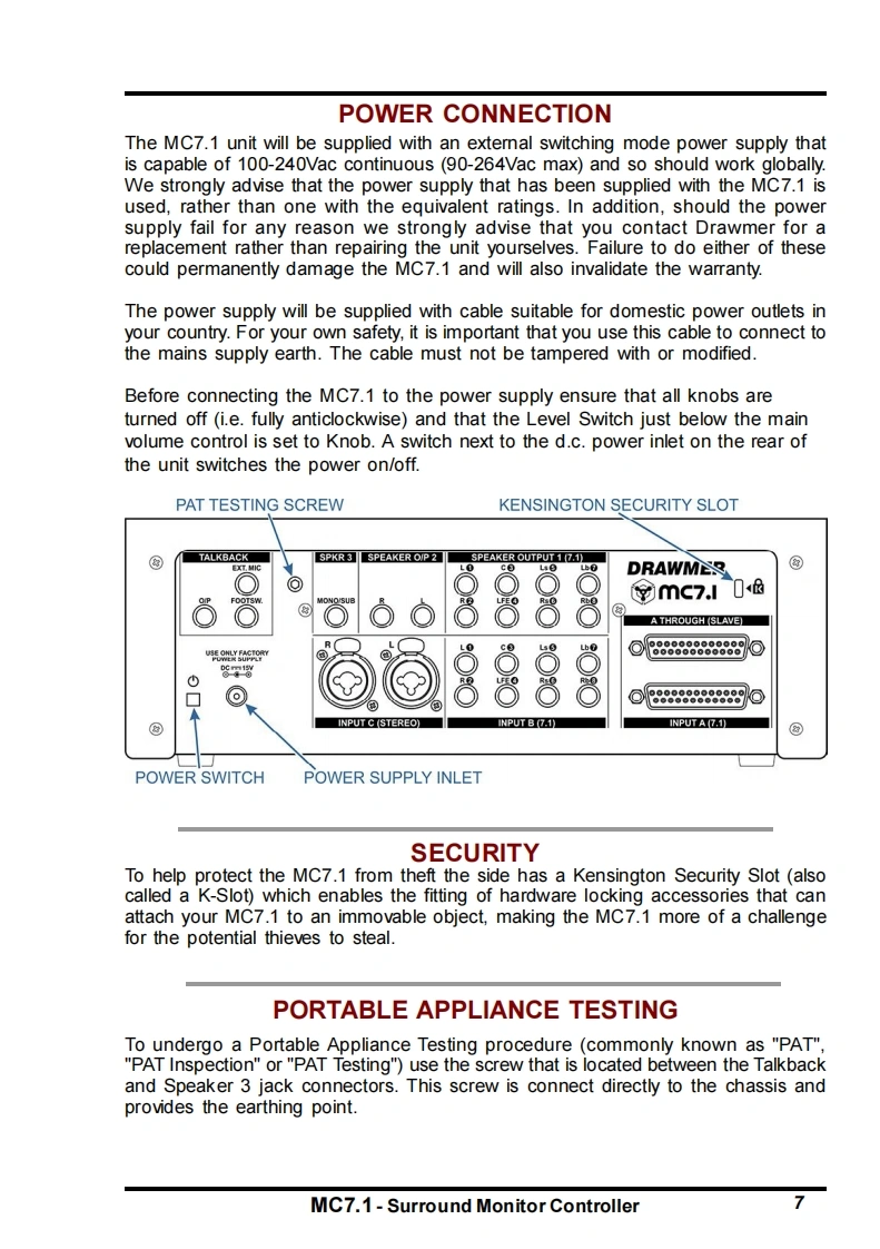 DRAWMERmc7.ISURROUND MONITOR CONTROLLERCONTENTSWarranty。。。3Safety ConsiderationRadio Frequencies Statement33Chapter 1-IntroductionIntroduction4InstallationPower Connection...67Security....····7Portable Appliance Testing7Audio Connection ...8Typical Connection Guide.....9Chapter 2-Control DescriptionContol Description Intro.....10Monitor Calibration.........9Mix Checking Tips23Chapter 3-General InformationIf a fault develops.....·············27Contacting Drawmer ........27