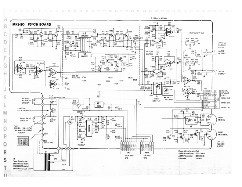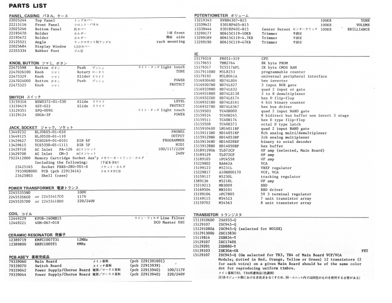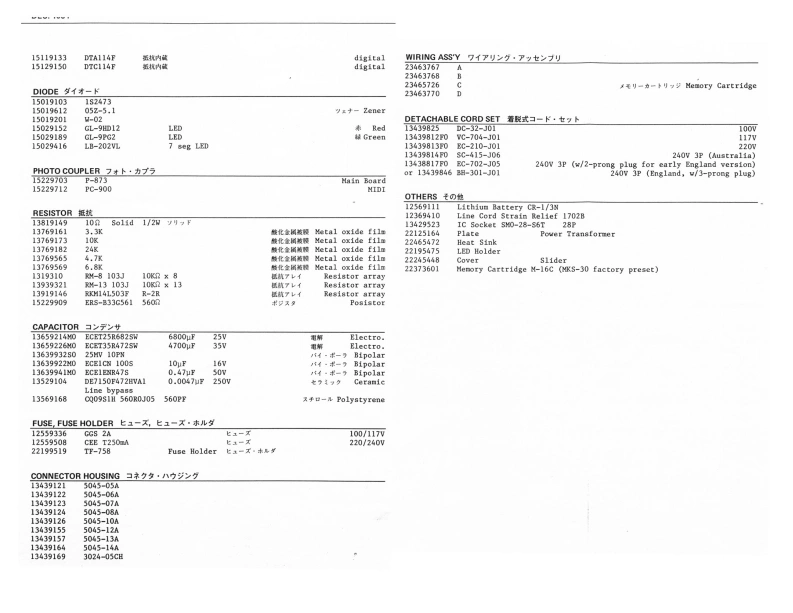 IKKS-③SERVICE NOTESFirst EditionSPECIFICATIONSMEMORY CAPACITY........Internal:64 ponchesDIMENSIONS.....480wK41000)M8图0Hlmm(18Kbyte RAM)1Twx16-1"D1x3-7/16Hl2202534Extena:6队F4thesWEIGHT.....62g/13b.1102(M-16C memnoACCESSORIES....Connection Cord ILP.25ry cartridpe)5 pin DIN CordEDITABLE PARAMETERS..326 pin DIN CordOUTPUT....................:5KDetachabale Cord SetHeadphones:BMemory Cartridge (M-16c)POWER CONSUMPTION.....35WE1102241为50135乐44LAYnd8151urG061131042134422915G0t5212240200012皆t1590444431342227n224751202291244RolandCck国灯零卡P移2UTD23421D Socket 57anGf>k,多en为学卡TGC66001-1111134265