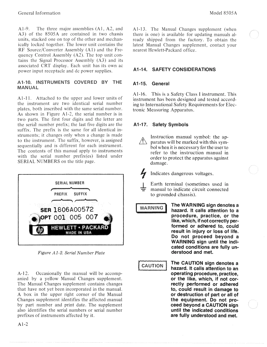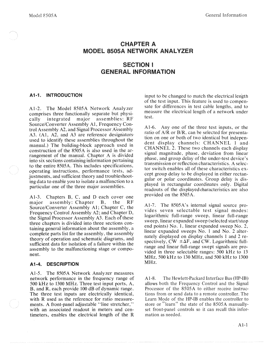 HEWLETTpPACKARDOPERATING AND SERVICE MANUAL8505ANETWORK ANALYZER500 kHz to 1.3 GHzSERIAL NUMBERSThis manual applies directly to HP Model 8505ANetwork Analyzers with serial number prefix1930A.For instruments with serial number lowerthan 1930A,refer to the Manual Changes sectionof each chapter.Copyright©HEWLETT-PACKARD COMPANY19761400 FOUNTAIN GROVE PARKWAY,SANTA ROSA,CALIFORNIA 95404 U.S.A.MANUAL PART NO.08505-90072Microfiche Part No.08505 90073Printed:AUGUST 1979