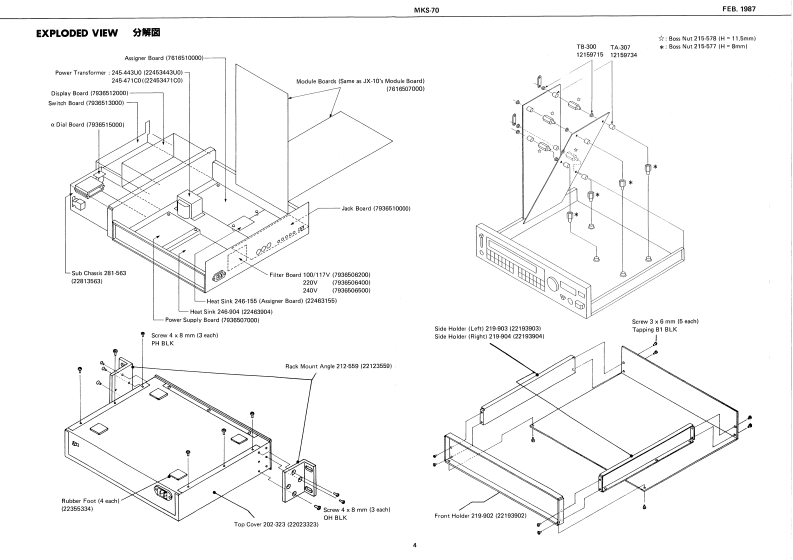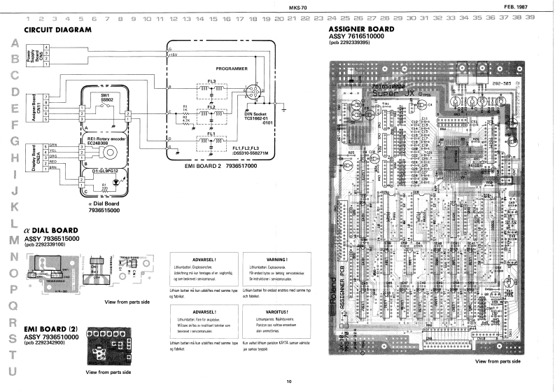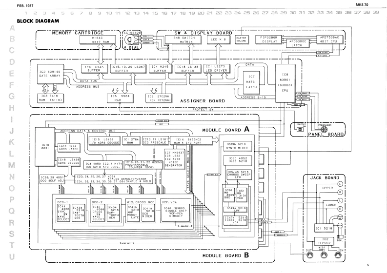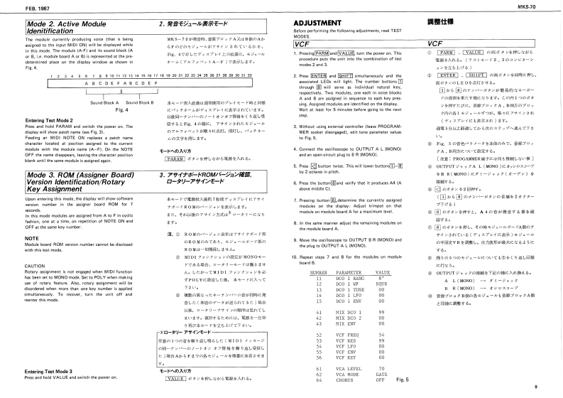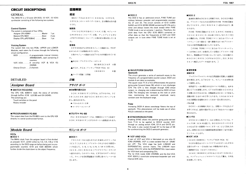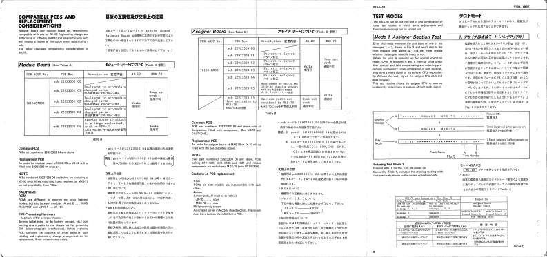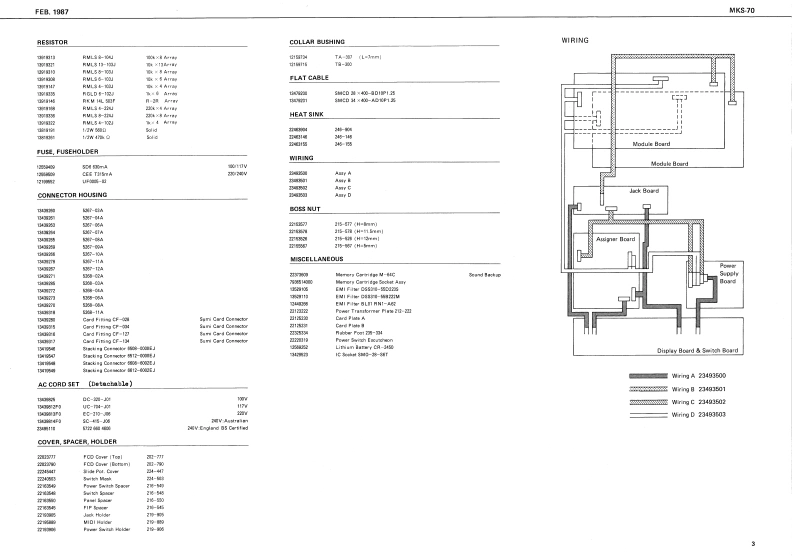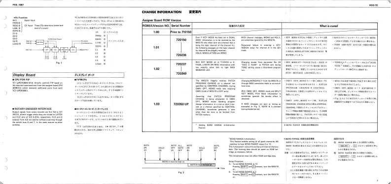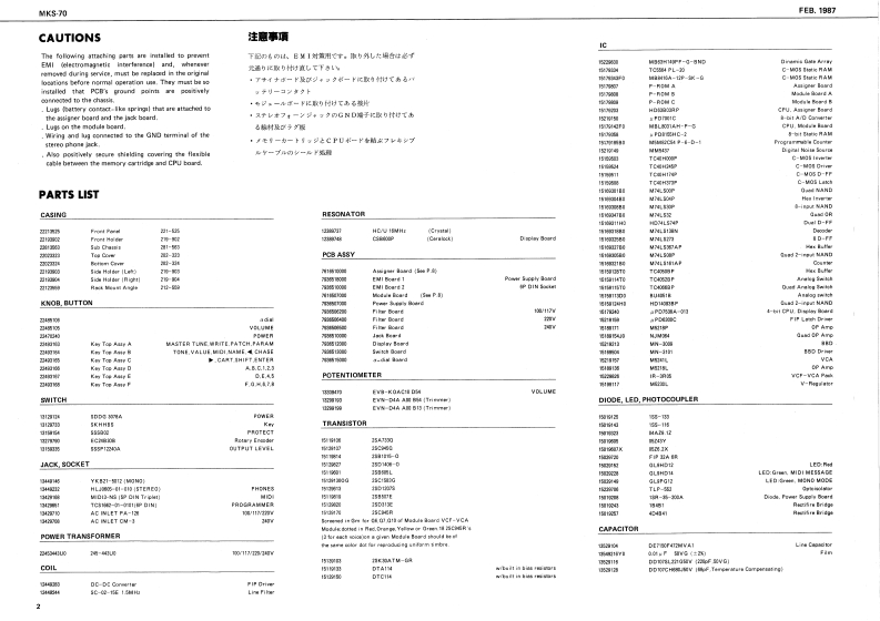 FEB.1987MKS-70MKKS-7回SERVICE NOTESFirst Edition-AC InietBattor Cover 202-224SPECIFICATIONSPA,26t0117229153471072021324◆M-32V114200国0mc程4DWME08D助■阁IHmmlmrral Marrory:641e7准。1634x37/16(Namory Cararidge):67.g0.1aERoland29辆6W特0☐Cannectian Cord x】Intarral Mimery 50MiDI Cal x?IMamery Cartricige 50⊙9o4■+08n厘w5,IK2Edt MoM=+8n8Owrer's MarualL=10时网元452Gaide Dook'WIDPPANALLEL A L 33K企DIN Socket GP.lck onoletr集8 L 33cnMIDI3-NSKa215012899122404H 33KI13421西11809148185,gt.5VBK0Ct0064(130094J0041502970221625(1502922图TABLE OF CONTENTS目欢PageFCD Cowe Tos 202-T7723522023J77CAUTIONS注意事项2CD Coeer Bunan 203-79002200PARTS LIST1-y天Tap Cover-23202-123一LED gEXPLODED VIEW分架图409012BLOCK DIAGRAM口y2圆5CIRCUIT DESCRIPTION回路解脱67CHANGE INFORMATION变更案内7COMPATIBLE PCBS基板②互换性AND REPLACEMENT CONSIDERATIONS及水交换上D注意TEST MODE子又卜毛一N89ADJUSTMENT调整仕横98M+3D0034a DIAL BOARD下儿7尹竺中儿基板101117212EMI BOARD (2)EM基板210224024ASSIGNER BOARD下炒十基板101122122natary Encode-DIN Socket SPCARTRIDGE BOARD力一y沙基板12FC71R78TG5166设1011132770134251)MODULE BOARD无节1一儿基板12,13自fiak Krobg2时8wSWITCH BOARD入y于基板141542113750154DISPLAY BOARD于(又基板1415HASTER TUIE,WRITE.PATCH.FAHAM1JACK BOARD艺女y7基板16224181POWER SUPPLY BOARD量源基板17224为412242352FILTER BOARD71儿夕一基板17224)网t日297aEMI BOARD (1)EM基板I川GLOHD12 (CHASE,CART.SHIFT.ENTER)11502015217IC DATA1Cデ一18MIDIMIDI19-22RolandPinted in Japon BB2 LH 1