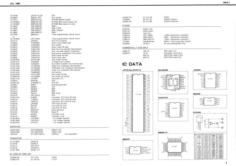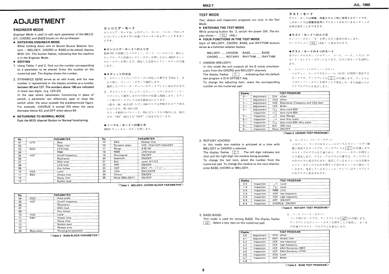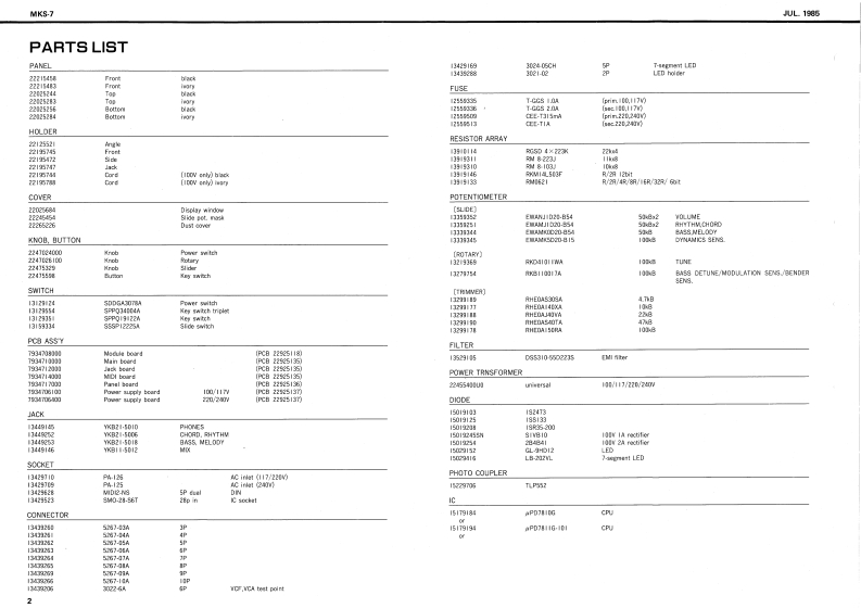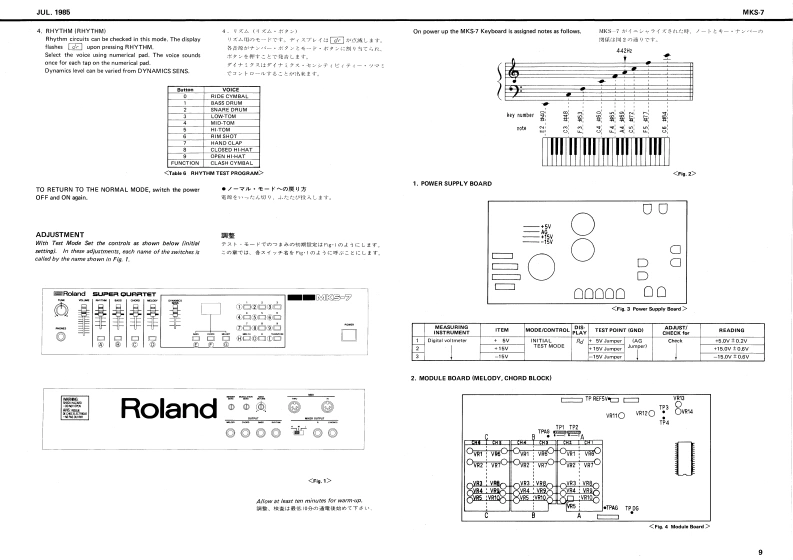 JUL 1985MKS 7MKS-7SERVICE NOTESDISASSEMBLYTOP PANEL REMOVAL SCREWS:0..adFirst EditionSPECIFICATIONSMEOOY BLOCKMASTER TUNE本5c市伊顶出妇0OUTPUTNULT1POWER CONSUMPTION 2DIMENSIONSAw8品22533SUSTAI LEVELWEIGHTDELAY TIMEIVORY4ACCESSORIESBASS BLOCKI5出240作Connection Dand (2.nlOPTIONS312os能e别TAIN LEVEL福WL型2网FRONT SIDELEDLEVL品14TO PANE是oTPL签n24891370eANGLE 2122104012247004000纳的004幻8411打2174ACK¥K#1601013443145m.5+a03541FOT ENAKEDO 18 11333804k912aREAR SIDE0T.R21100A122925450KGT02M5(1248C¥c1T绕2RolandALORFR FOOT 93640区YKD110121144314CKY121S0351344921a0×K821801011]4402535NL51222541310024RolandPrinted in Japen1