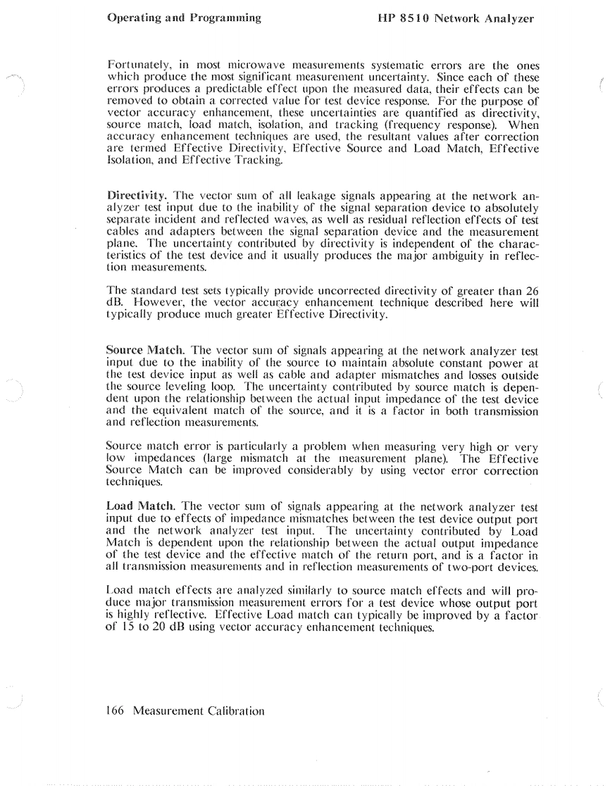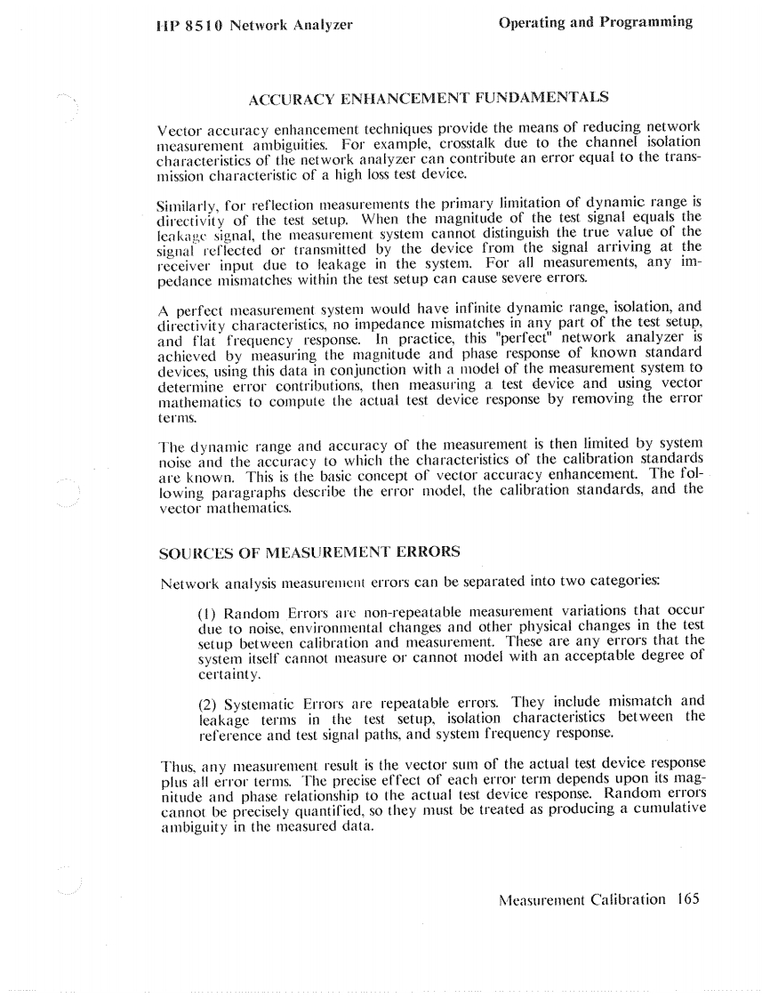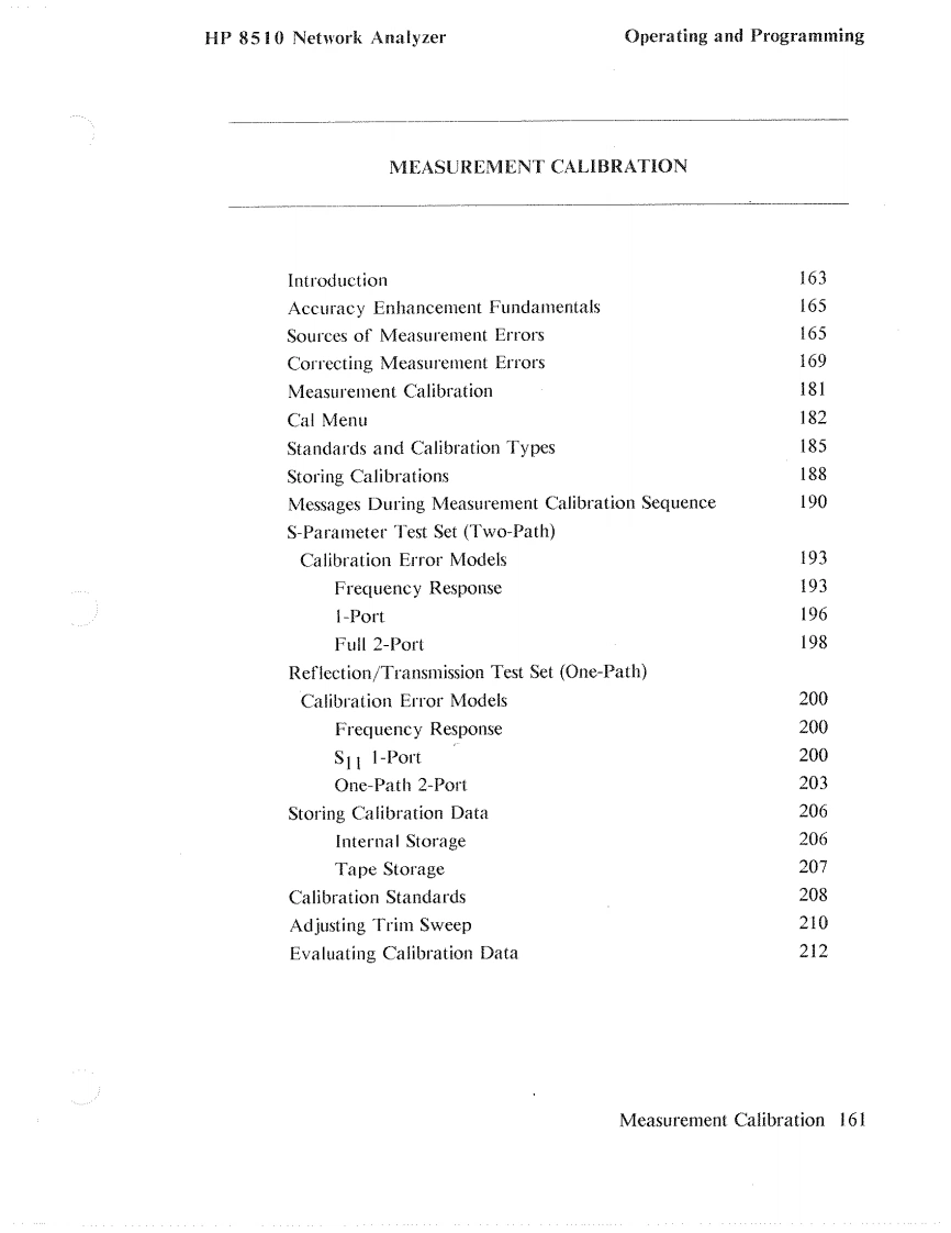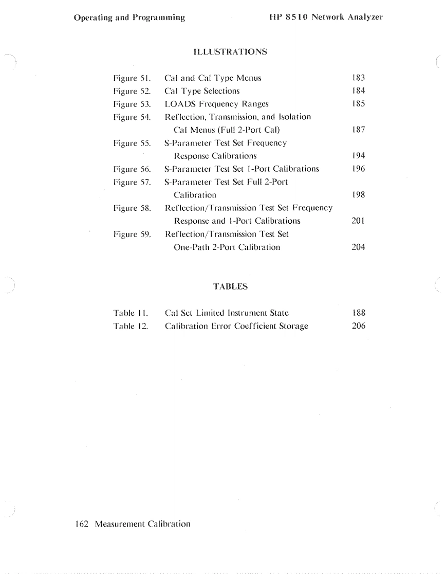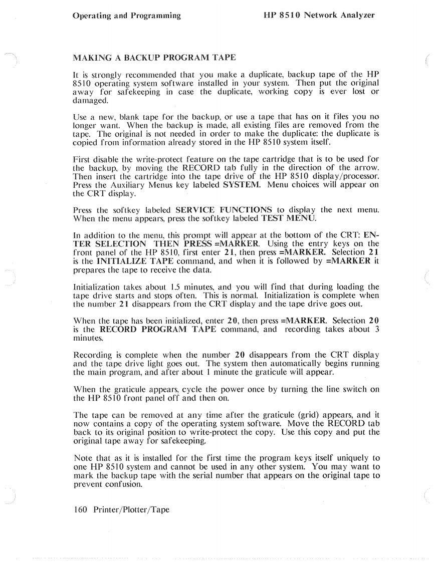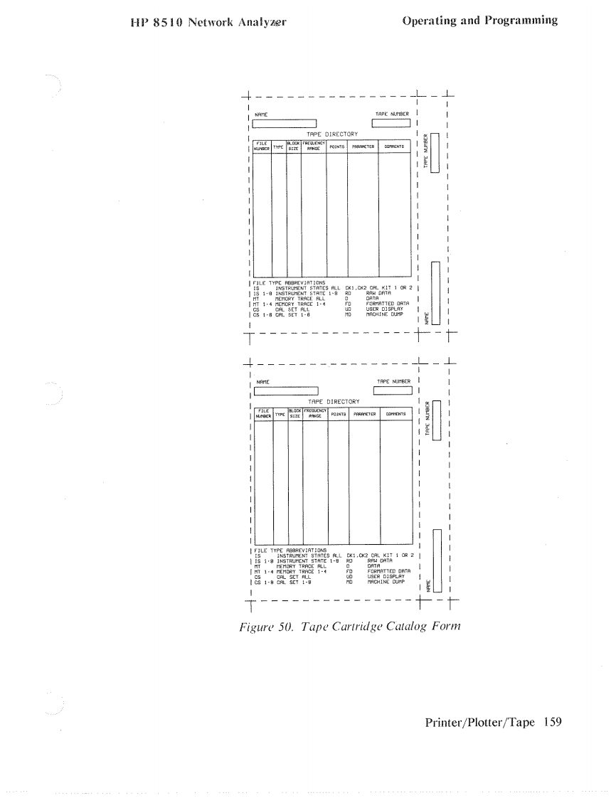 HP 8510 Network AnalyzerOperating and ProgrammingPREVIOUS INSTRUMENT STATESTo bring the Data Type Menu (Figure 49)onto the CRT display,first press theTAPE key in the AUXILIARY MENUS block.This brings the Tape Menu ontothe CRT display.Next press the softkey corresponding to the operation you wishto perform:STORE,LOAD,or DELETE.This brings the Data Type Menu ontothe CRT.Pressing UNDELETE before any other tape operations occur restoresthe last file deleted.Press INSTRUMENT STATE 1-8 to store a single instrument state previouslysaved in HP 8510 internal memory using the sequence:STORE,INSTRUMENTSTATE1-8,then1,2,3,4,5,6,7,or8.Press INSTRUMENT STATES ALL to save all instrument states I through 8 ona single tape file.In the same way you can select a single memory trace previously stored in HP8510 internal memory using the DISPLAY,DATA MEMORY sequence,oryou can record all four memory traces.Press CAL SET 1-8 to select a single calibration error coefficient set for record-ing,or CAL SETS ALL to select recording of all cal sets.Press CAL KIT 1-2presents a menu to allow selection of either Cal Kit I or Cal Kit 2.The softkeys DATA:RAW,DATA,and FORMATTED refer to measurementdata for the currently selected channel at various stages in the digital signal pro-cessing steps.RAW refers to ratioed and averaged data,DATA refers to thedata in the corrected data array,and FORMATTED refers to data in the for-matted array.See Figure 4,Post-Detection Digital Signal ProcessingUSER DISPLAY allows recording of any graphics or text written into the userCRT memory via the HP-IB by an external controller.Details for this operationare contained in the HP 8510 Introduction to Programming manual.MACHINE DUMP records a large file consisting of the complete instrumentstate,including contents of the various memories for both channels.After selection of the data type,the File Menu appears.Select any file I through8 and the recording process begins.Printer/Plotter/Tape 157