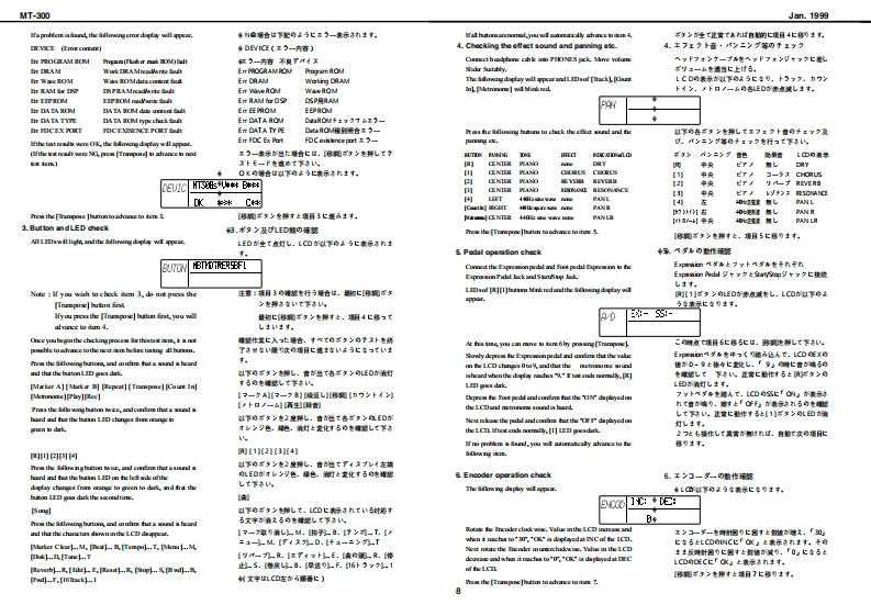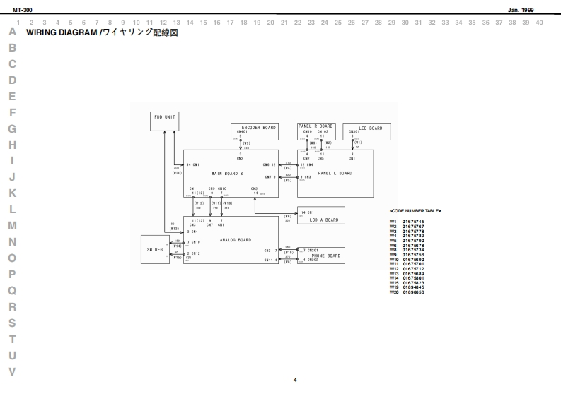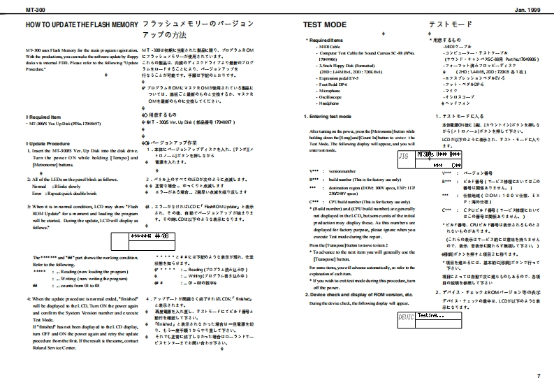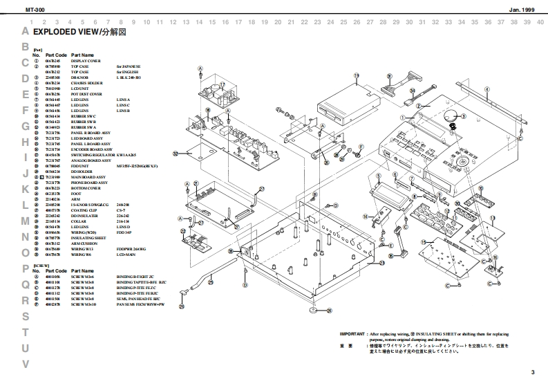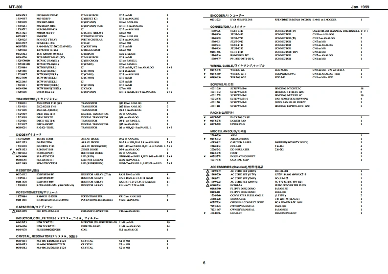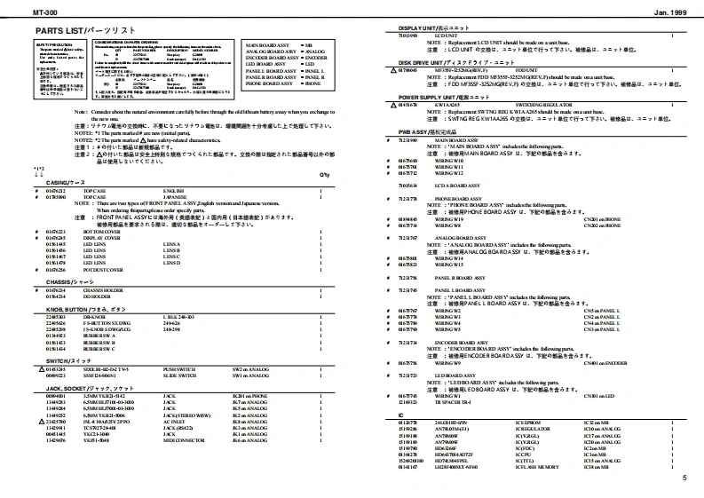 MT300Jan.1999MT300SERVICE NOTESPANEL LAYOUT/礻儿配置网First EditionRONT VIEW/正E面aMUSIC PLAYERIssued by RJATABLE OF CONTENTS目次PagePANEL LAYOUT未系配园:④PANEL LAYOUTPARTS LIST成配园代一7号天卜SPECFICATIONS主全性根一一ELODEOMEW分标器WIRING DIAGRAM74女号之香炼PARTS USTHOW TOUPOATE THE FLASH MEMORY73y9工毛号一身床一9■之7yブ的方速,TEST MOCE天k毛一PBLOCKOIGRAM0y夕层.0地色CROUT BOARD OMAIN核圆转CROUT OIAGRAM OMAN)国隐8WO-CROUT BOARD (ANALOG)板罗LCG)CROUT DIAGRAM (ANALOG)国德NCG)CROUT BOARD (PANEL)城核要PAE5⑦02传0562CROUTOAGRAM PANEL)国隐要0PAE5-3REAR VIEW/青面回甸2Podond VG666PANEL LAYOUT PARTS LIST/バ礻儿配置☒Y一y又卜Na Part CodeNa Part CadePart NareLEDLES高亡一进尚马台①0119ED更C玉限-MWT1001室186LENSB7103w000144gRBaWA015345DESPLAYCOER0013045FDOUTM-MG,司P▣力力甲只G的立色RL图RWC风aWa5115候0gL目L天18-0001室1LEDB线UENSD1C4W12粉经6F SAUTTON1494309型复E琳TC5w14-0W1018245SDOLH3D-2TV-5D01室145LEDLRLESA01144933MCKkM厘710--010CK91934MCKt014OT口T CONER3006145MCKYKC1-2040Copyright 1999 by ROLAND CORPORATIONIS-KNOOS D14114及x收II0联a0010145IEMDVSR0I1D0线口30M25149的上11店D6SVM T2H06mdo ROLAND CDRPCRATIONN.001多17本春0一想品《儿生坐想老期下按写:箱事华二上飞禁1事,1Roland17059953Primed in Japan AAO0D月1