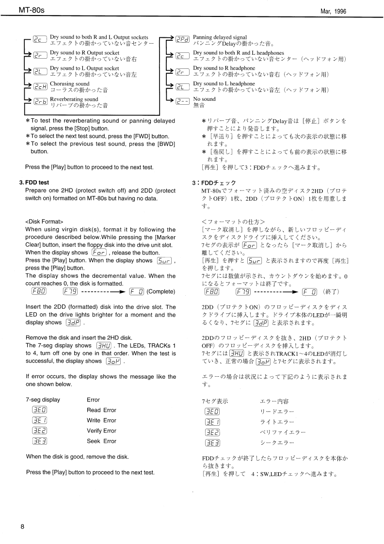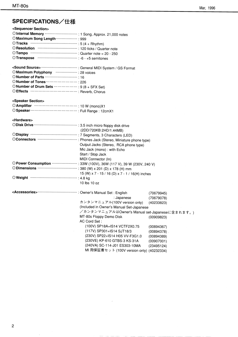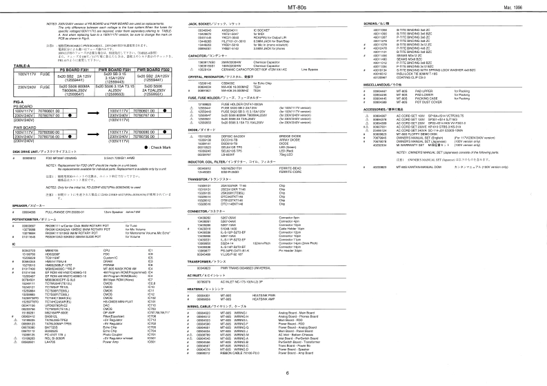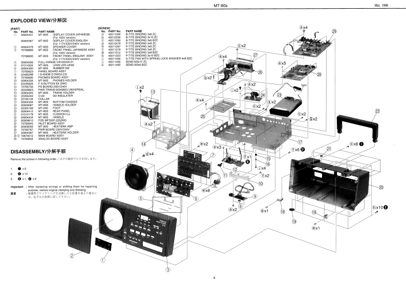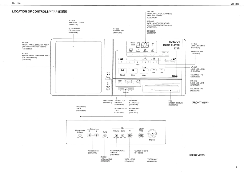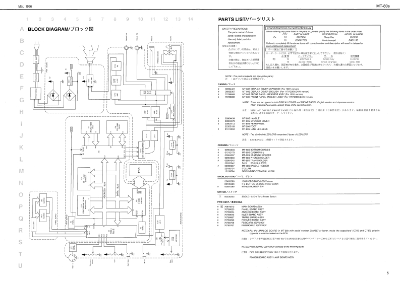 Mar,1996MT-80sMT 80sSERVICE NOTESFirst EditionMUSIC PLAYERIssued by RJATABLE OF CONTENTS目次PageSPECIFICATIONS.............................仕樣……2LOCATION OF CONTROLS/バ儿配置☒………3EXPLODED VIEW…分解☒…4DISASSEMBLY分解手順……4BLOCK DIAGRAM·ブ口y夕☒…5PARTS LIST…バ-ツ又卜…5、6TEST MODE…デ又卜E-ド…79REPLACE FDD MF355F-2252MG(PNo.00909812)·FDD MF355F-2252MG(PNo.00909812))交换E2L1T·10ABOUT TEAC FD-235HF-6527(PNo.00563456)·TEAC FD-235HF-6527(PNo.00563456)E2L1T…10MAIN BOARD ASS'Y·MAIN BOARD ASS'Y11、13PANEL BOARD ASS'Y·PANEL BOARD ASS'Y…12、13ANALOG BOARD ASS'Y·ANALOG BOARD ASS'Y.................14~16INLET BOARD ASS'Y.......................INLET BOARD ASS'Y....................14~16TRANS BOARD ASS'Y·TRANS BOARD ASS'Y...................14~16PHONES BOARD ASS'Y·PHONES BOARD ASS'Y…14~16PS BOARD 230V/240V ASS'Y..................PS BOARD 230V/240V ASS'Y.............14~16PWR BOARD 230V/240V ASS'Y................PWR BOARD 230V/240V ASS'Y...........14~16曾Roland888¥MUSIC PLAYERMT 80s品。。”W9+2Track8ResetStop恤G砂?℃皇Roland17059835Copyright c 1996 by ROLAND CORPORATIONPrinted in Japan(AFAO)(CR)1