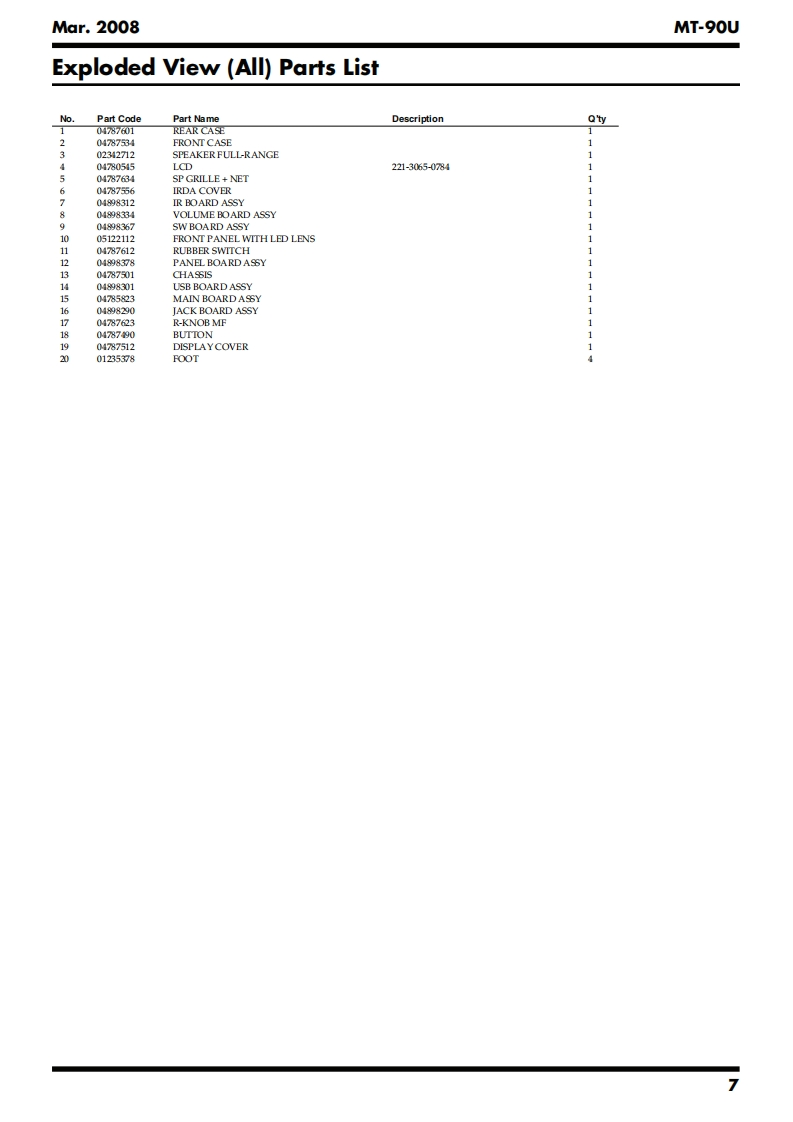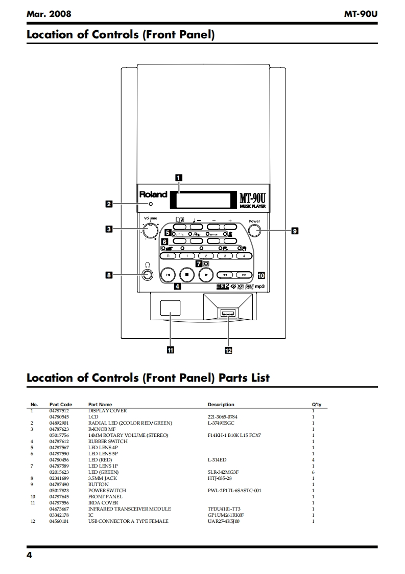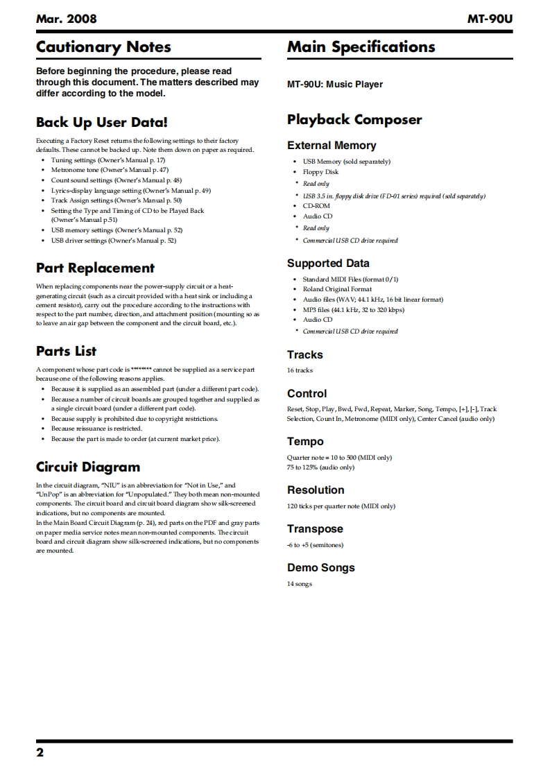 Mar.2008MT-90UMUSIC PLAYERSERVICE NOTESMT-900Issued by RJATable of ContentsCautionary Notes..2TestMain Specifications....2Circuit Board (Main Board)22Location of Controls(Front Panel)....4Circuit Diagram (Main Board:1/4)..24Location of Controls(Front Panel)Parts List..........4Circuit Diagram (Main Board:2/4)......26Location of Controls (Rear Panel)............5.Circuit Diagram (Main Board:3/4)....2Location of Controls(Rear Panel)Parts List...............5Circuit Diagram (Main Board:4/4).....................28Exploded View(Al)…6Circuit Board (Panel Board)..30Exploded View(All)Parts List.Circuit Diagram(Panel Board)..........32Exploded View (1)......8Circuit Board (Jack,Volume,IR,USB,Power SWExploded View(1)Parts List.......9Board)34Exploded View (2).............10Circuit Diagram (Jack Board:1/3).....36Exploded View (2)Parts List..10Circuit Diagram (ack Board:2/3).38Important Notes on Assembly....11Circuit Diagram (ack Board:3/3)........4.0Block Diagram/Wiring Diagram..14Circuit Diagram (Volume Board)..42Parts List..16Circuit Diagram (IR Board).............44Verifying the Version Number....18Circuit Diagram(USB Board).....44Performing a Factory Reset..18Circuit Diagram (Power SW Board).............45Updating the System .......18RolandMT如0■0⊙⊙2mp3Copyright 2008 Roland CorporationAll rights reserved.No part of this publication may be reproduced in any form without the written permissionof Roland Cororation.Roland17058572E0Printed in Japan(0285)(CC-KWS)