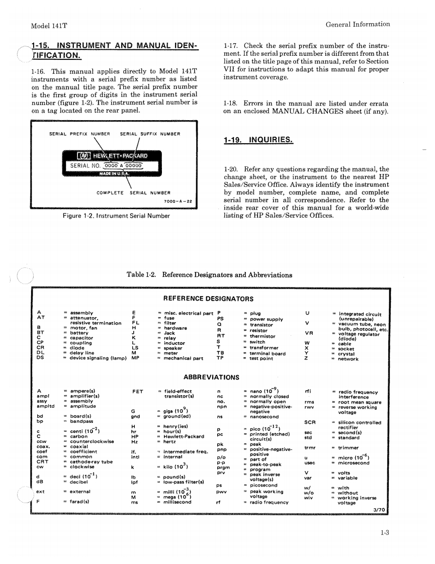 hpOPERATING AND SERVICE MANUALMODEL 141TDISPLAY SECTION(Including Option 009)SERIAL NUMBERSThis manual applies directly to instruments with serialnumbers prefixed 1615A.With changes described in Section.VII,this manualalso applies to instruments with serial numbers pre-fixed 950-through 1502A.For additional information about serial numbers,seeINSTRUMENT AND MANUAL IDENTIFICATION inSection I.HEWLETT-PACKARD COMPANY/COLORADO SPRINGS DIVISION1900 GARDEN OF THE GODS ROAD,COLORADO SPRINGS,COLORADO,U.S.A.Manual Part Number 00141-90914Microfiche Part Number 00141-90814PRINTED:JUNE 1976