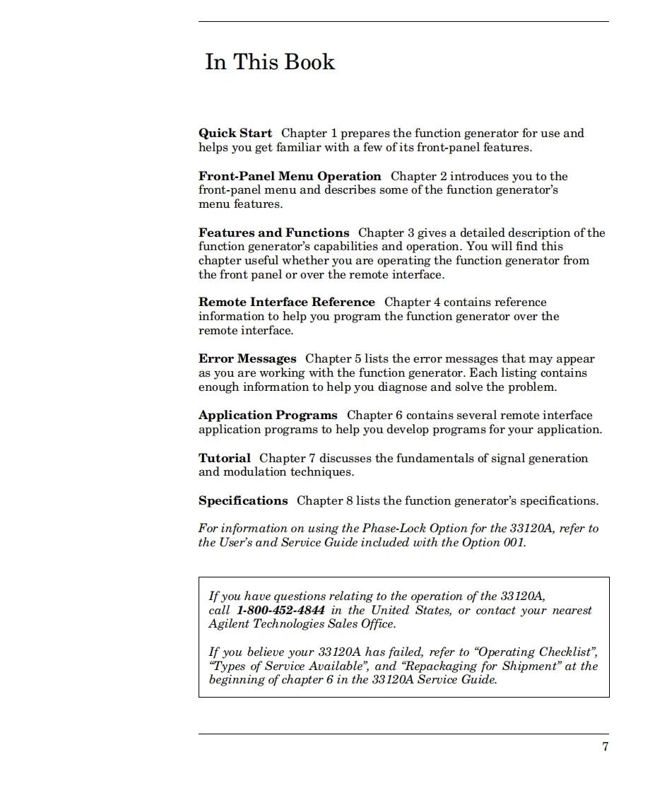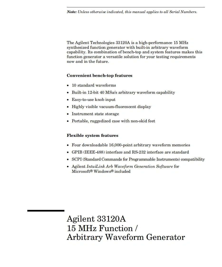 User's GuidePublication Number 33120-90006(order as 33120-90104 manual set)Edition 6,March 2002Copyright Agilent Technologies,Inc.1994-2002For Safety information,Warranties,and Regulatory information,see the pages following the Index.Agilent 33120A15 MHz FunctionArbitrary Waveform Generator