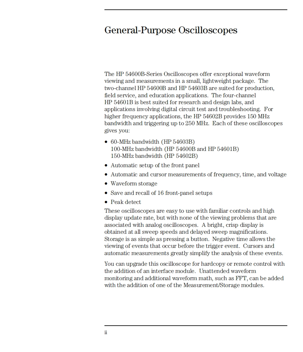 User andService GuidePublication number 54600-97021November 1997 (pdf version April 2002)For Safety Information,Warranties,and Regulatory information,see the pages behind the index.Copyright Hewlett-Packard Company 1992,1997,2002All Rights ReservedHP54600B,HP54601BHP 54602B,and HP 54603BOscilloscopes