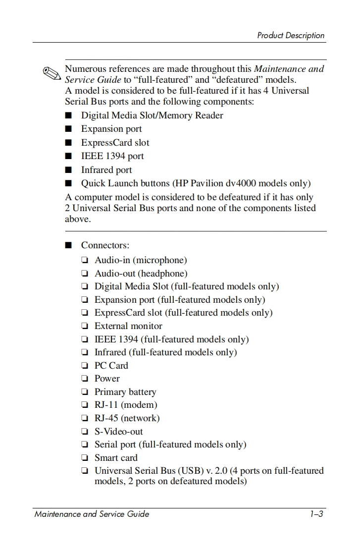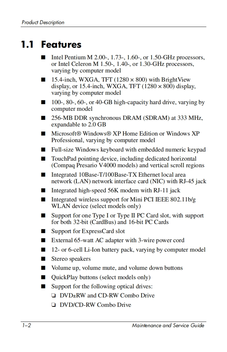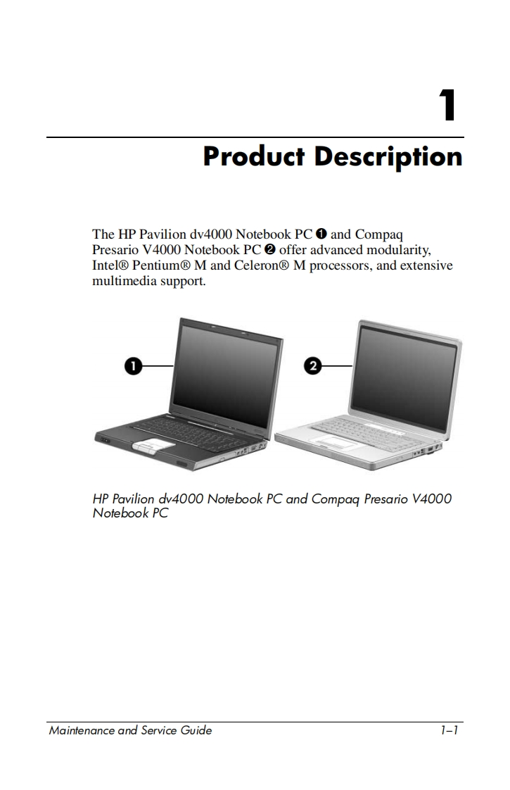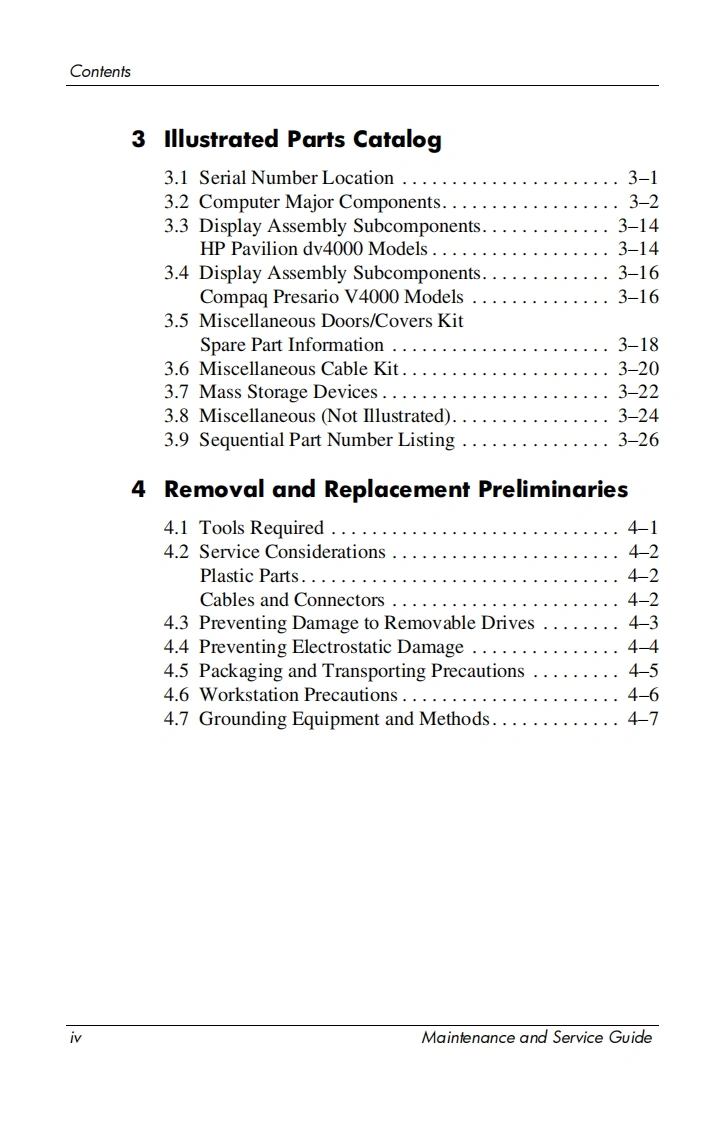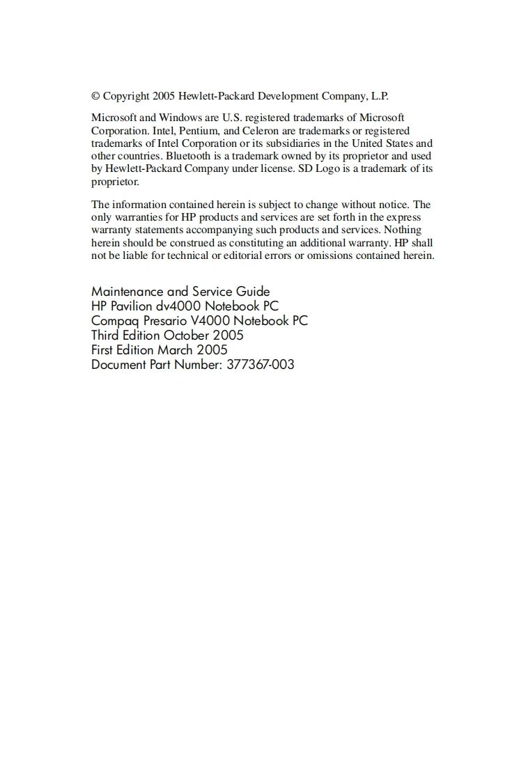 i n v e n tMaintenance and ServiceGuideHP Pavilion dv4000 Notebook PCCompaq Presario V4000 Notebook PCDocument Part Number:377367-003October 2005This guide is a troubleshooting reference used for maintainingand servicing the computer.It provides comprehensiveinformation on identifying computer features,components,andspare parts;troubleshooting computer problems;and performingcomputer disassembly procedures.