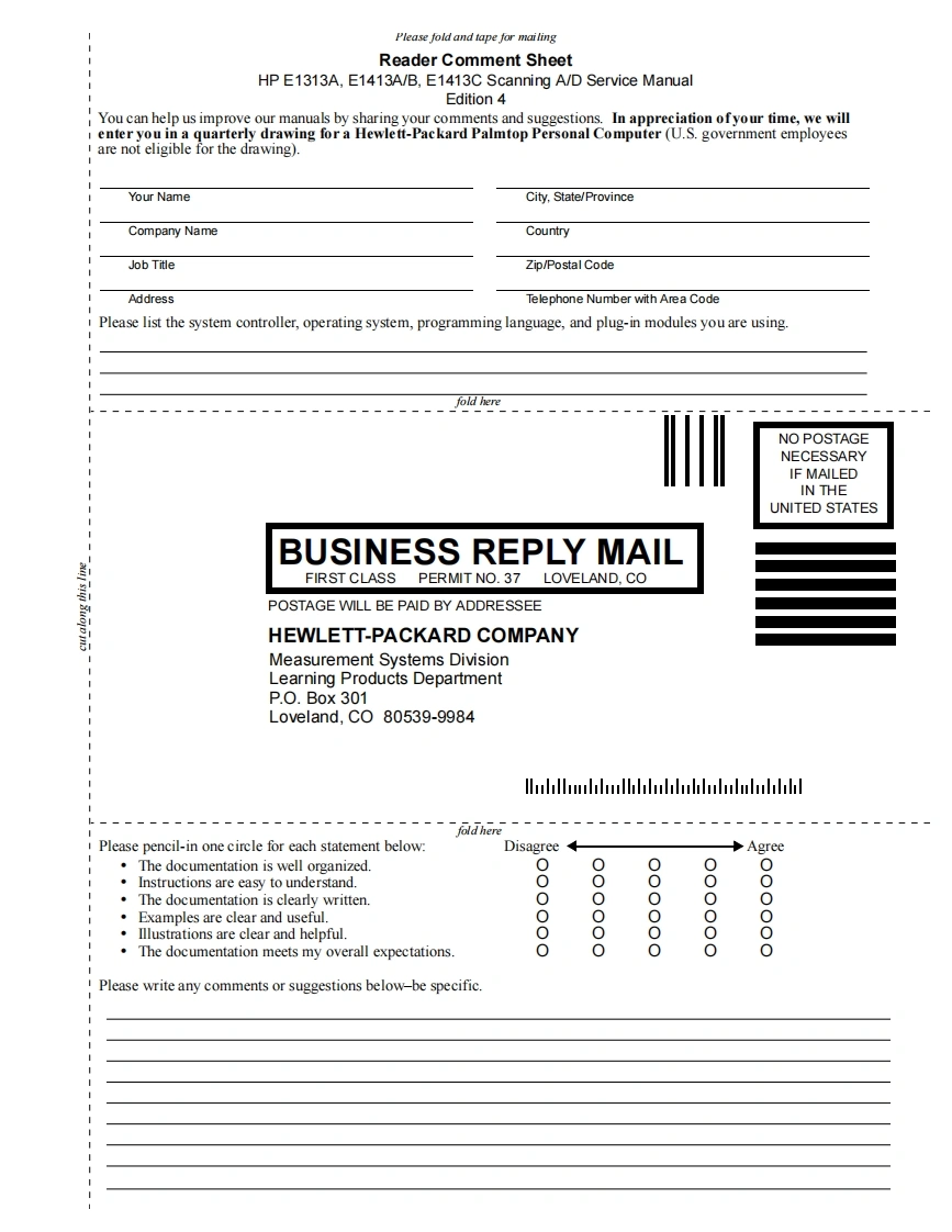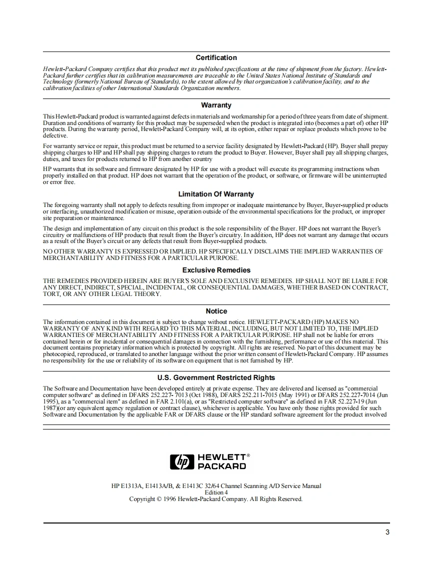 荒看HP 75000 Series B/CbusHPE1313A,E1413A/B,&E1413C)32/64 Channel Scanning A/DService ManualWhere to Find it-Online and Printed Information:System installation (hardware/software)..........VXIbus Configuration Guide*HP VIC (VXI installation software)*Module configuration and wiring.........This ManualSCPI programming..User's&SCPI Programming ManualSCPI example programs..............User's SCPI Programming Manual,DriverDiskSCPI command reference User's&SCPI Programming ManualRegister-Based Programming.....................User's&SCPI Programming ManualVXIplugplay programming..............VXIplug&play Online HelpVXIplug play example programs ..............VXIplugplay Online HelpVXIplugplay function reference.VXIplugeplay Online HelpSoft Front Panel information.....................VXIplugeplay Online HelpVISA language information...HP VISA User's GuideHP VEE programming information.....HP VEE User's Manual*Supplied with HP Command Modules,Embedded Controllers,and VXLink.HEWLETTPACKARDManual Part Number:E1413-90032Printed in U.S.A.E0497