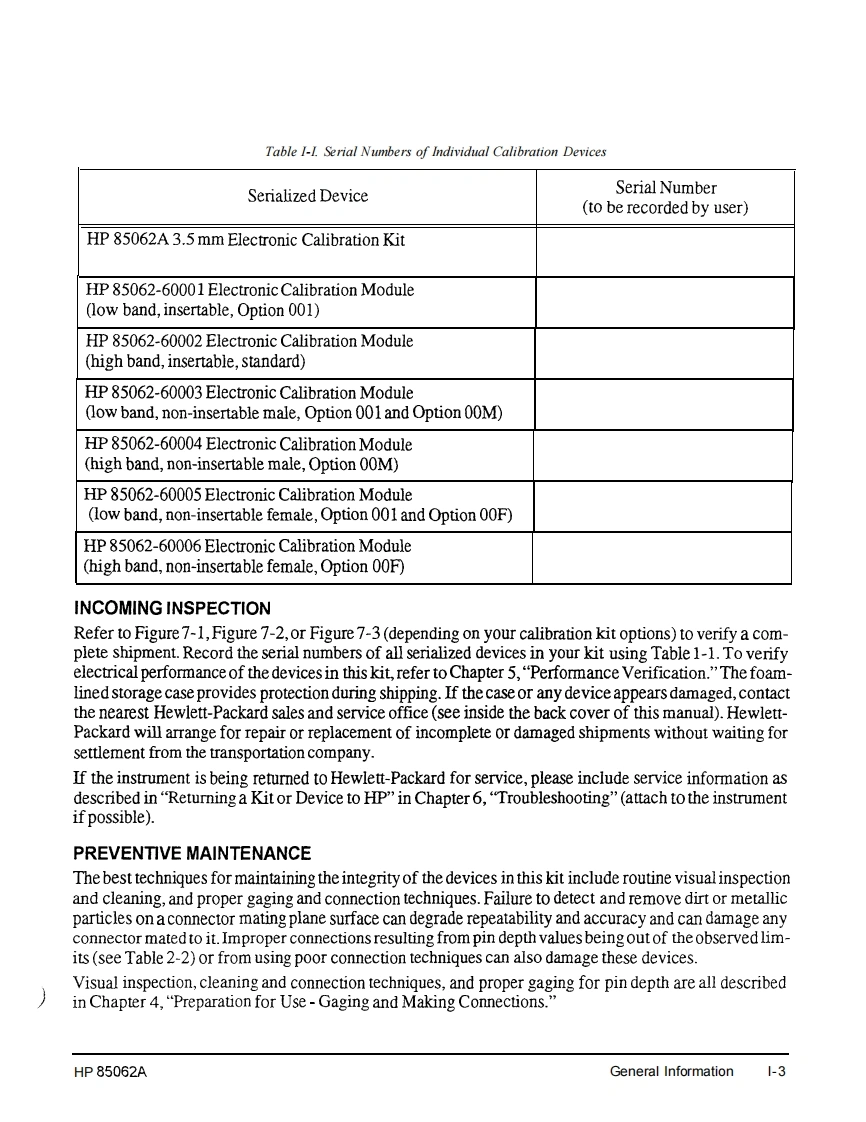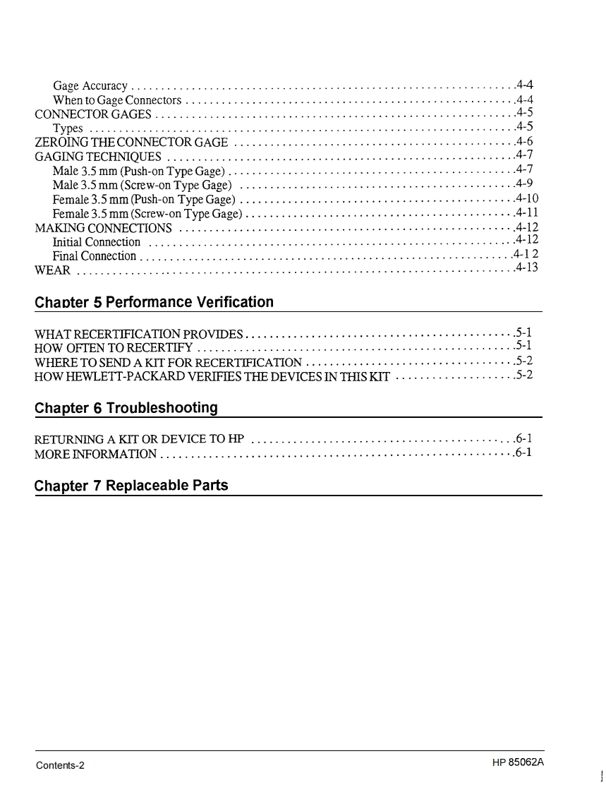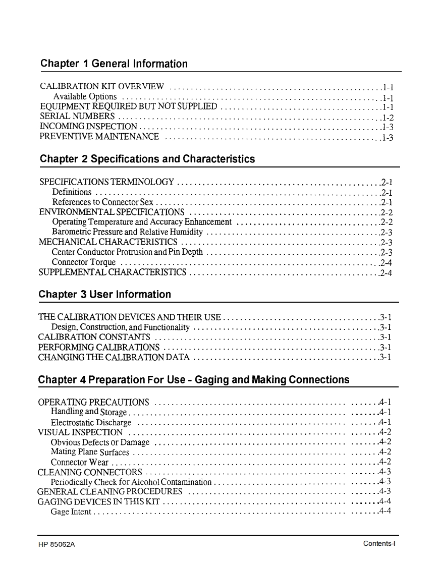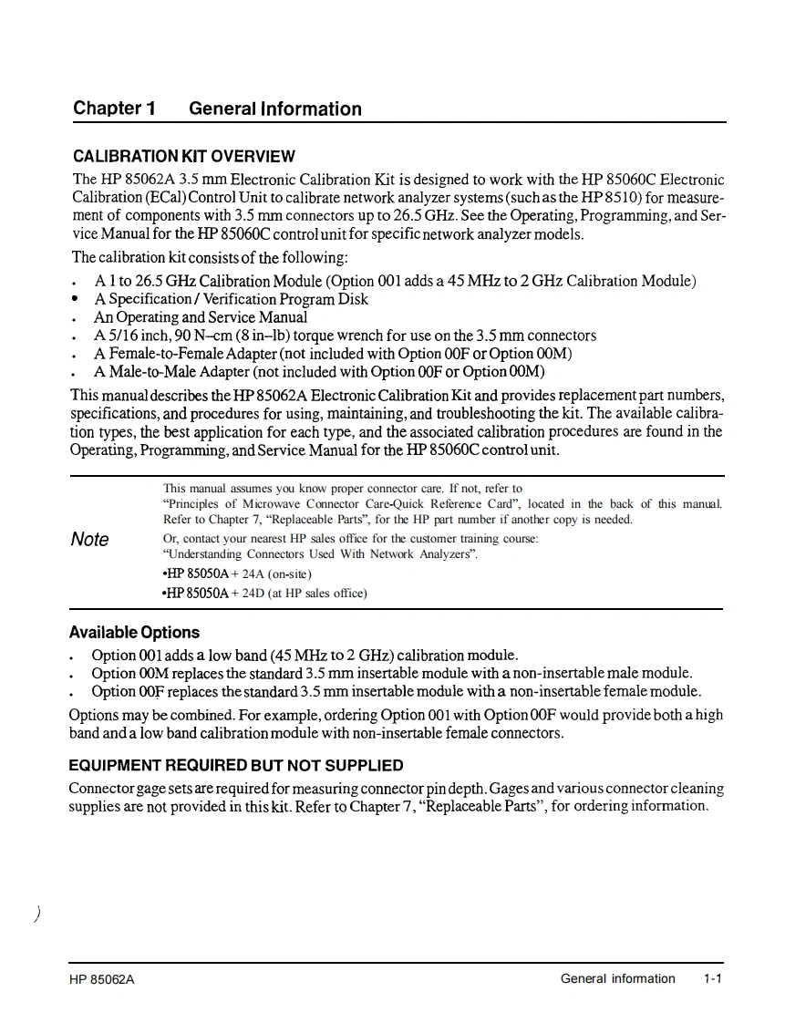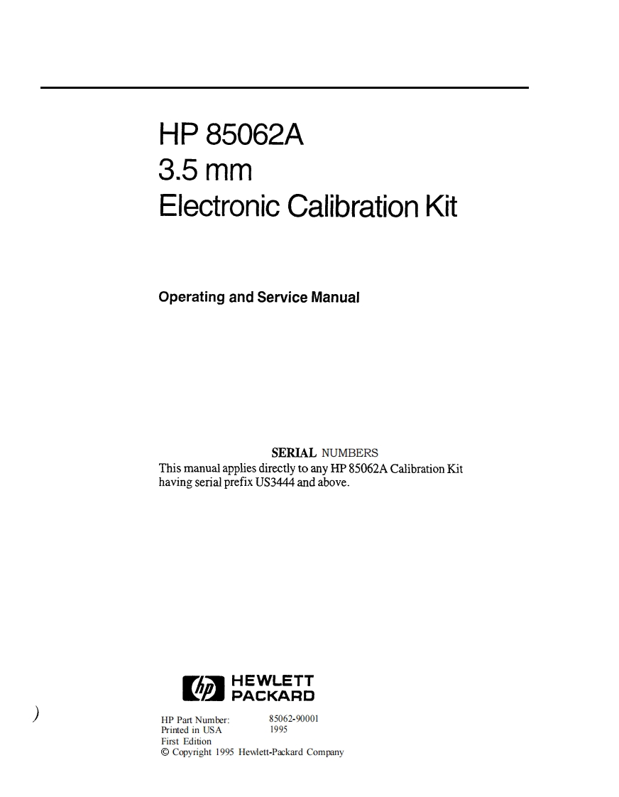 ErrataTitle Document Type:85062A 3.5 mm Electronic Calibration KOperating and Service ManualManual Part Number:85062-90001Revision Date:1995-01-01HP References in this ManualThis manual may contain references to HP or Hewlett-Packard.Please note that Hewlett-Packard's former test and measurement,semiconductor products and chemical analysisbusinesses are now part of Agilent Technologies.We have made no changes to thismanual copy.The HP XXXX referred to in this document is now the Agilent XXXXFor example,model number HP8648A is now model number Agilent 8648AAbout this ManualWe've added this manual to the Agilent website in an effort to help you support yourproduct.This manual provides the best information we could find.It may be incompleteor contain dated information,and the scan quality may not be ideal.If we find a bettercopy in the future,we will add it to the Agilent website.Support for Your ProductAgilent no longer sells or supports this product.You will find any other availableproduct information on the Agilent Test Measurement website:www.tm.agilent.comSearch for the model number of this product,and the resulting product page will guideyou to any available information.Our service centers may be able to perform calibrationif no repair parts are needed,but no other support from Agilent is available.Agilent Technologies