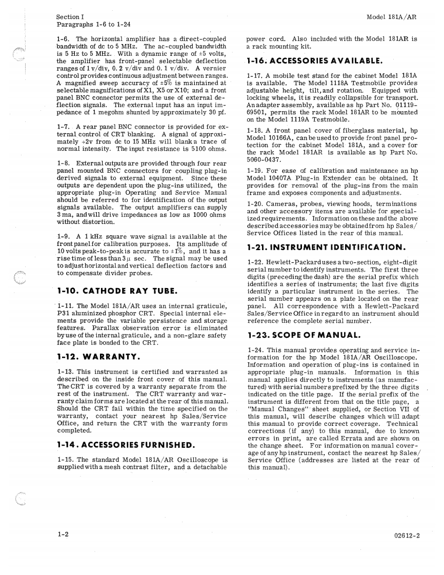 OPERATING AND SERVICE MANUALMODEL 181A/AR OSCILLOSCOPESERIALS PREFIXED:840See Section VII for Instruments With Other Serial PrefixesCopyrigh HEWLETT-PACKARD COMPANY/COLORADO SPRINGS DIVISION 19671900 GARDEN OF THE GODS ROAD.COLORADO SPRINGS.COLORADO.U.S.A.02612-4PRINTED:APR 1969