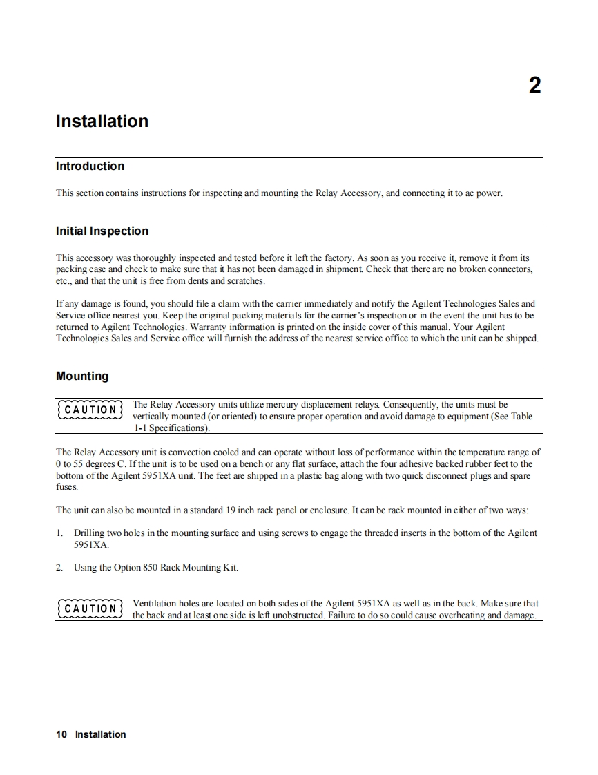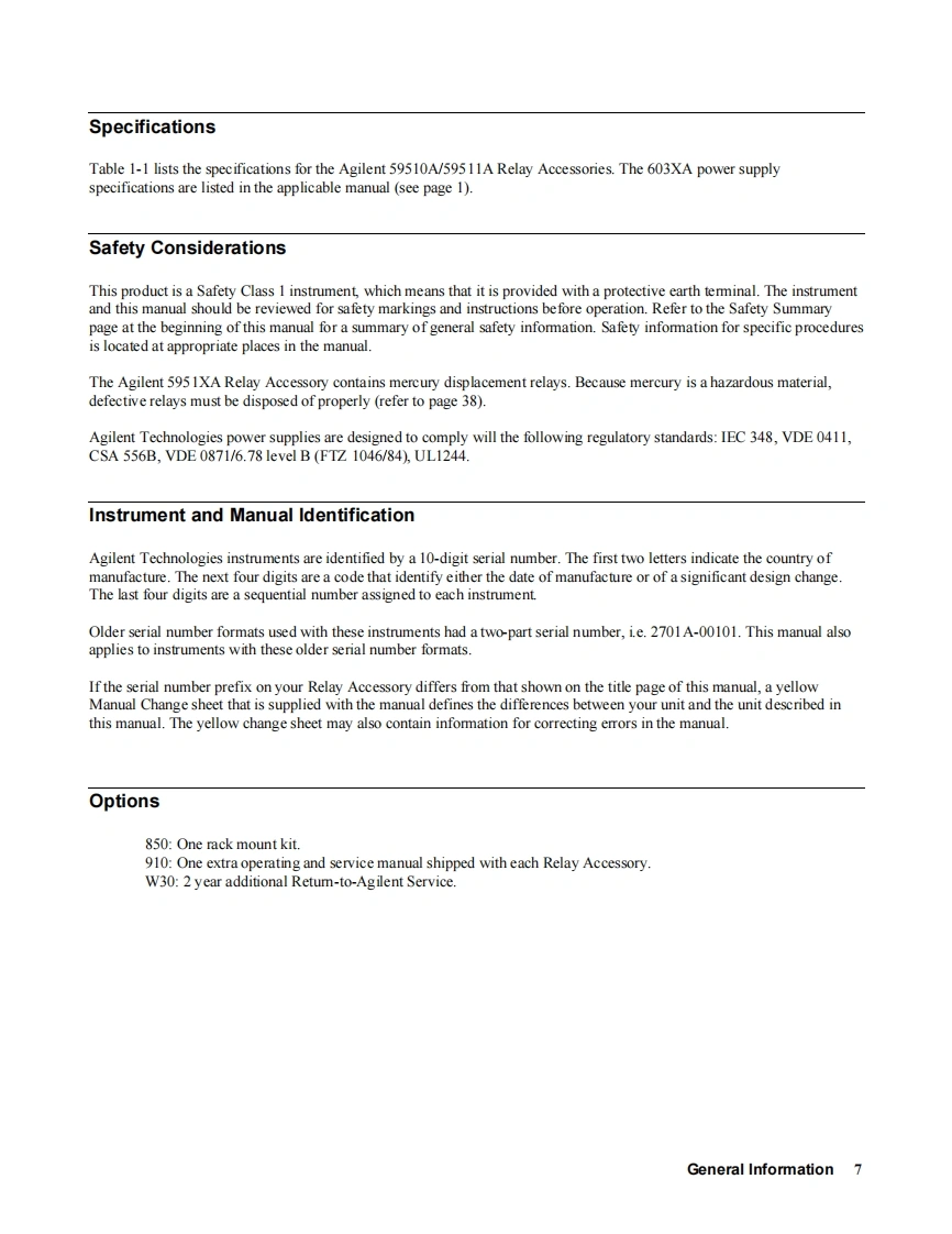 OPERATING ANDSERVICE MANUALRelay AccessoriesAgilent Models 59510A,59511AAgilent Part No.5957-6382Serial Numbers:Agilent Model 59510A,Serials US29080101 and AboveAgilent Model 59511A,Serials US29060101 and Above*This manual also applies to instruments with the older serial number format described on page 7.:Agilent TechnologiesMicrofiche Part No.5957-6383Printed in USA:April,1988
