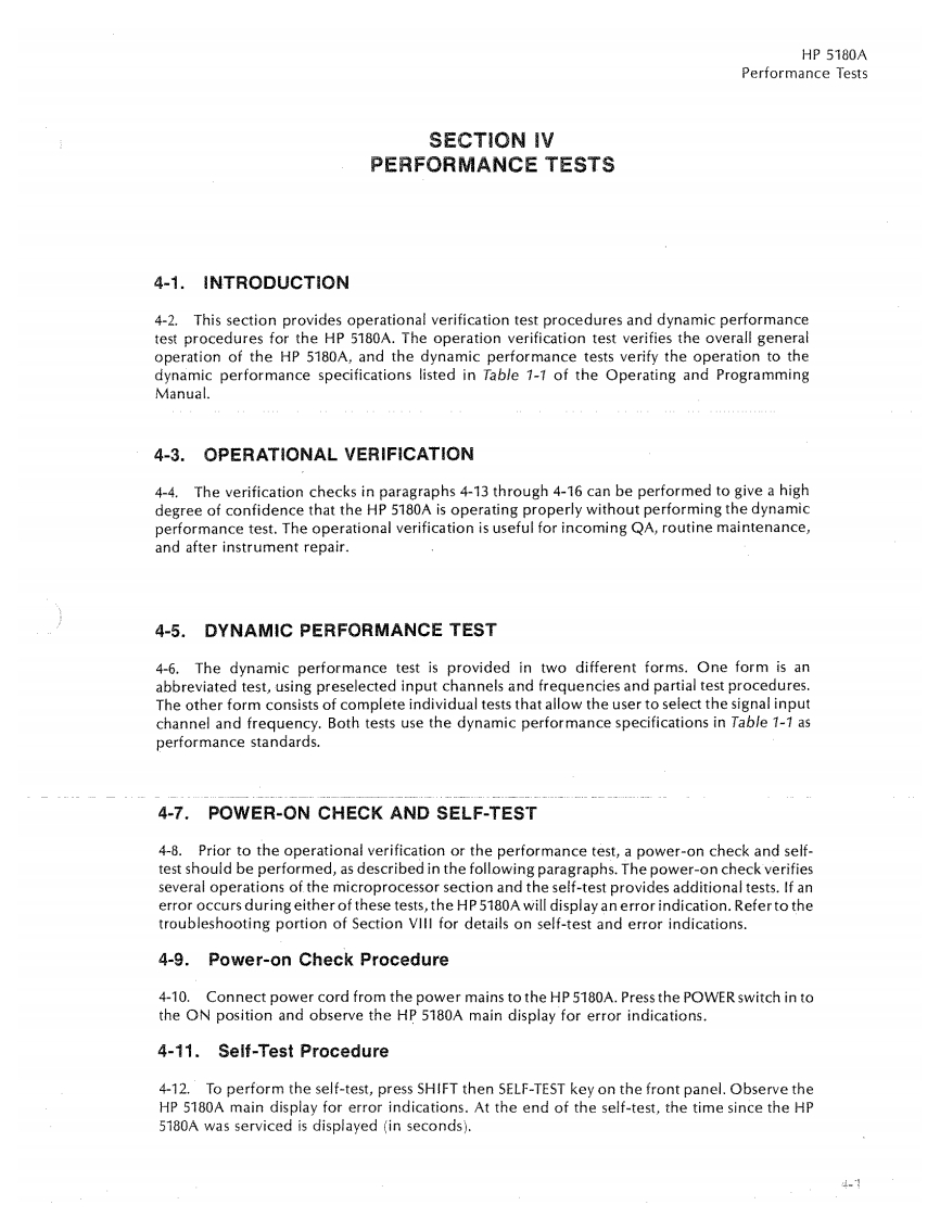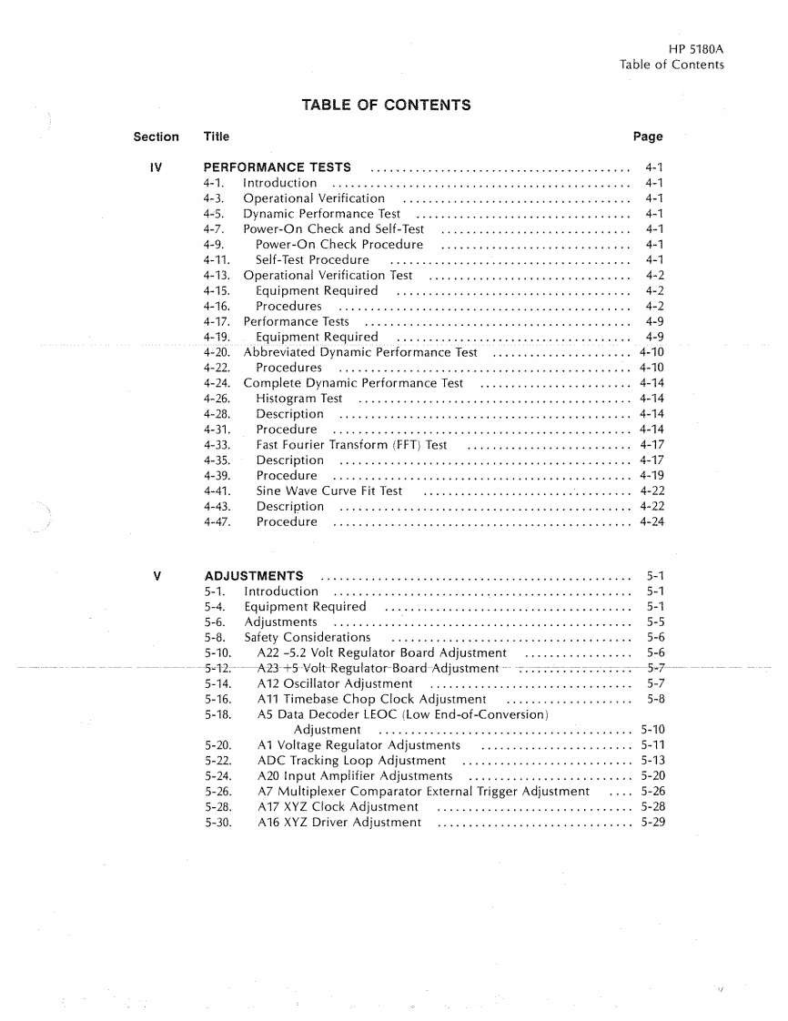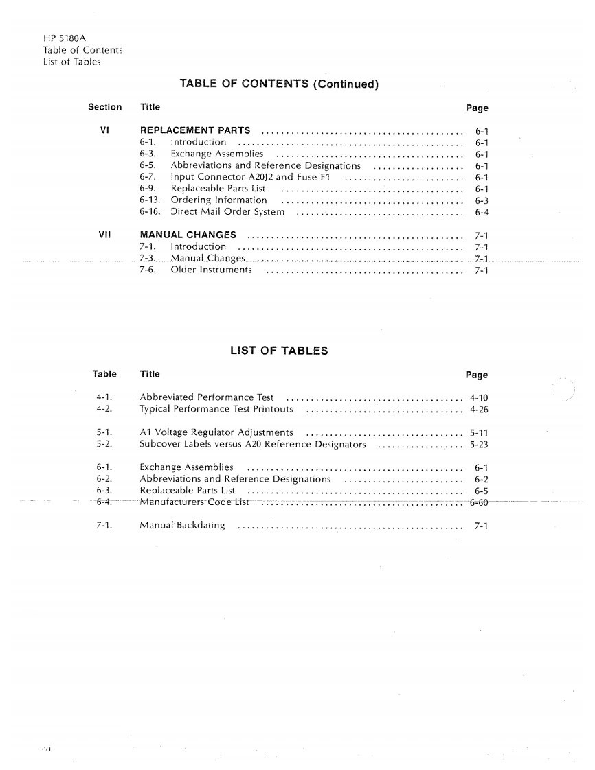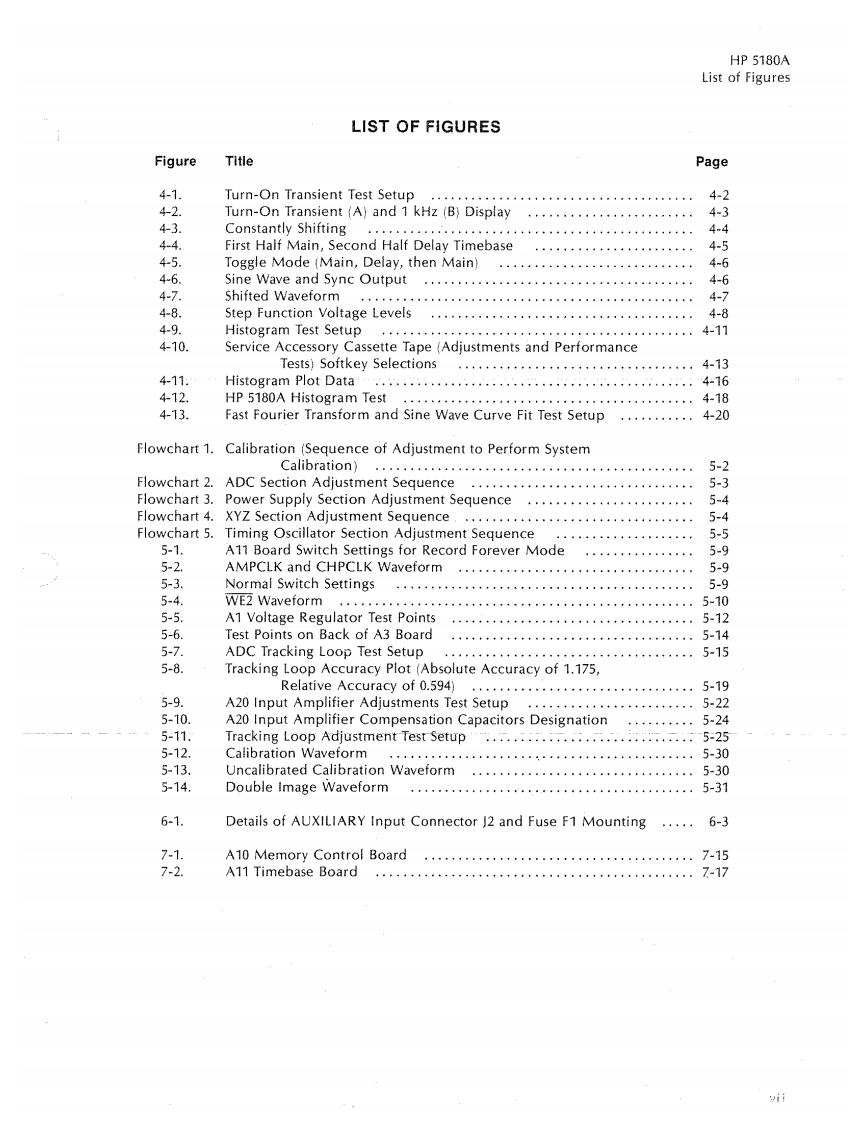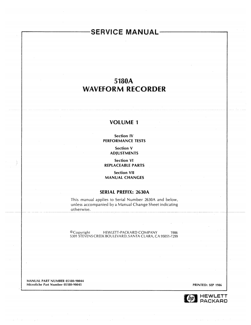 SERVICE MANUAL5180AWAVEFORM RECORDERVOLUME 1Section IVPERFORMANCE TESTSSection VADJUSTMENTSSection VIREPLACEABLE PARTSSection VllMANUAL CHANGESSERIAL PREFIX:2630AThis manual applies to Serial Number 2630A and below,unless accompanied by a Manual Change Sheet indicatingotherwise@CopyrightHEWLETT-PACKARD COMPANY19865301 STEVENS CREEK BOULEVARD,SANTA CLARA,CA 95051-7299Valuetronics International,Inc.1-800-552-8258MASTER COPYMANUAL PART NUMBER 05180-90044Microfiche Part Number 05180-90045PRINTED:SEP 1986HEWLETTPACKARD