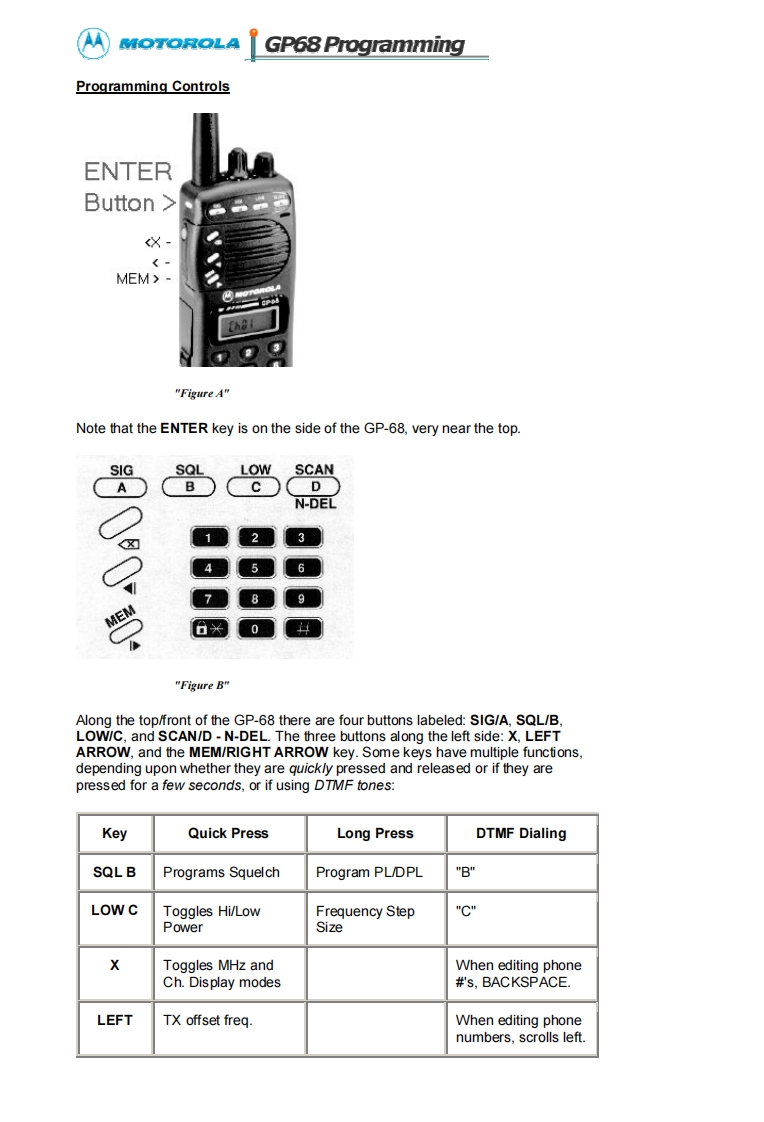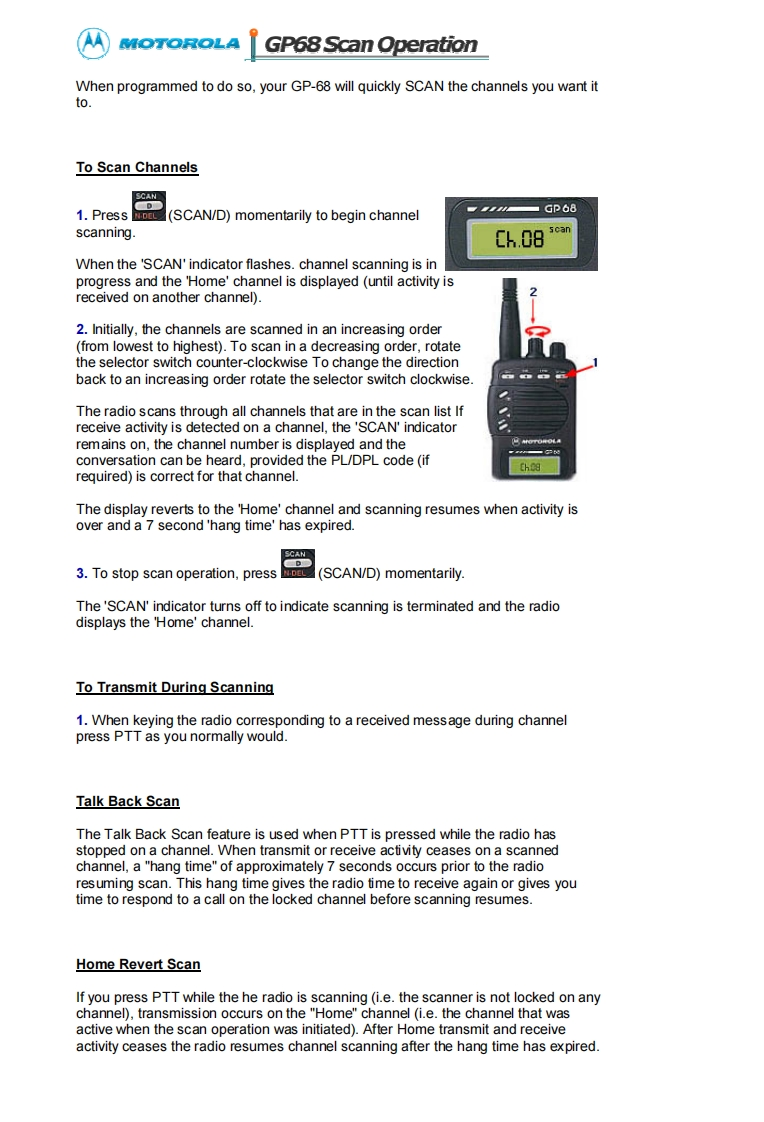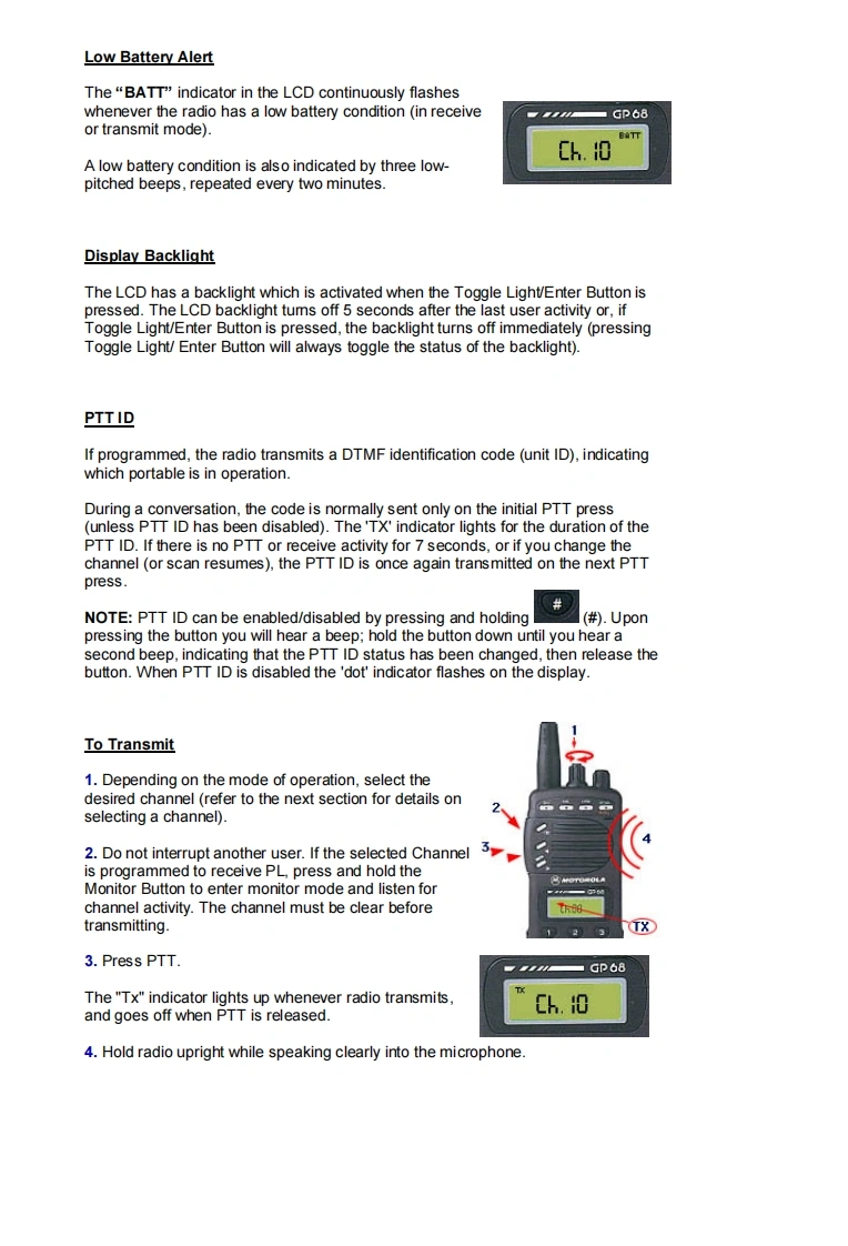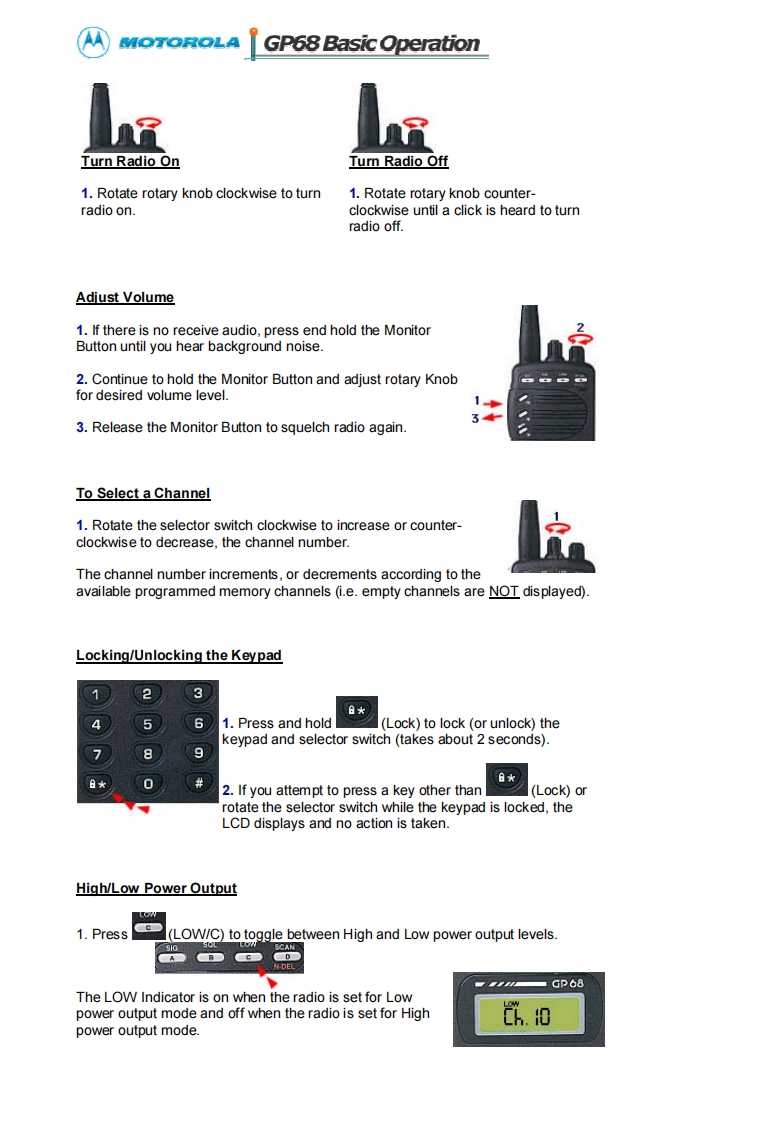 MOTOROLAGP68008Operation GuideA High Performance RadioIn A Class Of Its OwnKey Features:Wide Frequency BandsAdaptive Power Control TMPU/DPL Coded Squelch OperationSmarTrunk ll UpgradeRadius Port TM ExpendabilityPassed MIL STD 810EVoice Selective Call (option)Basic Features:Front Panel ProgrammingTelephone InterconnectRadio-To-Radio CloningRepeater OperationSelectable High/Low PowerSelectable Time-Out TimerLow Battery Alert IndicatorBattery SaverDTMF Dialing,9 Number MemoryKeypad LockReceive signal strength indicatorPassed Motorola's Accelerated Life TestingFrequency Range:VHF 136-174MHzUHF 430-470MHzRF Output:VHF 5W or 1WUHF 4W or 1W