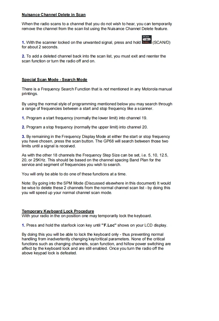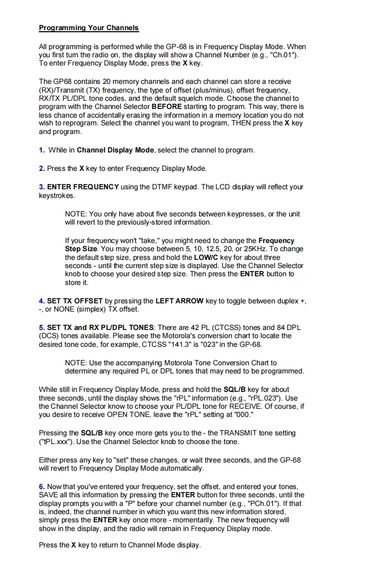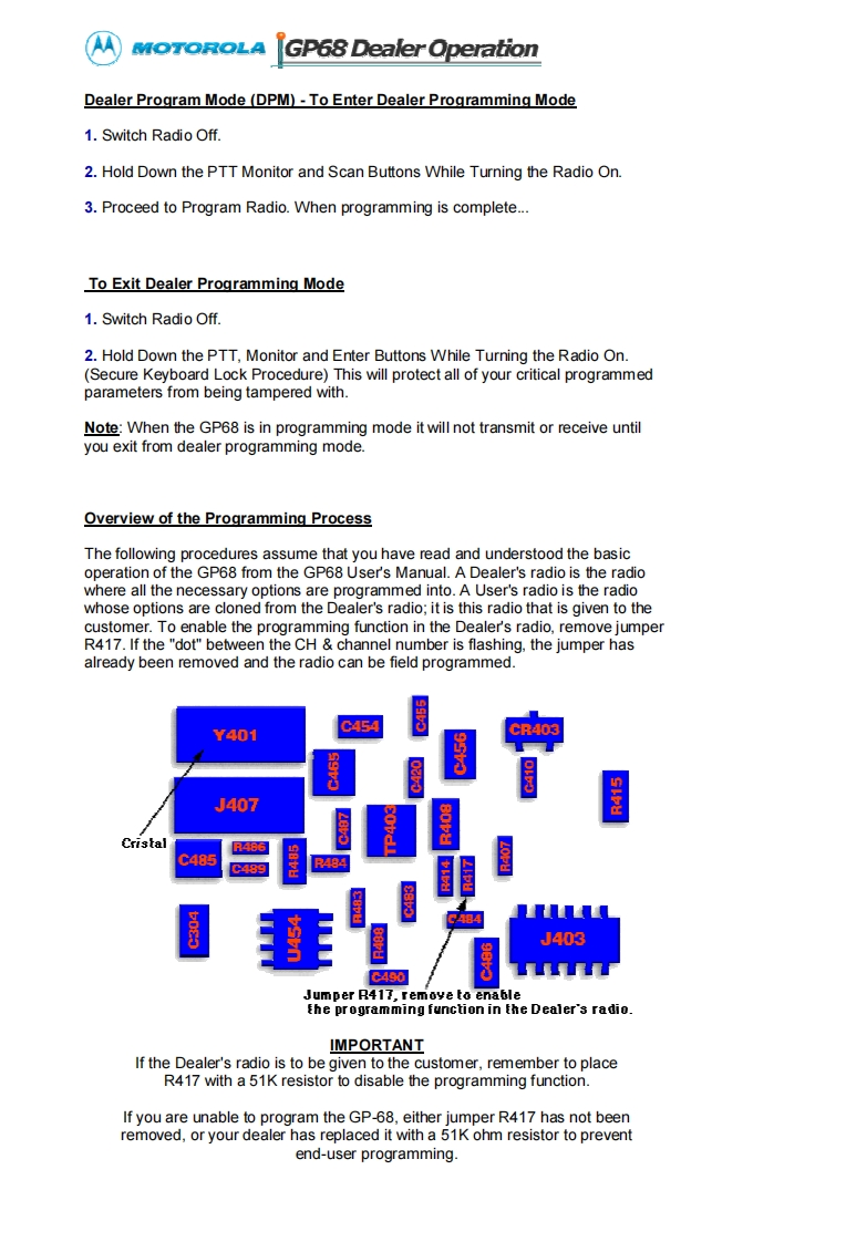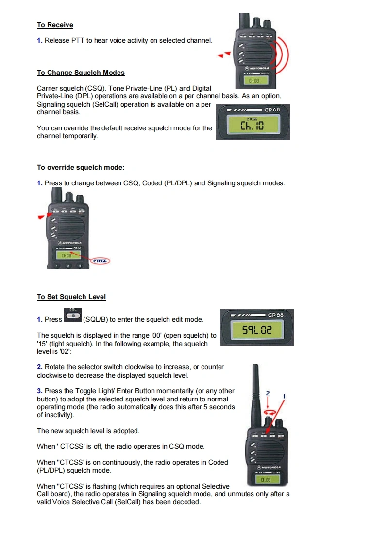 MOTOROLAGP68008Operation GuideA High Performance RadioIn A Class Of Its OwnKey Features:Wide Frequency BandsAdaptive Power Control TMPU/DPL Coded Squelch OperationSmarTrunk ll UpgradeRadius Port TM ExpendabilityPassed MIL STD 810EVoice Selective Call (option)Basic Features:Front Panel ProgrammingTelephone InterconnectRadio-To-Radio CloningRepeater OperationSelectable High/Low PowerSelectable Time-Out TimerLow Battery Alert IndicatorBattery SaverDTMF Dialing,9 Number MemoryKeypad LockReceive signal strength indicatorPassed Motorola's Accelerated Life TestingFrequency Range:VHF 136-174MHzUHF 430-470MHzRF Output:VHF 5W or 1WUHF 4W or 1W