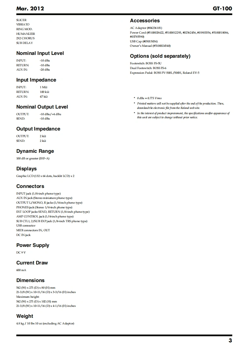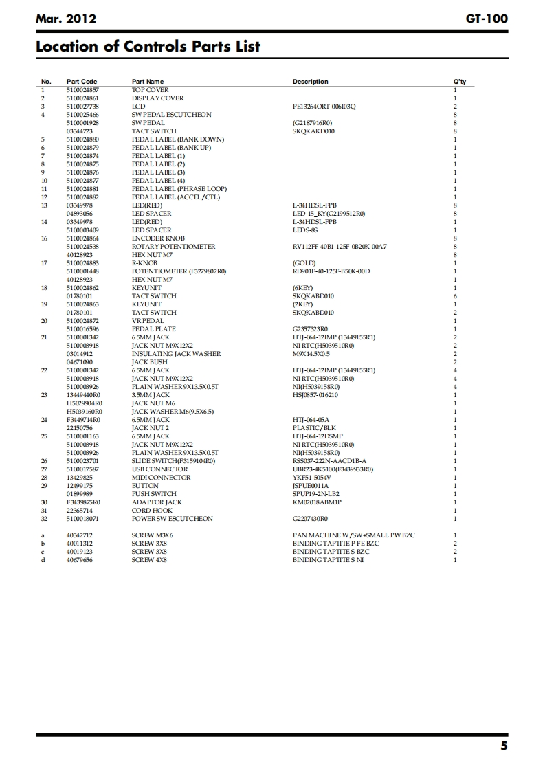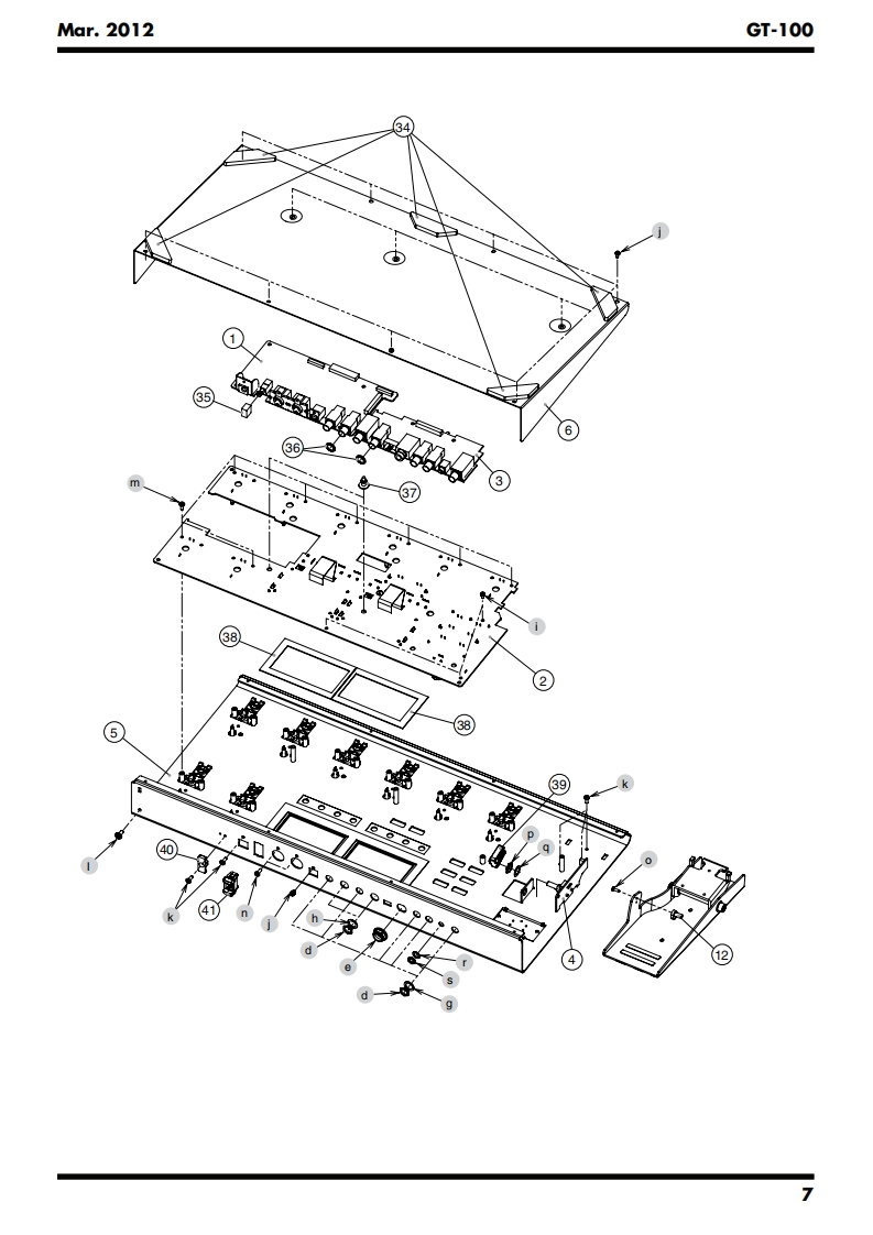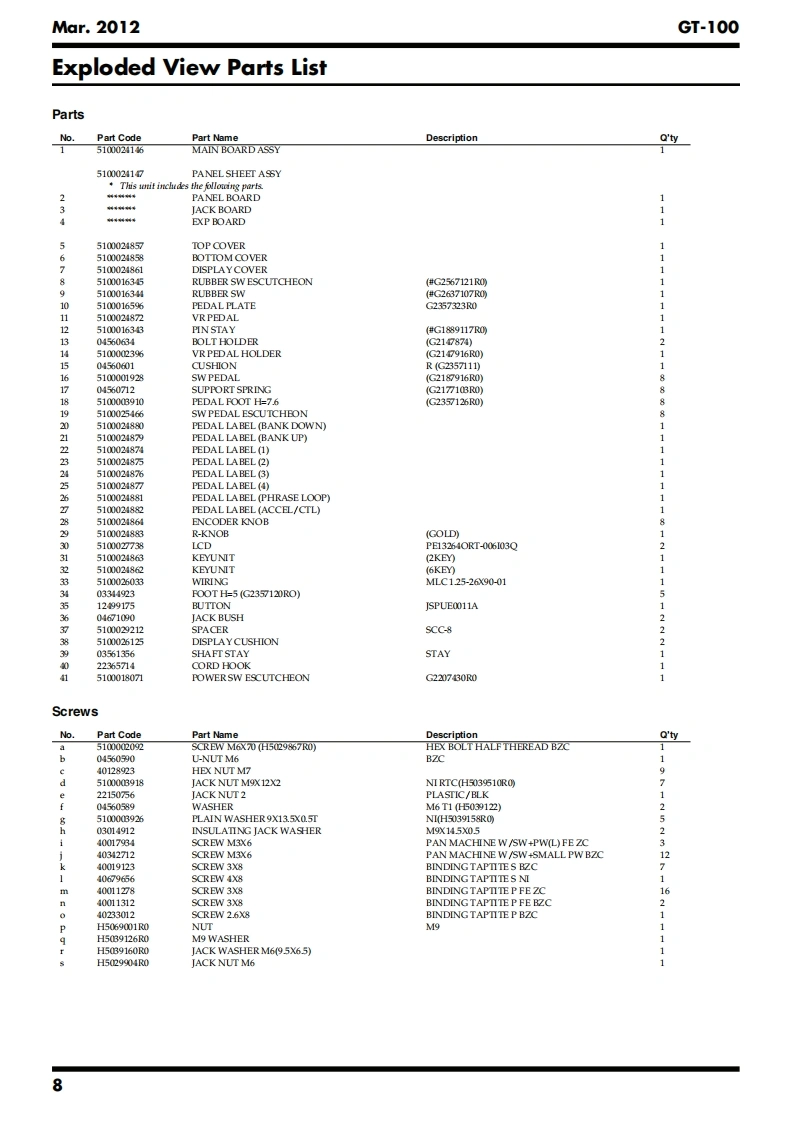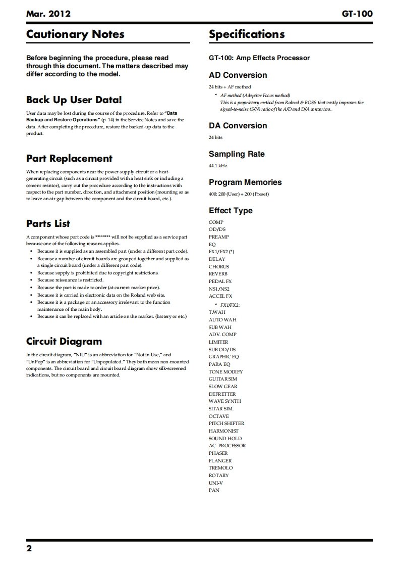 Mar.2012GT-100T-SERVICE NOTESGOSM AMPIssued by RJAEFFECTS PR▣CESS▣RTable of ContentsCautionary Notes...Test Mode........16AdditionalLocation of Controls .................4Circuit Board (Main Board)............22Location of Controls Parts List....5Circuit Diagram (Main Board:CPU)..24Exploded View...6Circuit Diagram (Main Board:Analog)26Exploded View Parts List.........8Circuit Diagram(Main Board:Power).28Wiring Diagram/Block Diagram........10Circuit Diagram (Main Board:Digital)..........30Parts List.……l2Circuit Board (Panel,Jack,EXP Board)...................32Verifying the Version.14Circuit Diagram (Panel Board).34Data Backup and Restore Operations.............14Circuit Diagram (Jack Board)......36Performing a Factory Reset..........14Circuit Diagram (EXP Board)...37Updating the System15回B▣SSGT-1▣EFFECTS PROCESSORU01-1Hi GAINSTACK"u9驰3Copyright 2012 Roland CorporationAll rights reserved.No part of this publication may be reproduced in any form without the written permissionof Roland Corporation.Roland17058788E0CC-KWS