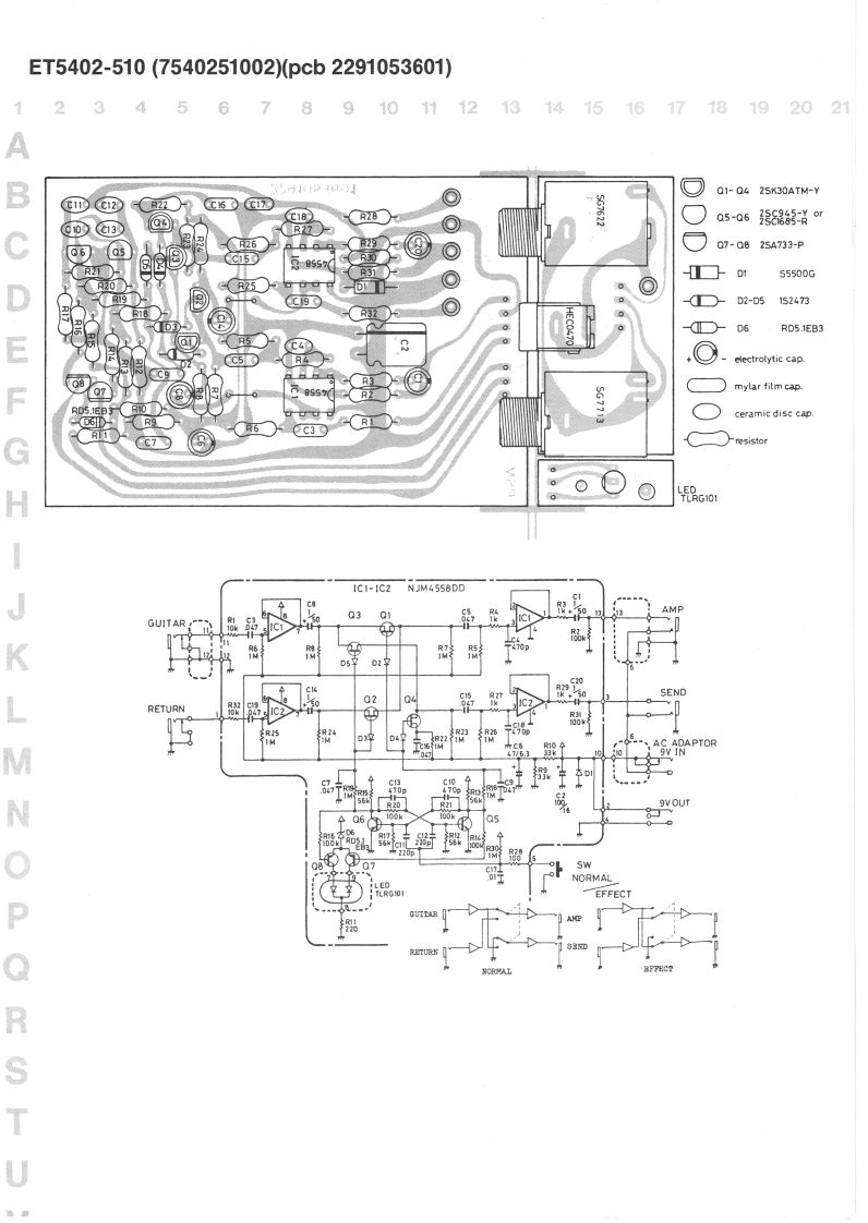 MAY.20,1982PSm-55E▣G3P5m-5SERVICE NOTESFirst EditionSPECIFICATIONSPower9V DC 200mACurrent Draw .........Master Switch section:Spring base9V DC 13mACoil springInput Impedance.......GUITAR:1MO(2217010900)RETURN:1MROutput Load Impedance AMP:over 10kGuide bushingSEND:over 10k(2215070201)Gan……UnityCase(2201015400)Frequency Response10Hz.100kHz(-3dB】Cover(2202011600)Dimensions ...........70(W)×55(H)×125(D)mm(2-3/4"×2-1/4"×5")Weight.340g(12oz)Base(2235030500)Jack HEC-0749-01-010·LED TLRG101(15029137)(13449704)。Jack HEC-0470-01-230(13449706)Jack SG-7713#4Jack SG-7622#8(13449104)(13449106).SENDRETURN●Jack SG-7615(13449105)Pedal(2218052400)●sm-5Base(2235030400】Decoration screw 3 x 10mmPARTS LISTSEMICONDUCTOR2201015400Casered15189102NJM4558DDIC(020-0712218052400 Pedalred151391012SK30ATM-YFET(017-014)2202011600Coverbottom(065-130)152191290R2SC1687-RTr2235030400Basepedal matt(111-031)151191052SA733Tr(017-0242235030500Basebottom(111-03215019523RD5.1EB-3Zener(018-075)2215070201Guide bushing(068-026150191031S2473LED018-014)2226030500 Cushion(107-05315019209T0S5500Gdiode2216050200 Spacerpcb-rear cover(065-15315029137TLRG101LED2217010900 Coil spring(070-059)The following are not spare parts but available onthe commercial basis.JACK2343075100 Parallel DC cord13449704HEC-0749-01-010AC adaptor13449706HEC-0470-01-230AC ADAPTOR13449104SG-7713#4(009-03612449509PSA-10013449106SG-7622#8(009-01212449510PSA-12013449105SG-7615(009-00112449511PSA-22012449512PSA-240SWITCH13129710JM-0404(001-295)PCB7540251002 Assy ET5402-510(pcb2291053601)RolandPrinted in Japan BB-2