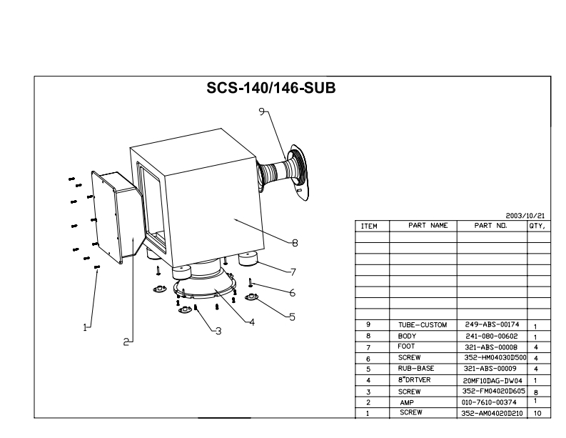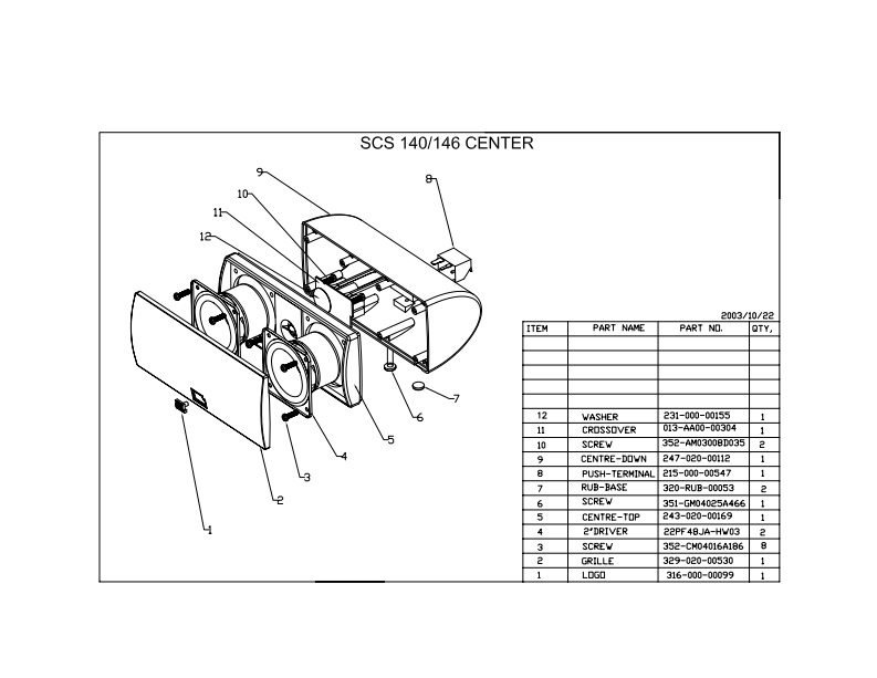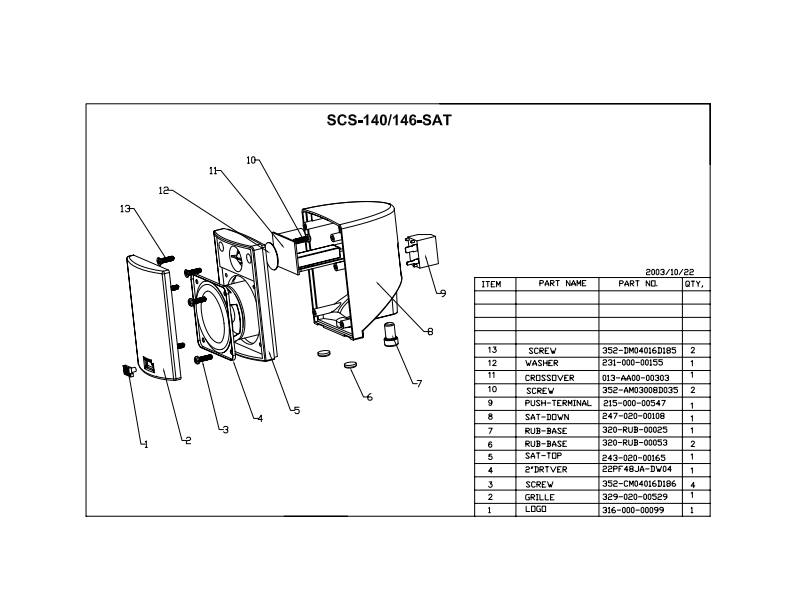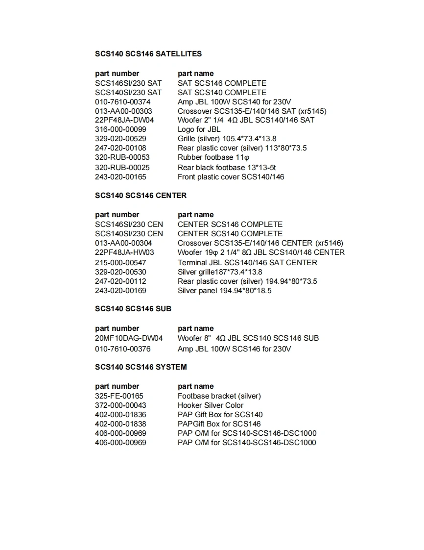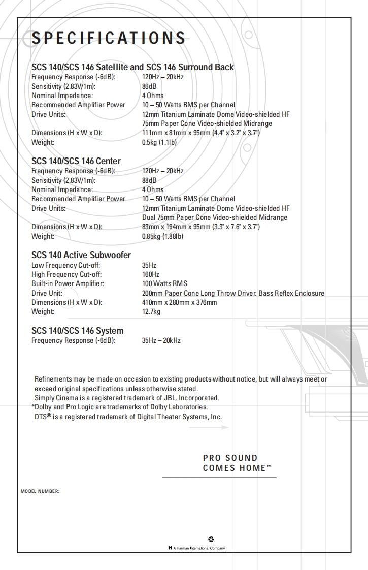 Y20MSERVICE MANUALPRODUCT LINE:simply CinemaMODEL NUMBER:SCS 140,SCS 146,DESIGN GOAL:Bring the thrill of live performance and movie sound to thehome environment by calling on JBL's professional engineering leadership.JBLSATELLITE TYPE:Titanium-aminate-dome tweetec sealed enclosureSUBWOOFER TYPE:Bass-reflex enclosurePORT DESIGN:FreeFlowTM flaredPROFESSIONAL REFERENCE:Cinema Loudspeaker Series