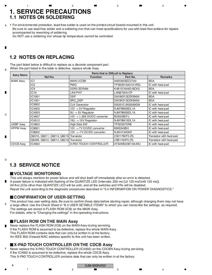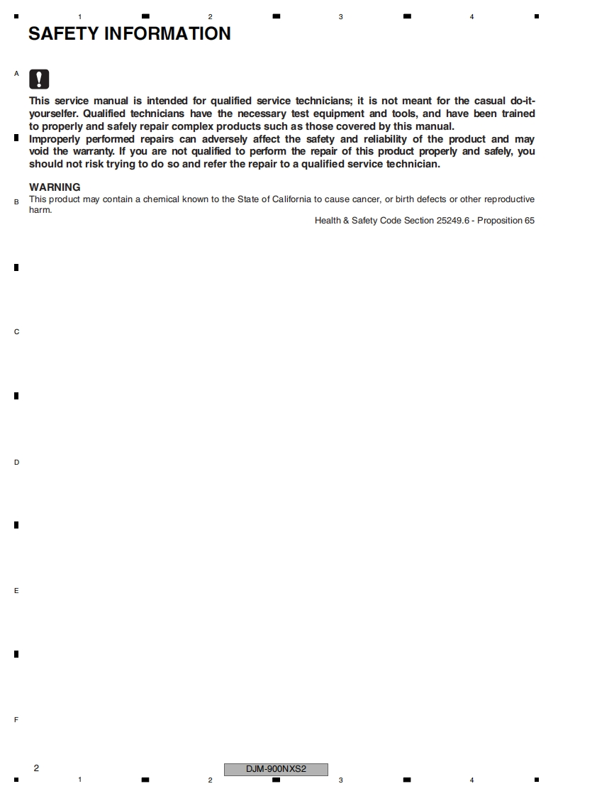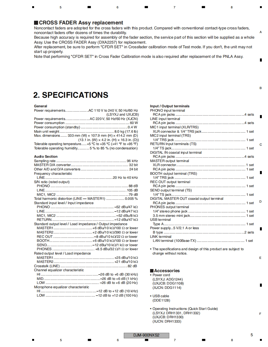 ServiceManualORDER NO.RRV4643DJM-900NXS2DJ MIXERDJM-900NXS2THIS MANUAL IS APPLICABLE TO THE FOLLOWING MODEL(S)AND TYPE(S).ModelTypePower RequirementRemarksDJM-900NXS2LSYXJAC 110 Vto 240 VDJM-900NXS2UXJCBAC 110 Vto 240 VDJM-900NXS2XJCNAC 220 VTHIS SERVICE MANUAL SHOULD BE USED TOGETHER WITH THE FOLLOWING MANUAL(S).ModelOrder No.RemarksDJM-900NXS2RRV4644SCHEMATIC DIAGRAM,PCB CONNECTION DIAGRAM,PCB PARTS LISTPIONEER CORPORATION 1-1,Shin-ogura,Saiwai-ku,Kawasaki-shi,Kanagawa 212-0031,JapanPIONEER ELECTRONICS (USA)INC.P.O.Box 1760,Long Beach,CA 90801-1760,U.S.A.PIONEER EUROPE NV Haven 1087,Keetberglaan 1,9120 Melsele,BelgiumPIONEER ELECTRONICS ASIACENTRE PTE.LTD.2 Jalan Kilang Barat,#07-01,Singapore 159346CPioneer DJ Corporation 2016K-MZV FEB.2016 Printed in Japan