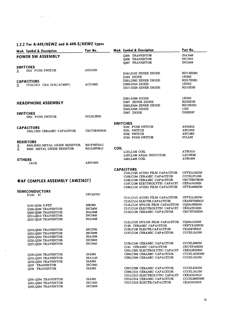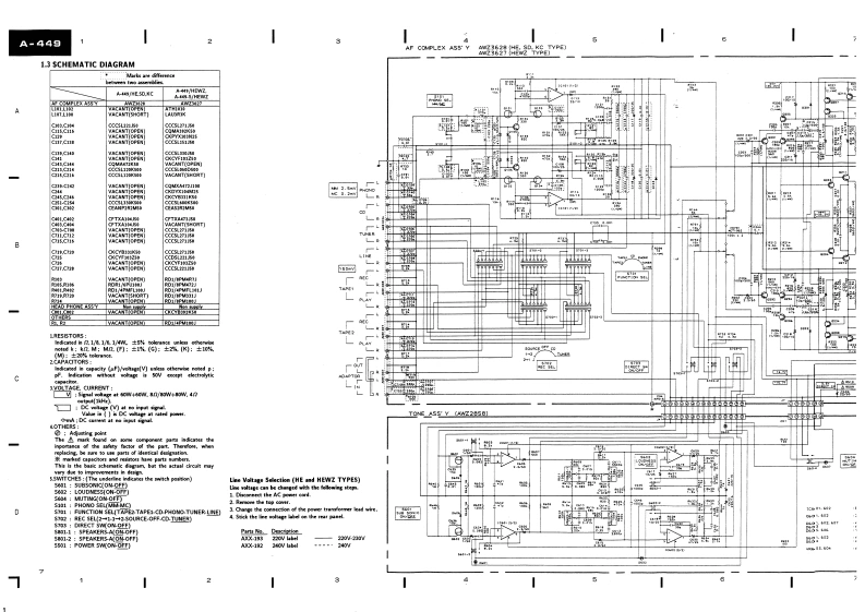 PIONEERThe Art of EntertainmentServicec☑TanualORDER NO.ARP2215STEREO AMPLIFIERA-449A-449-SA-449,A-449-S,A-339 AND A-339-S HAVE THE FOLLOWING:ModelTypePower RequirementRemarksA-449A-449-5A-339A-339-5KUOAC120V onlyHE00AC220-230V,240V(switchable)*HEWZQ000AC220-230V,240V(switchable)*%00AC110V,120V-127V,220V,240V(switchable)KCOAC120V onlyChange the primary wiring..Refer to the service manual ARP2043,A-447/HE and A-337/HE..This manual is applicable to the A-449/HE,HEWZ,SD,KC,A-449-S/HEWZ,A-339/KU,HE,HEWZ,SDand A-339-S/HEWZ types.The A-449-S is the same as the A-449 except for color.The A-339-S is the same as the A-339 except for color.CONTENTS1.FOR A-449/HE,HEWZ,SD.KC AND A-449-S/HEWZTYPES4t4444”22.FOR A-339/KU,HE.HEWZ,SD AND A-339-S/HEWZTYPES…17PIONEER ELECTRONIC CORPORATION 4-1.Meguro 1-Chome.Meguro-ku.Tokyo 153.JapanPIONEER ELECTRONICS SERVICE INC.P.O.Box 1760,Long Beach,Califomia 90801 U.S.A.PIONEER ELECTRONICS OF CANADA,INC.505 Cochrane Drive,Markham.Ontario L3R 8E3 CanadaPIONEER ELECTRONIC [EUROPE]N.V.Keetberglaan 1,2740 Beveren.BelgiumPIONEER ELECTRONICS AUSTRALIA PTY.LTD.178-184 Boundary Road,Braeside.Victoria 3195.Australia TEL:[03]580-9911PIONEER ELECTRONIC CORPORATION 1991FV APR.191 Printed in