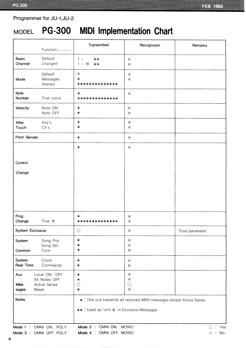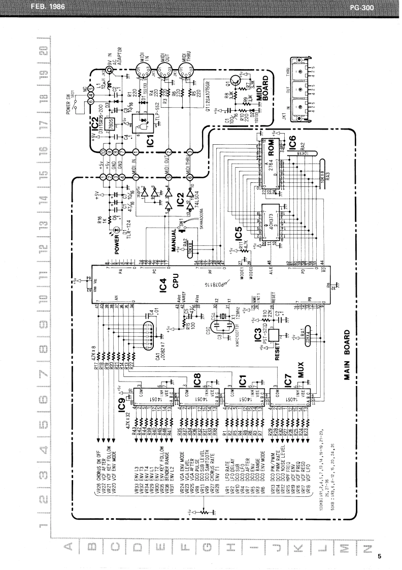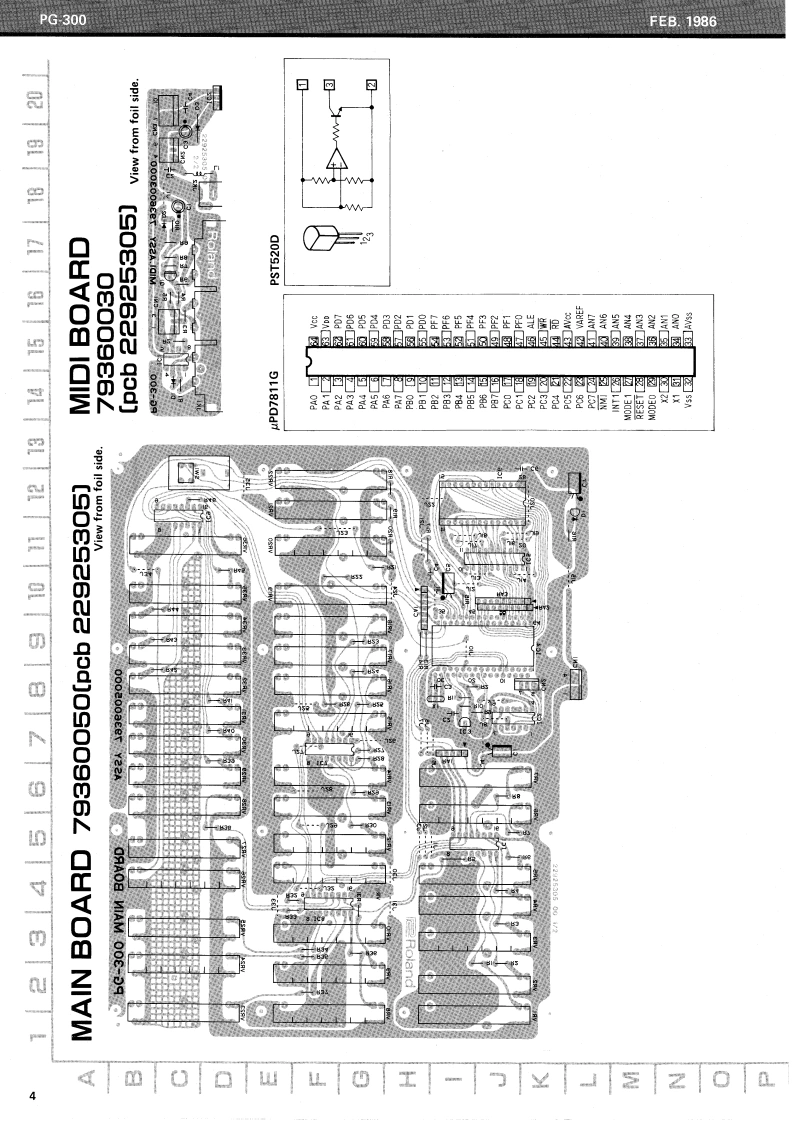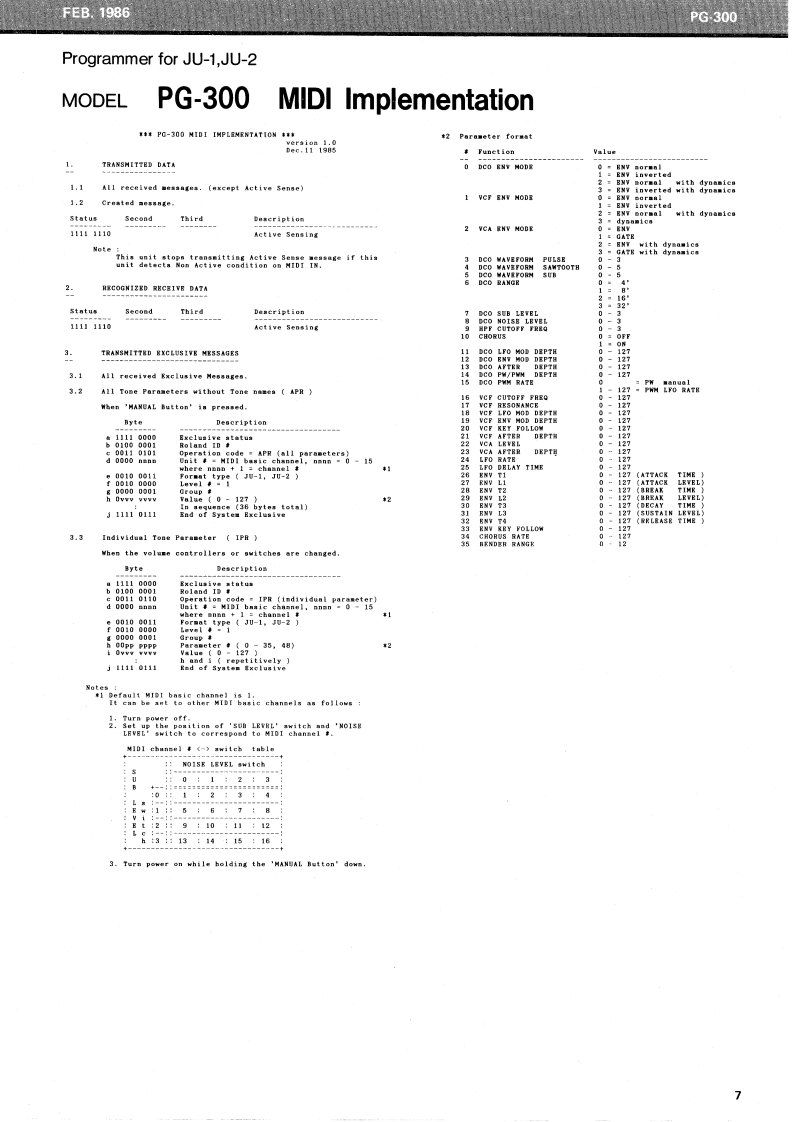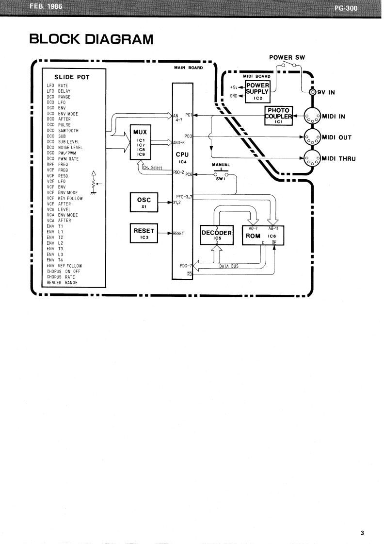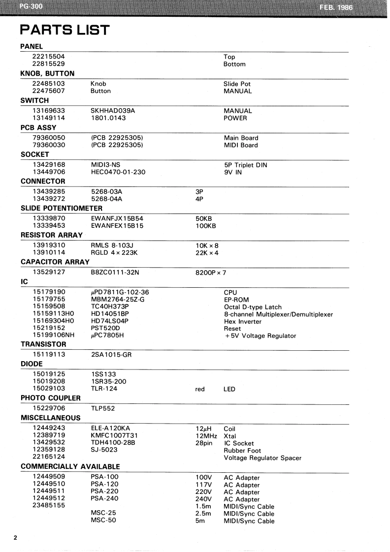 FE8.1986PG300PG-300SERVICE NOTESFirst editionSPECIFICATIONSCURRENT CONSUMPTION 200mA DC at 9VACCESSORIESAC Adapter PSA-120,220 or 240WEIGHT1.7 kg/3 Ib 12 oz (withoutMIDI/SYNC Cable (1.5 m)Adaptor)DIMENSIONS267(W0X55(HX238(D1mm10-1/2”×2-1/8”x9.1/8TOP PANEL (22215504)LED TLR-124(15029103)red①S-3002BUTT0N(22475607SWITCH SKHHAD039A(13169633)①KN0B(224851031SLIDE POT.EWANFEX15B15 (13339453)2KN0B(224851031SLIDE POT.EWANFJX15B54 (13339870)MAIN BOARD (79360050)P0 WER SWITCH1801-0143(13149114)MIDI BOARDS0 CKET HEC0470-01-230(13449706)(79360030SOCKET MIDI3-NS (13429168)tripletRUBBER F00TSJ5023(123591281BOTTOM PANEL(22815529)3 x 8 mm TAPPING SCREW Fe BLKRolandPrinted in Japan BB-2 1