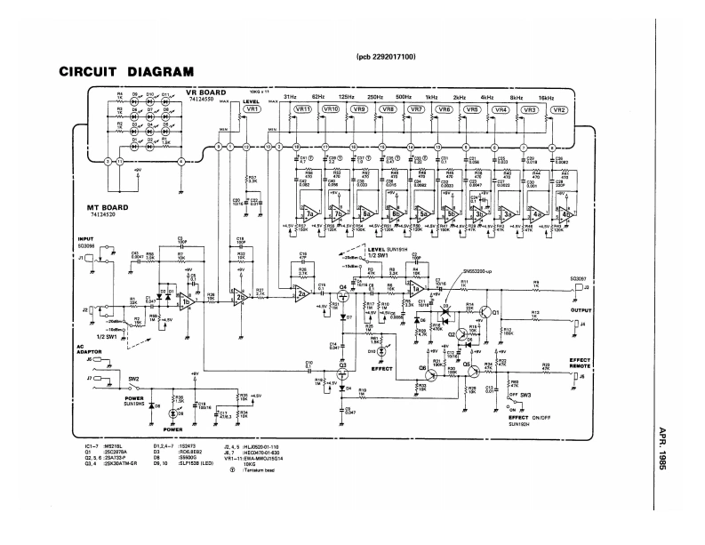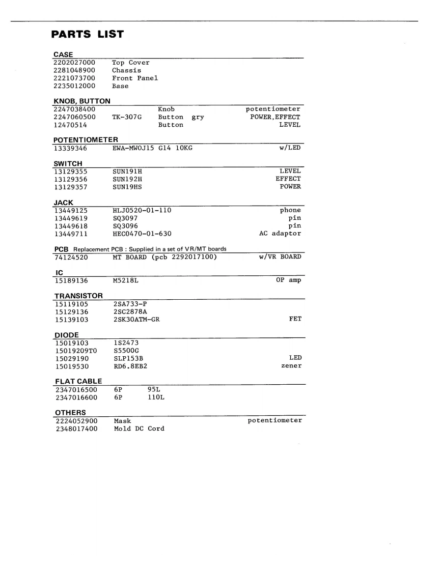 APR.1985RGE-10)E▣SRGE-I▣SERVICE NOTESFirst EditionSPECIFICATIONSPower:9VDC(B0 SS PSA-100,120,220or240)Current Draw 50mADimensions:218(W)×46(H)×160(Djmm/:8-9/16"(W)×1-13/16"(H)×6-5/16"(D)Weight:900g/21bTop CoverLED SLP153B(2202027000】(150291901Front Panel(2221073700)SwitchSUN19HSTop Cover Removal Screw(1312935713×6 mm BH Fe C1BCChassisButton(4 pcs)(2281048900jTK-307G gry(22470605001SwitchPot.SUN192HEWA-MWOJ15 G14 10KG(13129356)(13339346)ButtonTK-307G gry29o38401(2247060500)JackPin JackSwitchAC Adaptors03097SUN191HHEC0470-01630(134496191(13129355)(13449711)Button(12470514)受圈可BasePhone JackPin Jack(2235012000】HLJ0520-01-110SQ3096(13449125)(134496181RolandPrinted in Japan B-3 1