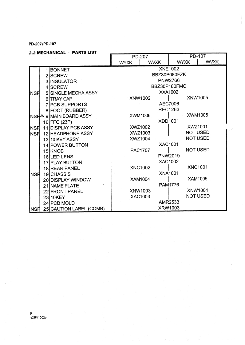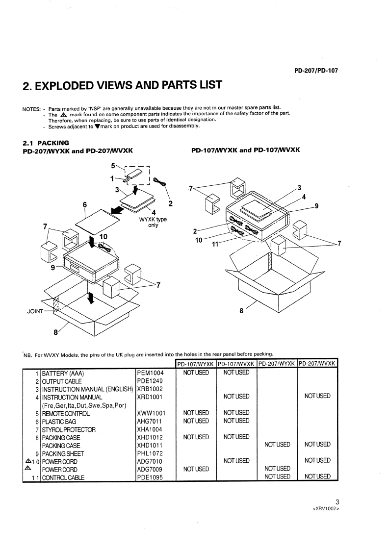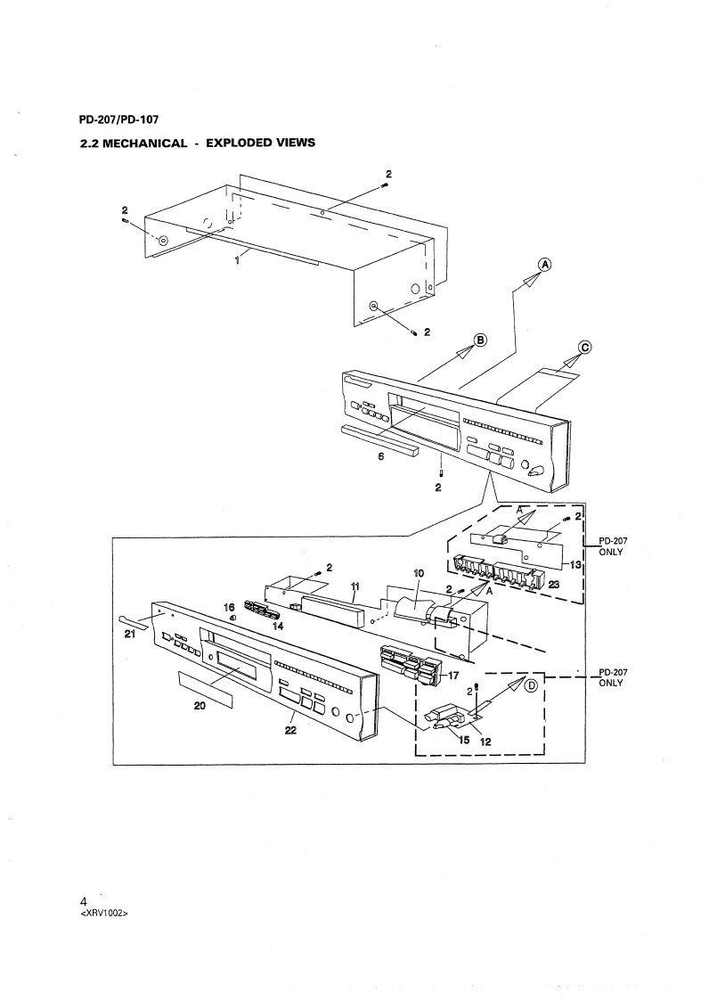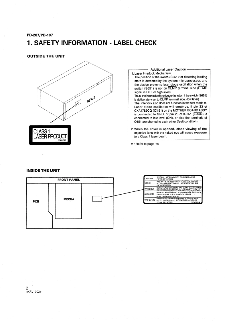PioneerServiceManualORDER NUMBER:XRV1002COMPACT DISC PLAYERPD-207PD-207PD-107PD-107THIS MANUAL IS APPLICABLE TO THE FOLLOWING MODELS AND TYPES.TypeModelPower RequirementPD-107|PD-207WYXK00220-240VACWXK00220-240VACCONTENTS1.SAFETY INFORMATION-LABEL CHECK2.EXPLODED VIEWS AND PARTS LIST3.SCHEMATIC DIAGRAM104.PCB CONNECTION DIAGRAM5.PCB PARTS LIST6.ADJUSTMENT217 GENERAL INFORMATION -BLOCK DIAGRAMB.PANEL FACILITIES AND SPECIFICATIONS30PIONEER ELECTRONIC CORPORATION4-1,Meguro 1-Chome,Meguro-ku,Tokyo 153,Japan.PIONEER ELECTRONIC (EUROPE)N.V.Haven 1087,Keetberglaan 1,9120 Melsele,Belgium.PIONEER ELECTRONICS SERVIVE INC.P.O.Box 1760,Long Beach,CA90801-1760,U.S.A.PIONEER ELECTRONICS ASIACENTRE PTE.LTD 501 Orchard Road,10-00 Lane Crawford Place,Singapore 0923.C PIONEER ELECTRONICS TECHNOLOGY (UK)LTDNOVEMBER 1998