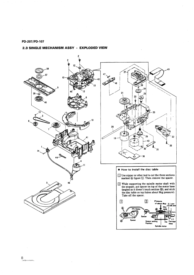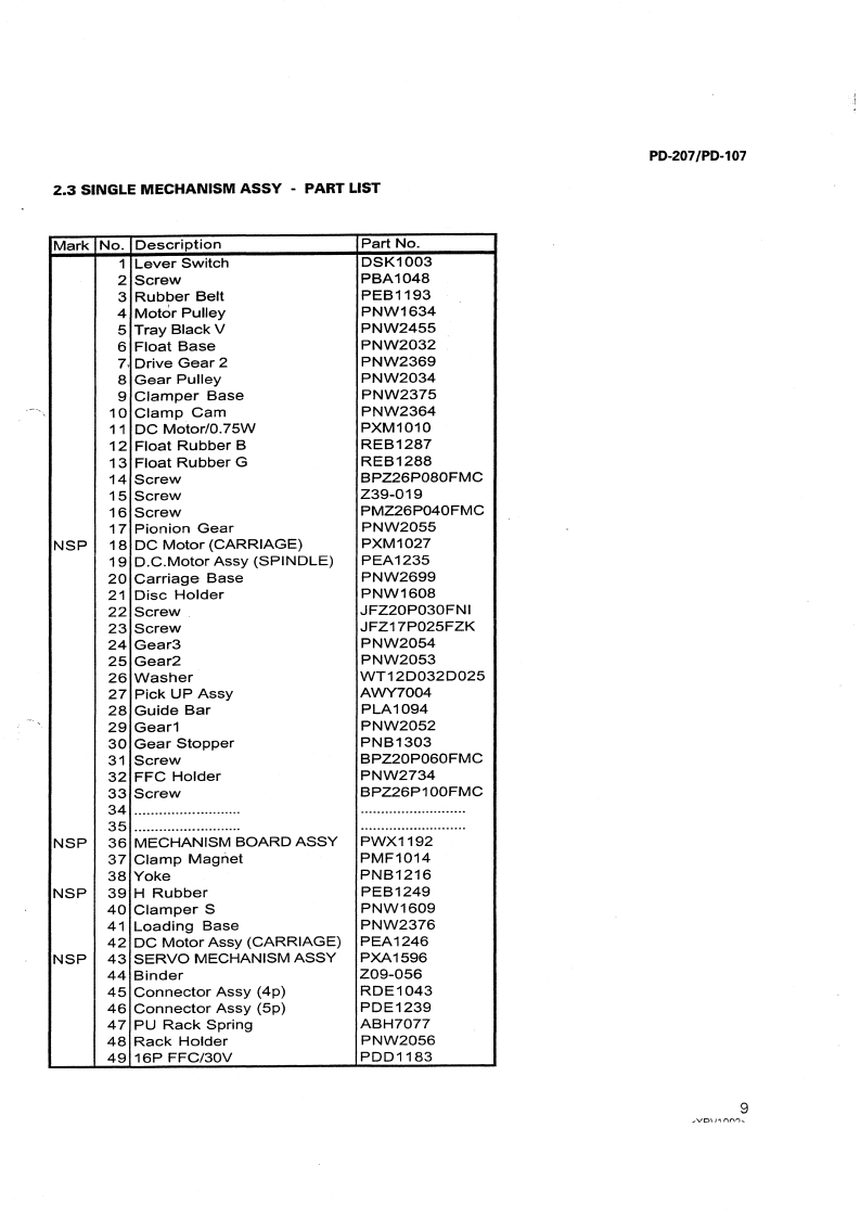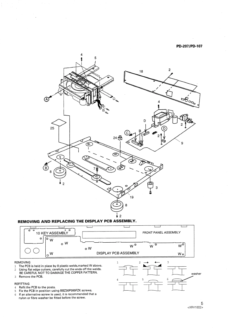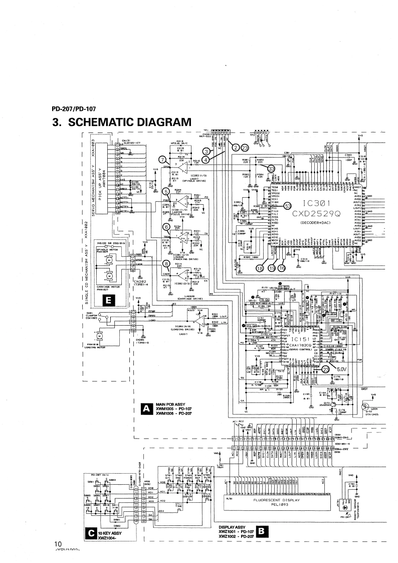 PioneerServiceManualORDER NUMBER:XRV1002COMPACT DISC PLAYERPD-207PD-207PD-107PD-107THIS MANUAL IS APPLICABLE TO THE FOLLOWING MODELS AND TYPES.TypeModelPower RequirementPD-107|PD-207WYXK00220-240VACWXK00220-240VACCONTENTS1.SAFETY INFORMATION-LABEL CHECK2.EXPLODED VIEWS AND PARTS LIST3.SCHEMATIC DIAGRAM104.PCB CONNECTION DIAGRAM5.PCB PARTS LIST6.ADJUSTMENT217 GENERAL INFORMATION -BLOCK DIAGRAMB.PANEL FACILITIES AND SPECIFICATIONS30PIONEER ELECTRONIC CORPORATION4-1,Meguro 1-Chome,Meguro-ku,Tokyo 153,Japan.PIONEER ELECTRONIC (EUROPE)N.V.Haven 1087,Keetberglaan 1,9120 Melsele,Belgium.PIONEER ELECTRONICS SERVIVE INC.P.O.Box 1760,Long Beach,CA90801-1760,U.S.A.PIONEER ELECTRONICS ASIACENTRE PTE.LTD 501 Orchard Road,10-00 Lane Crawford Place,Singapore 0923.C PIONEER ELECTRONICS TECHNOLOGY (UK)LTDNOVEMBER 1998