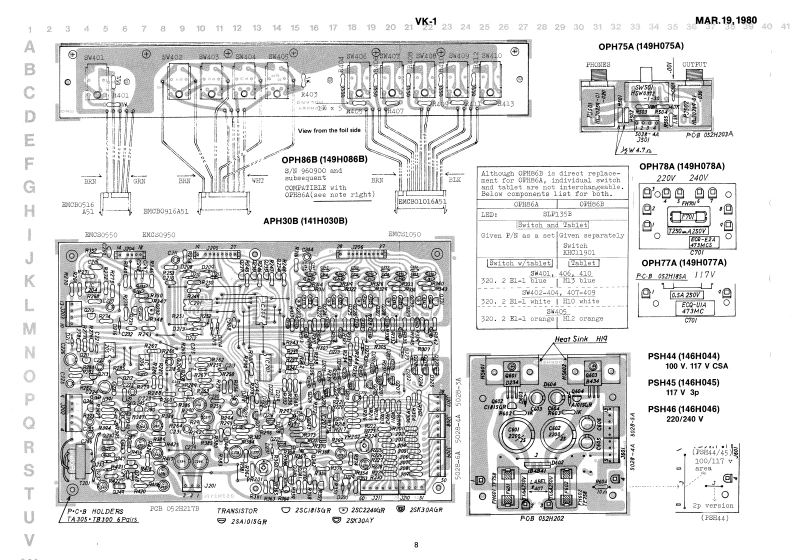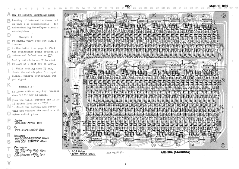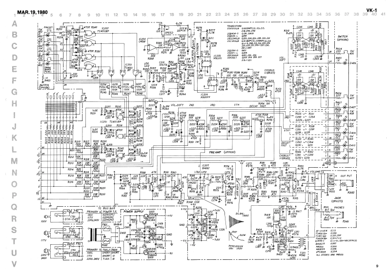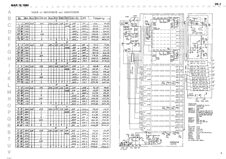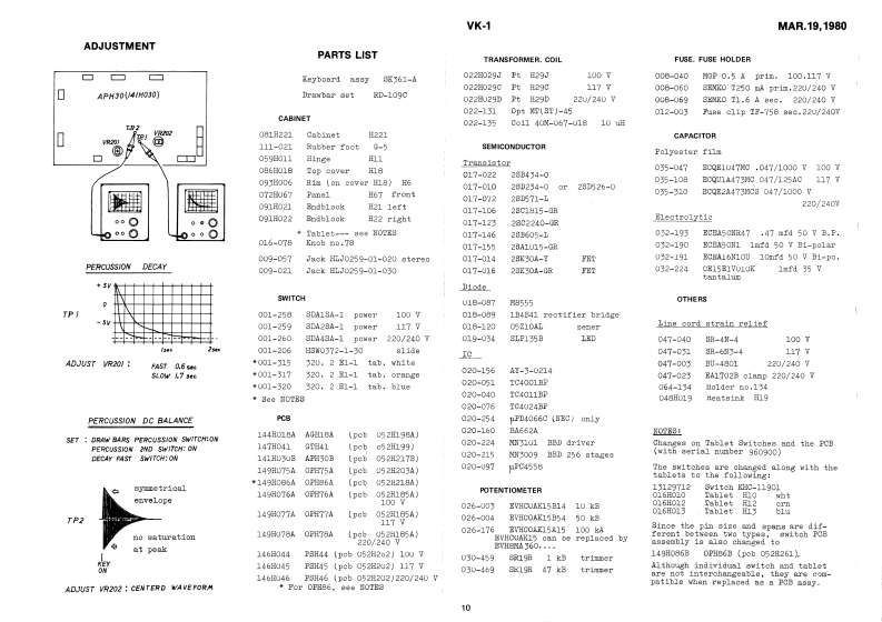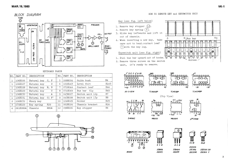 MAR.19,1980VK-1VK-1 SERVICE NOTESDISASSEMBLY-2SPECIFICATIONS1IUNB RANGB:±30C8ntaCEORUB-VIBRAPO RATE:0.3-BHgOUPPUT:L=-244B;Hm-12dB:H=0a日POVER C0N8UMFZTON:20 VattaDIHENSION8:1130()x148(h}x446(d)WEIGHT:16gabna.78《016-07a)2ot.EE00A1514(026-003】Top cover H28 (086H018)(EWE6y360B14)RENOVAL SCREW8:《1J:Top panel(feur9 chine】Pot,gEc0A15A15(026-176)r1nH6(093B006)《2 Left hand Bndbloe(3VHA360A15〔vo vood,one nach1ne】-Fot,gVHC0A15B54《026-004)Cabinet H221(BVHM360)》(3]:Keyboard (five nachine)《001H221)-Fot,3WHC0A5B14《026-C03》3w1t@h320.2E1-1CFA70B专OD122TYP28h1te(001-315→1h强ALE盘9609000nge《002-317)Detafl in PARTS LIST on PAGE 10Bmue001-3208w1tch3w0372-1-0《001-206)H1ng811(059g011JRubber foot G-5Jaek HIJ0259-01-030Svitch(111-021)(009-021j3A18A-1(001-25B)10078TM28A-11001-259》117VJack H1J0259-01-020Endblock H21-Dravbar (sat)KeyboardPane1 H67Endblook H228M48A-1《001-260)220/2407《091H021/[(072067)(091H022J(009-057JD-19G3R%1-ARolandPrinted in Japan A3 111085E2)