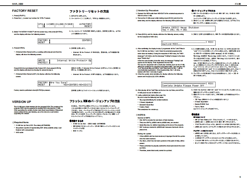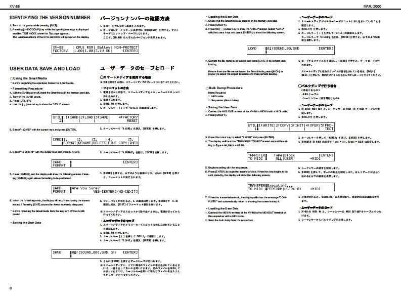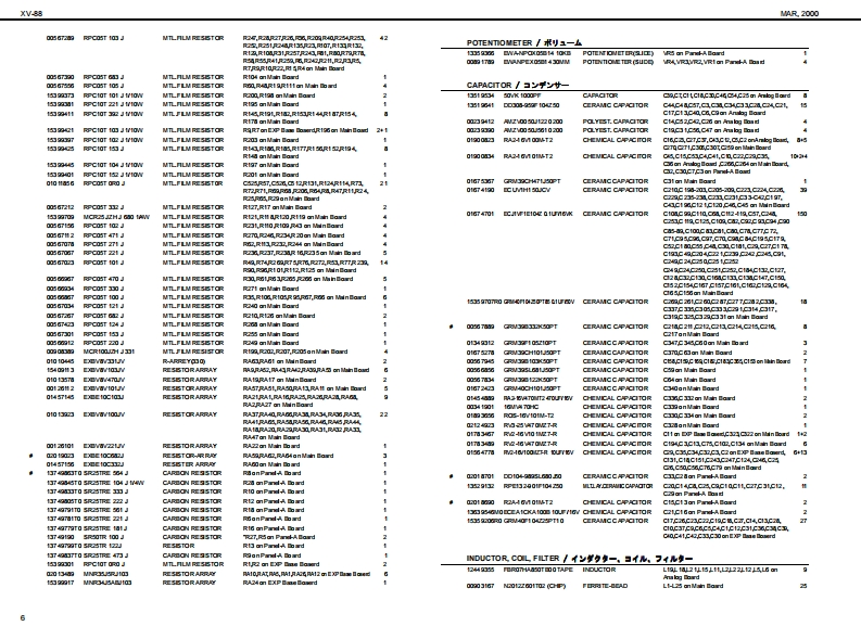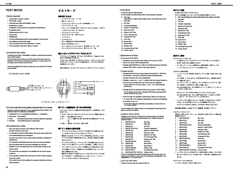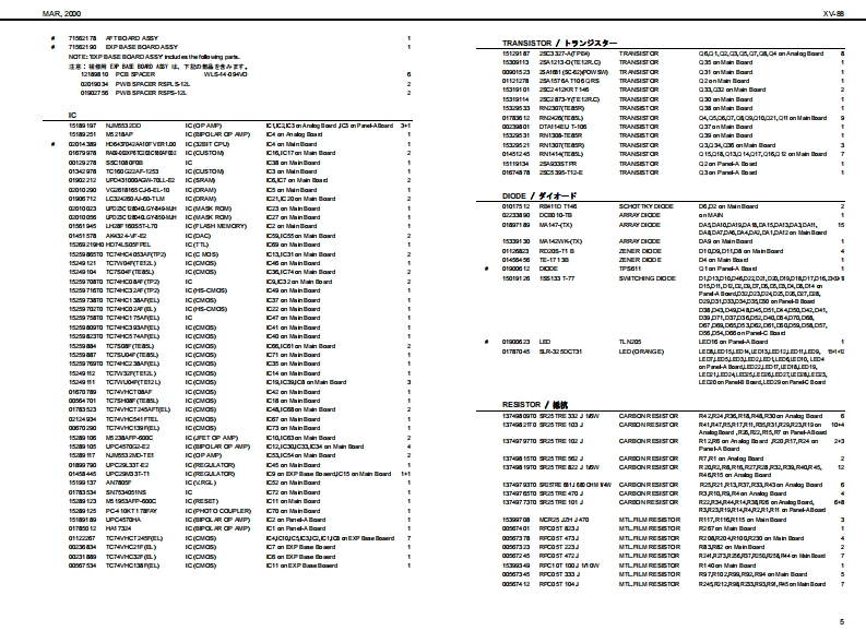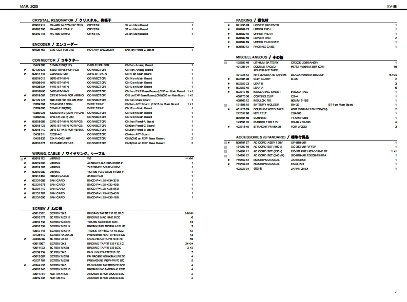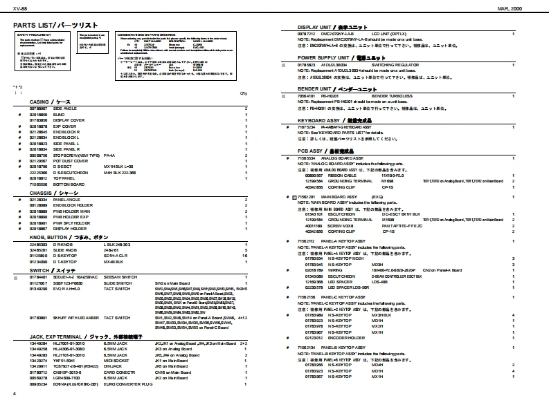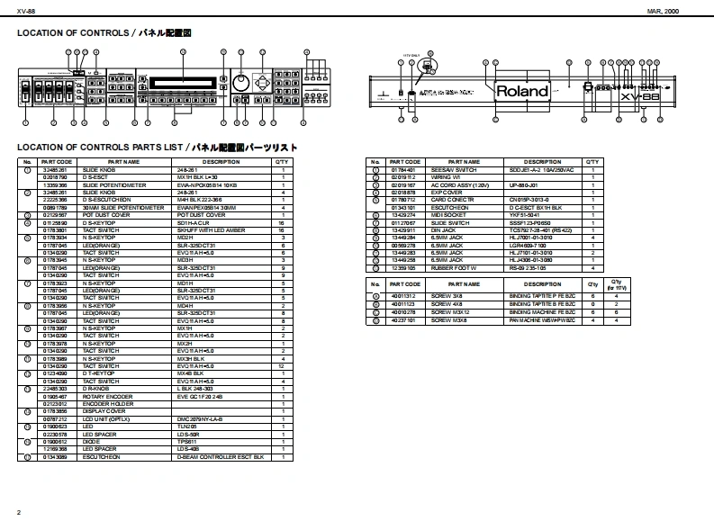 XV-88MAR,2000SERVICE NOTESSPECIFICATIONS又心以夕/主在仕模XV.88 128Voice Expandable Synthosiaor触:1进求又·工夕u包几·乡七节甲-First EditionCo ntorms to General MID 2Systom)G25入学L鲜吨)es VOICE EXPA口ABEs写YNTHESIZERIssued by R.JA●Key boaed●Dgy●规业●于4天eAF时sddh40dc子nspuadgL码velodryand dhunnd aneroudh■黄04t-·7?女号号1行6g学附ta)武成日骨可一,年来·了)一9手州能)●●ConnctoraA0母O车.hos(0C44●扬精墙于10A0四7方k59k·TABLE OF CONTENTS目次Page●水-数(ncidul cia1-位甲9?4C0,0SPECIF ICATIONS79gk+年学7L0.又心y夕/生在仕缣1●Maxdimum PolyphoryMeu年alhd12道co17r7a741-4:LOCATION OF CONTROLS ..........木儿配置同....2甲90Orpr心a民P巴MC●最大弹骨音数代容之·安甲容学L0 CATION OF CONTROLS PARTS LIST..*儿配置圆-yy入卜......2●Wave Memory国香3来一【我【L视)触罐aa0处复g香CondiPedalμEa1&EPL0 DED VIEW......分解圆.......3●那是)一EXPL0 DED VIEW PARTS UIST...分解凤-yy又卜......3●ower S.Ppya4k国E学k=)木-LF:天么·甲學7●Exparaion SiatAC10 VAC 20VACN40VPARTS UST..-y卜.n ordIDENTIFYING THE VERS ION NU阳ER...《一岁三之才一D球認方法.......82otu●ower Cord.teeh●批桶天口与kUSER DATASAVE AND LOAD.........于-0七-ブ北口-ド......8事2otnR0区物)FCT0 RY RESET.......77夕卜-也y卜D方法.....9章Dime roicms江-9:主?n·HOW TO VERSION UP THE FLASH ROM..フラy之ュ0N-之3了yD方法...9140你15P卓2特口F颗一又1Patchea:品赠16大1有●清费重功TEST0DE..........于入卜毛-卡.........1013aKEYBOARD PARTS UST ............是蟹/-列又卜14P置t●刊电学”量以一的手!●外器横KEYBOARD CIRCUIT BOARD....键盤/李一y园…….15RhoytnSt:e行t46aKEYBOARD CIRCUIT DIAGRAM....量整回路园...16铝部品06g)后寿一t果!KEYBOARD DISASSEMBLY ..........键望分解手狮..….….....17重A6始时出nM11】Owrer'uhtaru●代■BLOCK DIAGRAM..........-..-----.ブ口以夕园·配蝶园.18●U装rHoyCIRCUIT BOARD...基板园.…Patchea:8的……….1922Pertrunoc l年an4gT2CIRCUIT DIAGRAM.回路因..,..2334Powr Catle●付黑品●1一一是一ERROR MESSAGES工与一·以也一☑35●E短al Mamory10k001第6nSmurtled a Card t dd日米一第2天143-F036型6910049座1风4·。gk:4(4)220k(049金经1240k(B49线春由:鱼杯●和是)一●刷亮品●0hesCora:2typa1日g4--F天F0-0●ARd在h心P-7·天孕手四1)454FootSch (FS-身机平王)玉9,:幻明利w-王?风几9■·W是4明正华身●Centrolea3-7天11明州3E-像-·-“in teirtematof prodact①Pan Conto●7儿少工一力一Coniro4anm0C1色C3c特是天L●3)k回-5-DE-4·38-7-:Copynght2000 ROLAND CORPORATION年来儿·了3像-净孕末吉价一圆.古儿《柱企配香断下传零:丘数t西之之登想儿重t。--3之-Roland17059010Primed in Japan AA00 (NB)