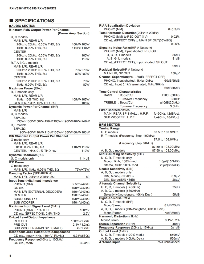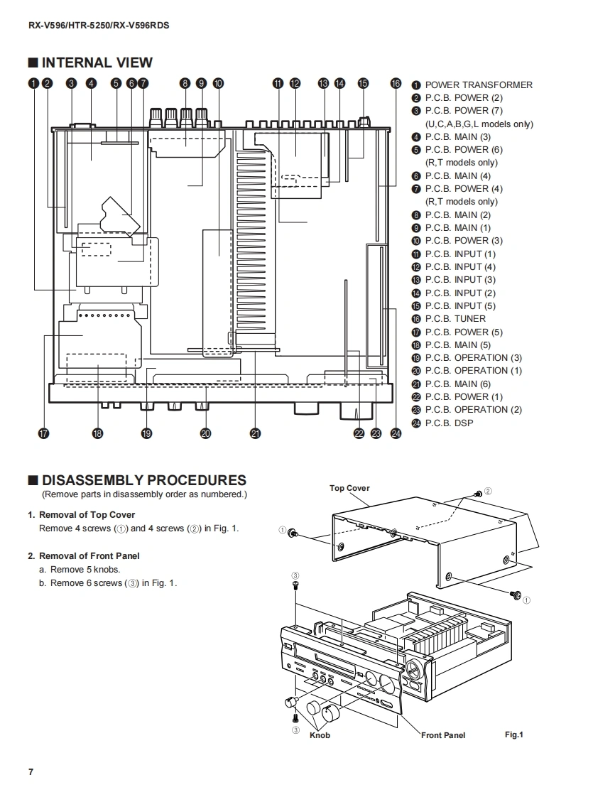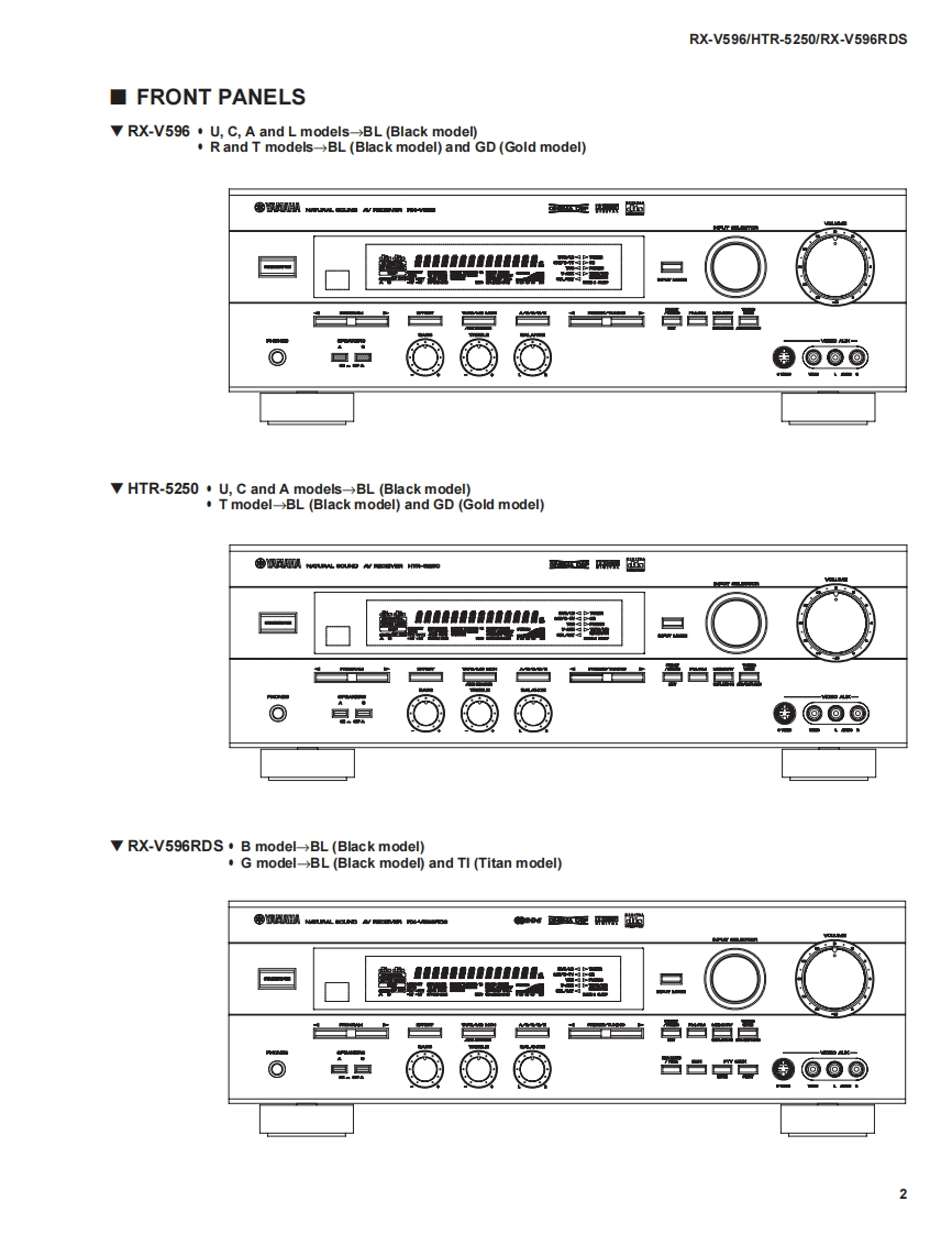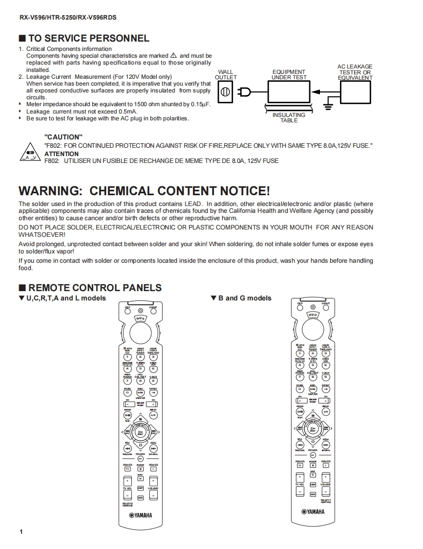 AV RECEIVERRX-V596/HTR-5250RX-V596RDSSERVICE MANUALIMPORTANT NOTICEThis manual has been provided for the use of authorized YAMAHA Retailers and their service personnelIt has been assumed that basic service procedures inherent to the industry,and more specifically YAMAHAProducts,are al ready known and understood by the users,and have therefore not been restated.WARNING:Failure to follow appropriate service and safety procedures when servicing this productmay result in personal injury,destruction of expensive components,and failure of theproduct to perform as specified.For these reasons,we advise all YAMAHA productowners that any service required should be performed by an authorized YAMAHARetailer or the appointed service representative.IMPORTANT:The presentation or sale of this manual to any individual of fim does not constituteauthorization,certification or recognition of any applicable technical capabilitiesor establish a principle-agent relationship of any form.The data provided is believed to be accurate and applicable to the unit(s)indicated on the cover.The research,engineering,and service departments of YAMA HA are continually striving to improve YAMAHA productsModifications are,therefore,inevitable and spec ifications are subject to change without notice or obligationto retrofit.Should any discrepancy appear to exist,please contact the distributor's Service DivisionWARNING:Static discharges can destroy expensive compoents.Discharge any static electricityyour body may have accumulated by grounding yourself to the ground buss in the unit(heavy gauge black wires connect to this buss).IMPORTANT:Tum the unit OFF during disassembly and part replacement.Recheck all work beforeyou apply power to the unit.CONTENTSTO SERVICE PERSONNELAMP ADJUSTMENT.21REMOTE CONTROL PANELS..TUNER ADJUSTMENT..............22-25FRONT PANELS.......2IC DATA.26-34REAR PANELS..3-4DISPLAY DATA.....35SPECIFICATIONS......5>6BLOCK DIAGRAM.....36-39INTERNAL VIEW............7PRINTED CIRCUIT BOARD..40-59DISASSEMBLY PROCEDURES...7SCHEMATIC DIAGRAM......60-67SELF DIAGNOSIS FUNCTION...819PARTS LIST.......…68-86FACTORY PRESET...........….20REMOTE CONTROL TRANSMITTER ...................87~88一入二2下儿、工?一夕鹅定再生纸使用儿T1寸his Service Manual uses recycled paper.100716YAMAHAYAMAHA CORPORATIONP.O.Box1.Hamamatsu.Japan