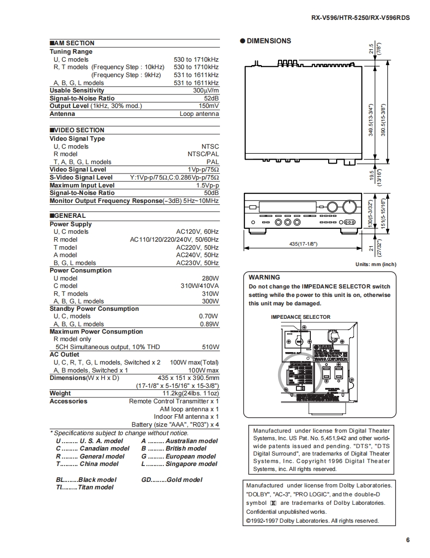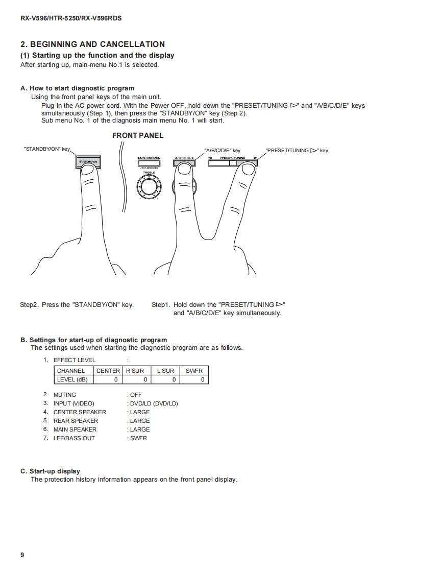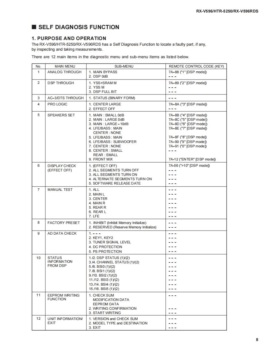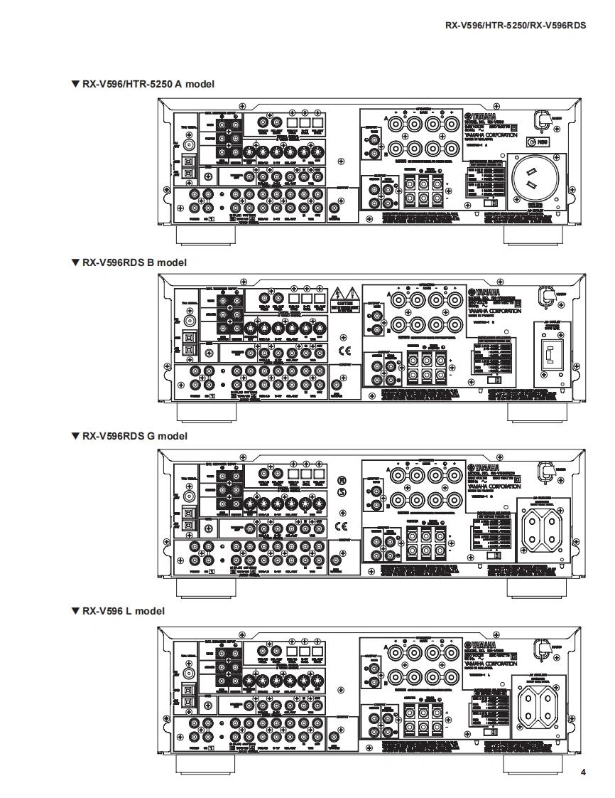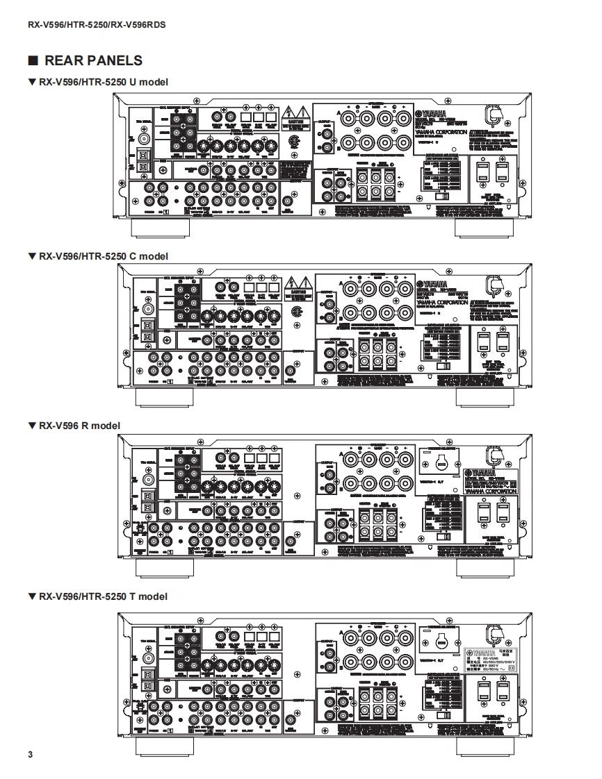 AV RECEIVERRX-V596/HTR-5250RX-V596RDSSERVICE MANUALIMPORTANT NOTICEThis manual has been provided for the use of authorized YAMAHA Retailers and their service personnelIt has been assumed that basic service procedures inherent to the industry,and more specifically YAMAHAProducts,are al ready known and understood by the users,and have therefore not been restated.WARNING:Failure to follow appropriate service and safety procedures when servicing this productmay result in personal injury,destruction of expensive components,and failure of theproduct to perform as specified.For these reasons,we advise all YAMAHA productowners that any service required should be performed by an authorized YAMAHARetailer or the appointed service representative.IMPORTANT:The presentation or sale of this manual to any individual of fim does not constituteauthorization,certification or recognition of any applicable technical capabilitiesor establish a principle-agent relationship of any form.The data provided is believed to be accurate and applicable to the unit(s)indicated on the cover.The research,engineering,and service departments of YAMA HA are continually striving to improve YAMAHA productsModifications are,therefore,inevitable and spec ifications are subject to change without notice or obligationto retrofit.Should any discrepancy appear to exist,please contact the distributor's Service DivisionWARNING:Static discharges can destroy expensive compoents.Discharge any static electricityyour body may have accumulated by grounding yourself to the ground buss in the unit(heavy gauge black wires connect to this buss).IMPORTANT:Tum the unit OFF during disassembly and part replacement.Recheck all work beforeyou apply power to the unit.CONTENTSTO SERVICE PERSONNELAMP ADJUSTMENT.21REMOTE CONTROL PANELS..TUNER ADJUSTMENT..............22-25FRONT PANELS.......2IC DATA.26-34REAR PANELS..3-4DISPLAY DATA.....35SPECIFICATIONS......5>6BLOCK DIAGRAM.....36-39INTERNAL VIEW............7PRINTED CIRCUIT BOARD..40-59DISASSEMBLY PROCEDURES...7SCHEMATIC DIAGRAM......60-67SELF DIAGNOSIS FUNCTION...819PARTS LIST.......…68-86FACTORY PRESET...........….20REMOTE CONTROL TRANSMITTER ...................87~88一入二2下儿、工?一夕鹅定再生纸使用儿T1寸his Service Manual uses recycled paper.100716YAMAHAYAMAHA CORPORATIONP.O.Box1.Hamamatsu.Japan