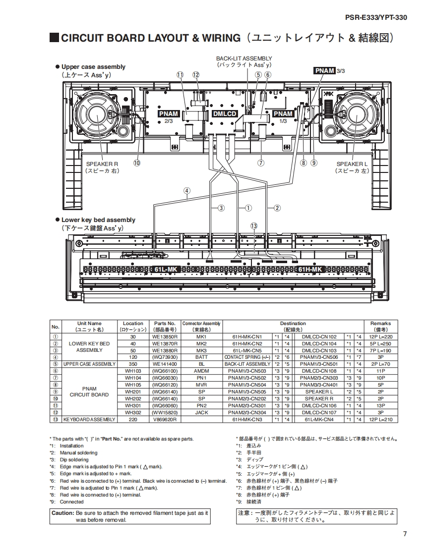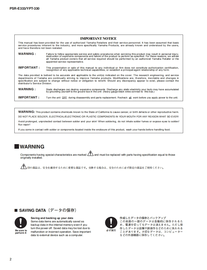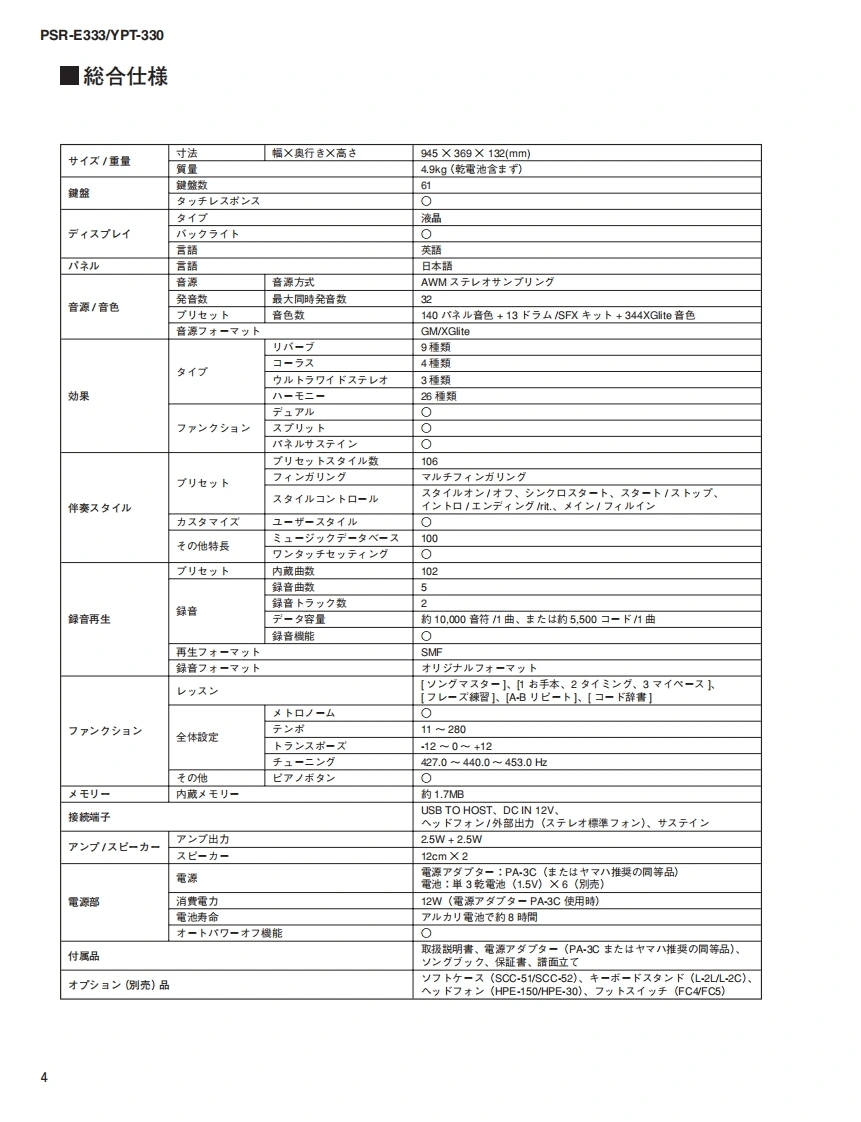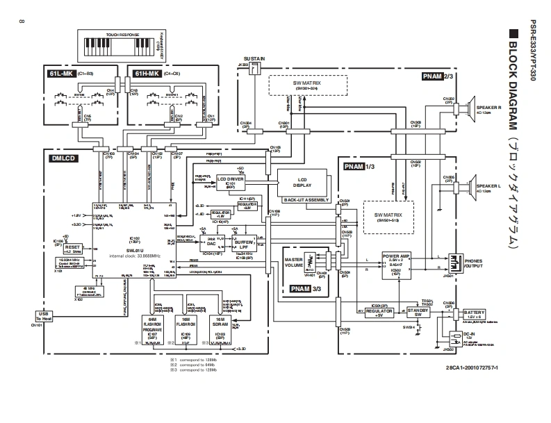 三33三3/YPT-330SERVICE MANUALPSR-E333EYPT-330*YPT-330 is an overseas export model..(YPT-330休输出專用毛于儿寸。)■CONTENTS(目次)SPECIFICATIONS(稔合仕樣)3/4PANEL LAYOUT(Iパ礻儿T卜)..5CIRCUIT BOARD LAYOUT WIRING(工二y卜y了ヴ卜&結線☒)BLOCK DIAGRAM(ブ口y夕ダ亻5ラ厶).7.8DISASSEMBLY PROCEDURE(分解手順)9LSI PIN DESCRIPTION(LSI端子機能表)15CIRCUIT BOARDS(-卜基板☒)....17TEST PROGRAM(テ又卜プ口5ラ厶)2124BACKUP(/fy夕了y).27/28INITIALIZATION(初期化).....27/28Products names are as follows.CONNECTING A PERSONAL COMPUTER(商品名体以下0女仁在)丰寸。)(口上1一夕一之接続寸石)29/30For Japanese market(国内向(寸):TRANSFERRING DATA BETWEEN THE PSR-E333/YPT-330 and a COMPUTERPORTATONE(PSR-E333彐>七1-夕-0間下デ-夕卷送受信寸百)3133SYSTEM BOOTING FLOWCHARTFor overseas market(海外向(寸):(起動7口一于ヤ-卜).35/36DIGITAL KEYBOARDPARTS LISTOVERALL CIRCUIT DIAGRAM(豁回路☒)PK001852YAMAHAHAMAMATSU,JAPANCopyright (c)Yamaha Corporation.All rights reserved.PDF '11.03