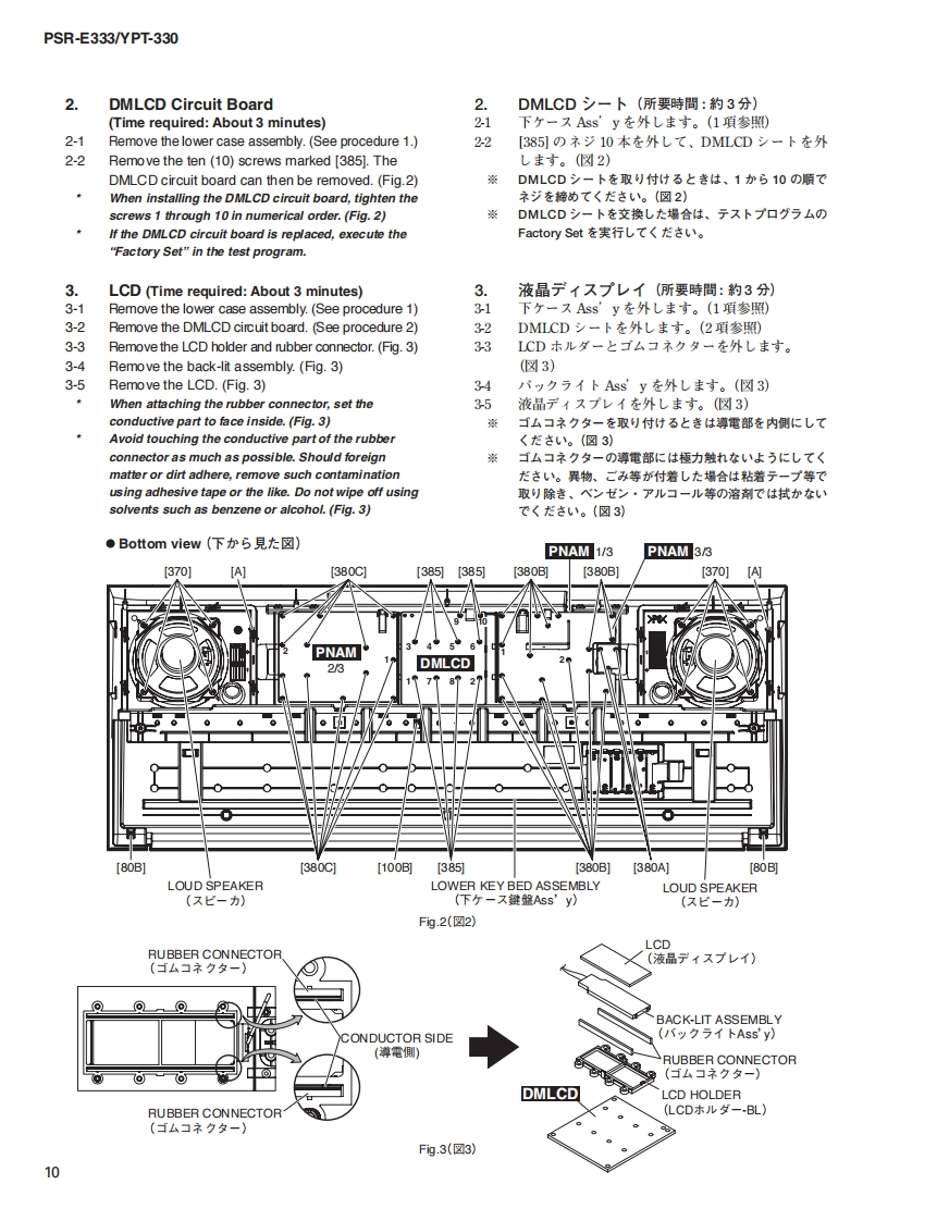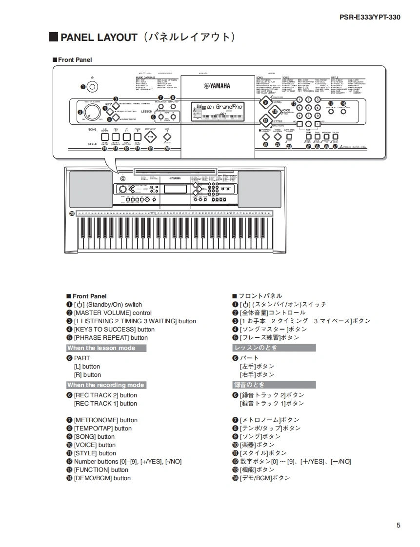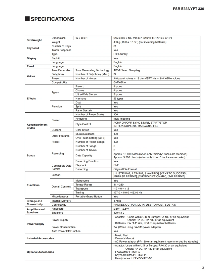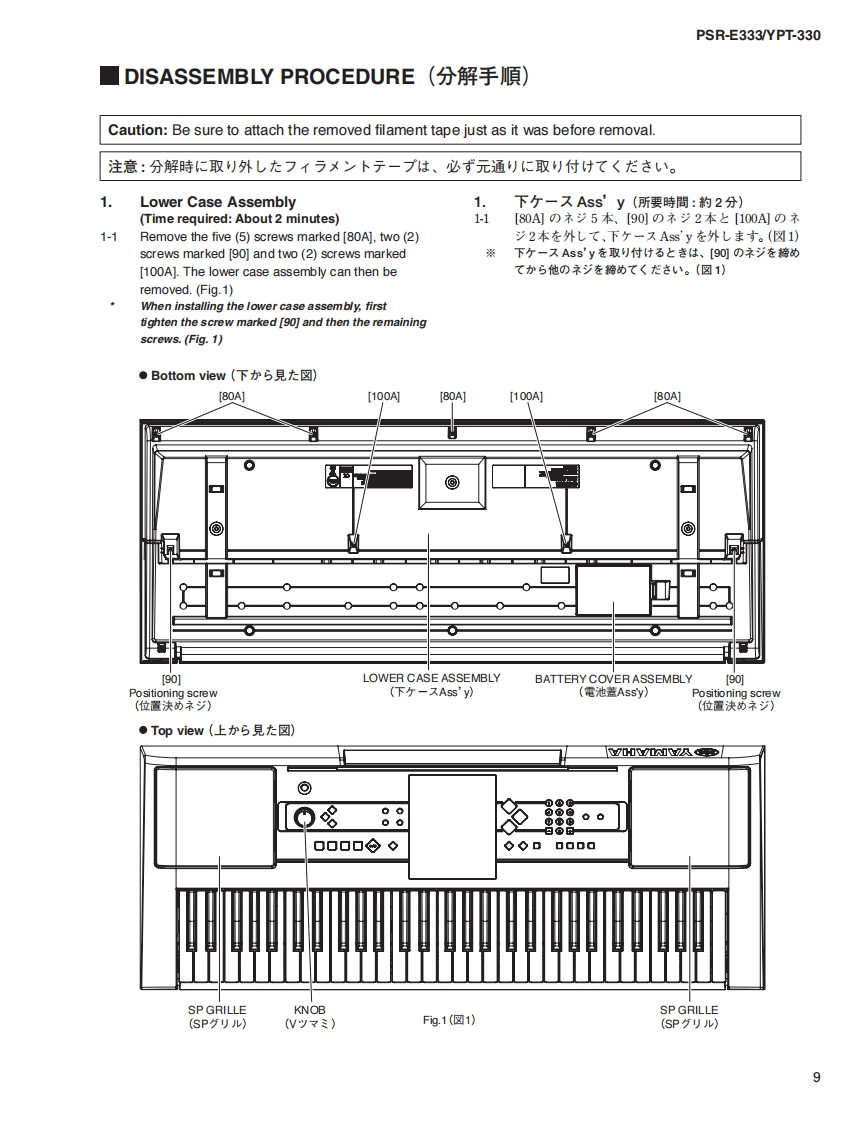 三33三3/YPT-330SERVICE MANUALPSR-E333EYPT-330*YPT-330 is an overseas export model..(YPT-330休输出專用毛于儿寸。)■CONTENTS(目次)SPECIFICATIONS(稔合仕樣)3/4PANEL LAYOUT(Iパ礻儿T卜)..5CIRCUIT BOARD LAYOUT WIRING(工二y卜y了ヴ卜&結線☒)BLOCK DIAGRAM(ブ口y夕ダ亻5ラ厶).7.8DISASSEMBLY PROCEDURE(分解手順)9LSI PIN DESCRIPTION(LSI端子機能表)15CIRCUIT BOARDS(-卜基板☒)....17TEST PROGRAM(テ又卜プ口5ラ厶)2124BACKUP(/fy夕了y).27/28INITIALIZATION(初期化).....27/28Products names are as follows.CONNECTING A PERSONAL COMPUTER(商品名体以下0女仁在)丰寸。)(口上1一夕一之接続寸石)29/30For Japanese market(国内向(寸):TRANSFERRING DATA BETWEEN THE PSR-E333/YPT-330 and a COMPUTERPORTATONE(PSR-E333彐>七1-夕-0間下デ-夕卷送受信寸百)3133SYSTEM BOOTING FLOWCHARTFor overseas market(海外向(寸):(起動7口一于ヤ-卜).35/36DIGITAL KEYBOARDPARTS LISTOVERALL CIRCUIT DIAGRAM(豁回路☒)PK001852YAMAHAHAMAMATSU,JAPANCopyright (c)Yamaha Corporation.All rights reserved.PDF '11.03