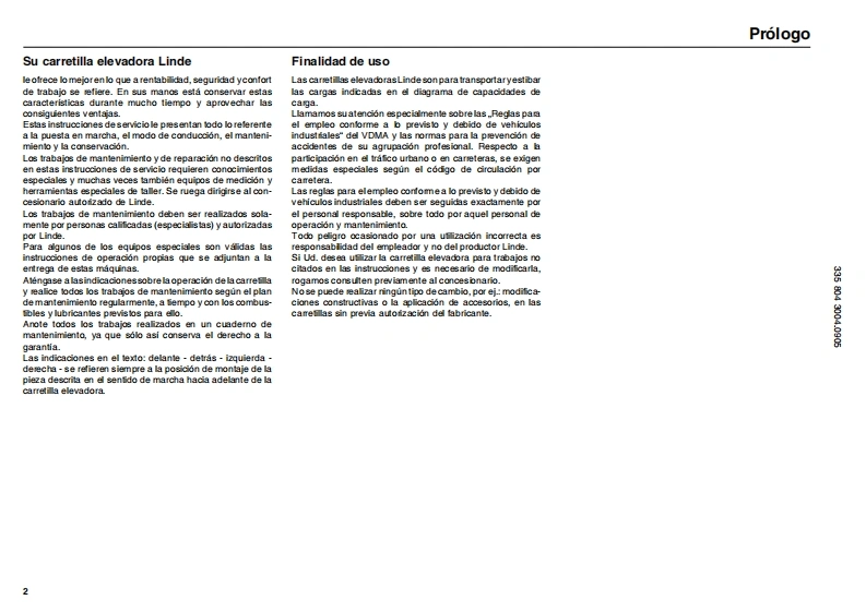 林德linde-e14-02-1-0291947001683020420找手册网21小时前发布关注私信5.77MB98页050林德linde-e14-02-1-0291947001683020420此内容为付费资源,请付费后查看¥29¥31黄金会员免费钻石会员免费立即购买您当前未登录!建议登陆后购买,可保存购买订单付费资源 第1页 / 共98页 第2页 / 共98页 第3页 / 共98页 第4页 / 共98页 第5页 / 共98页 第6页 / 共98页 第7页 / 共98页 第8页 / 共98页 第9页 / 共98页 第10页 / 共98页 试读已结束,还剩88页,您可下载完整版后进行离线阅读 THE END三一/合力/大连叉车/丰田叉车/林德叉车/三菱叉车 文本预览 B-20m1Instrucciones de servicioCarretilla elevadora LindeE14-02/E16-02/E16C-02/E18C-02E16P-02/E18P-02/E20P-02con motores electricos3358043004E0905 查看更多 收起部分 喜欢就支持一下吧收藏