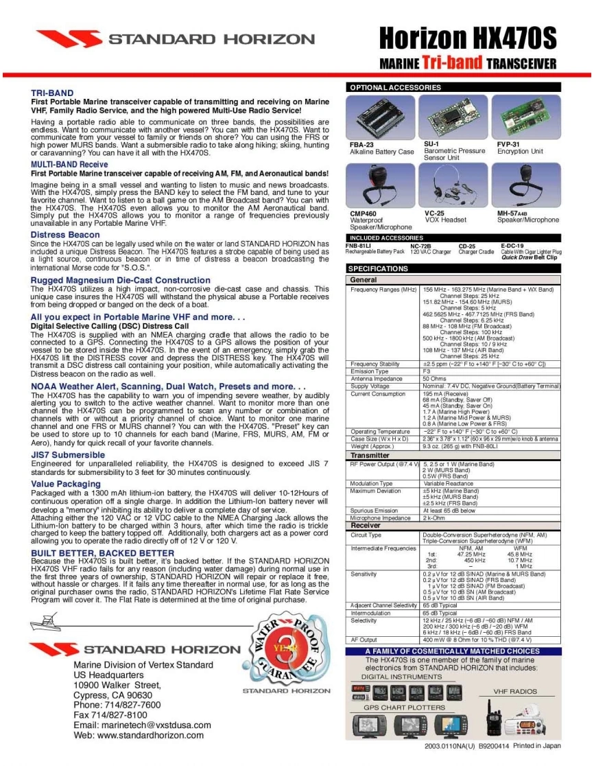 STANDARD HORIZONHorizon HX470SMARINE Tri-band TRANSCEIVER.Industries first Portable Tri-band,includingSelectable 1,2.5 or 5 Watts of transmitVHF Marine,FRS and MURS bands.power on marine band.Additional receive capabilities include AM,Rugged Magnesium Die-cast case constructionFM broadcast and Aeronautical bands..Includes 1300 mAh Lithium-ion battery,.DSC Distress with GPS position120 AC and 12 VDC 3 hour chargers,when connected to GPSDrop in charger NMEA cradle.Unique Distress Beacon.3 year waterproof warrantyINDUSTRY FIRSTTri-bandSTANDARD HORIZONSTANDARD HORIZONDISTRES816P16pSUBMERSIBLE HX470SSUBMERSIBLE HX470SBANDBAND169WXSCANPRESETMENUMIERPROOFMEMMEMSMH/LEEActual SizeAVAILABLE IN BLACKSTANDARD HORIZONMULTI PURPOSE MARINE PORTABLETRANSMIT RECEIVERECEIVE ONLYVHF+FRSMURSAir Band+FM+AMNOAAMarineBroadcastBroadcast+Weather BandNothing takes to water like Horizon!