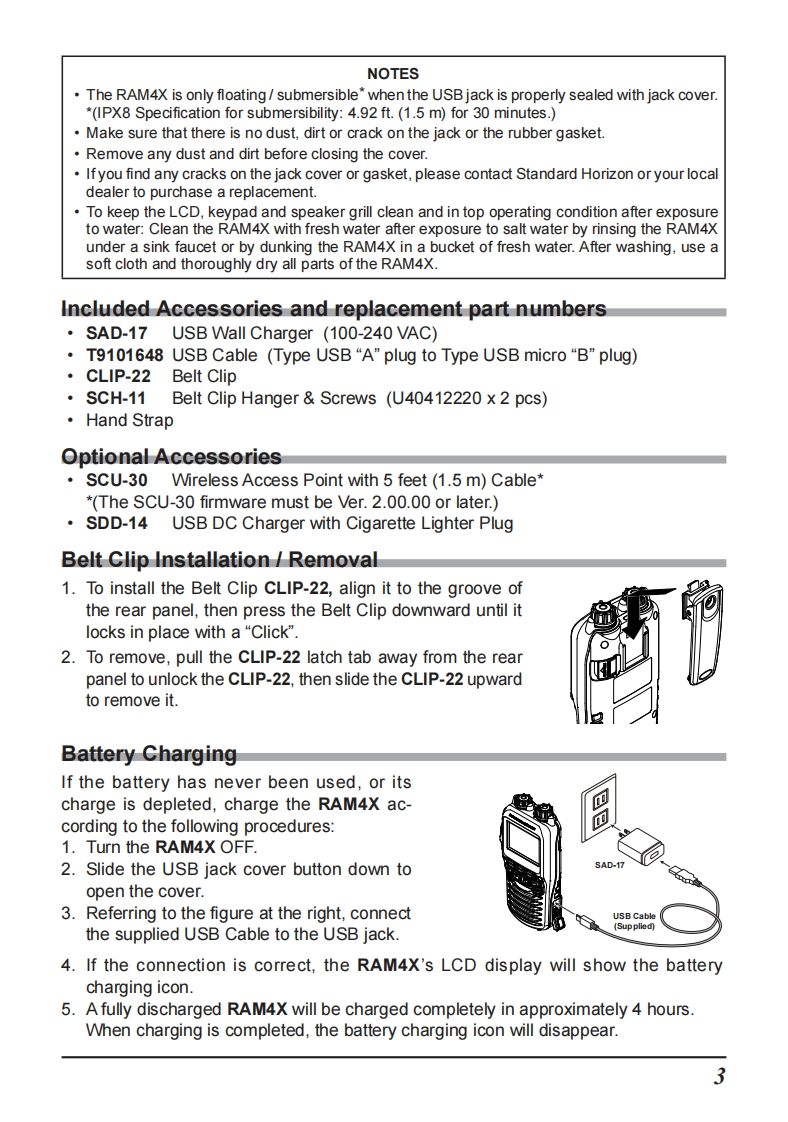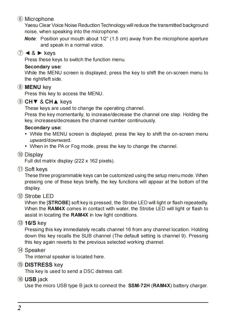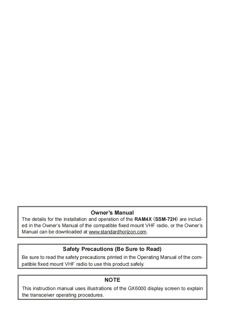 STANDARD HORIZONNothing takes to water like Standard HorizonRAM4X(SSM-72H)Wireless Remote Access MicrophoneSTANDARD HORIZONRAM 4XUSA HIDISTRESSDATE LOCENUNOTETo connect the SSM-72H (RAM4X),the SCU-30 Wireless Access Pointfirmware must be Ver.2.00.00 or later.The RAM4X (SSM-72H)allows remote control for all functions (Except "SPEAKERSELECT"in the CONFIGURATION SETUP MENU),of the enabled StandardHorizon fixed mount VHF radio.The full dot matrix display and programmable keysmake operations quick and easy.Additional features include a Water activatedEmergency Strobe Light,a MOB(Man Over-Board)function,and all DSC functionsincluding Distress Signaling.Utilizing the optional SCU-30 Wireless Access Point,up to four RAM4X (SSM-72H)Wireless Remote Access Microphones may beconnected to a fixed mount VHF radio.