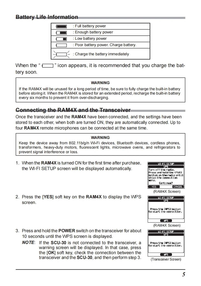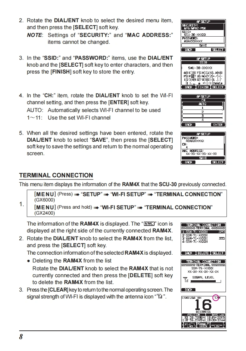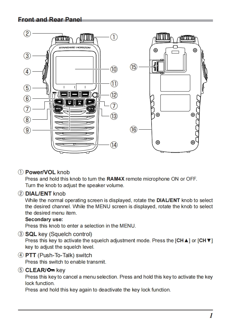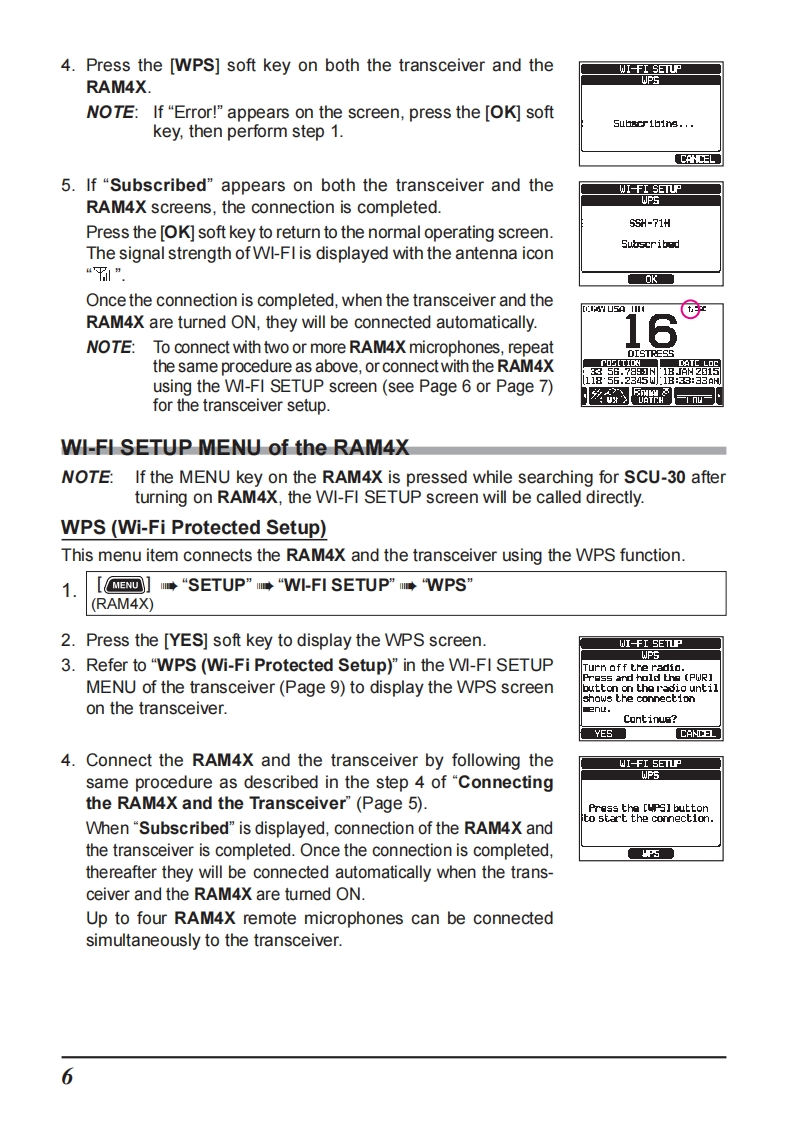STANDARD HORIZONNothing takes to water like Standard HorizonRAM4X(SSM-72H)Wireless Remote Access MicrophoneSTANDARD HORIZONRAM 4XUSA HIDISTRESSDATE LOCENUNOTETo connect the SSM-72H (RAM4X),the SCU-30 Wireless Access Pointfirmware must be Ver.2.00.00 or later.The RAM4X (SSM-72H)allows remote control for all functions (Except "SPEAKERSELECT"in the CONFIGURATION SETUP MENU),of the enabled StandardHorizon fixed mount VHF radio.The full dot matrix display and programmable keysmake operations quick and easy.Additional features include a Water activatedEmergency Strobe Light,a MOB(Man Over-Board)function,and all DSC functionsincluding Distress Signaling.Utilizing the optional SCU-30 Wireless Access Point,up to four RAM4X (SSM-72H)Wireless Remote Access Microphones may beconnected to a fixed mount VHF radio.