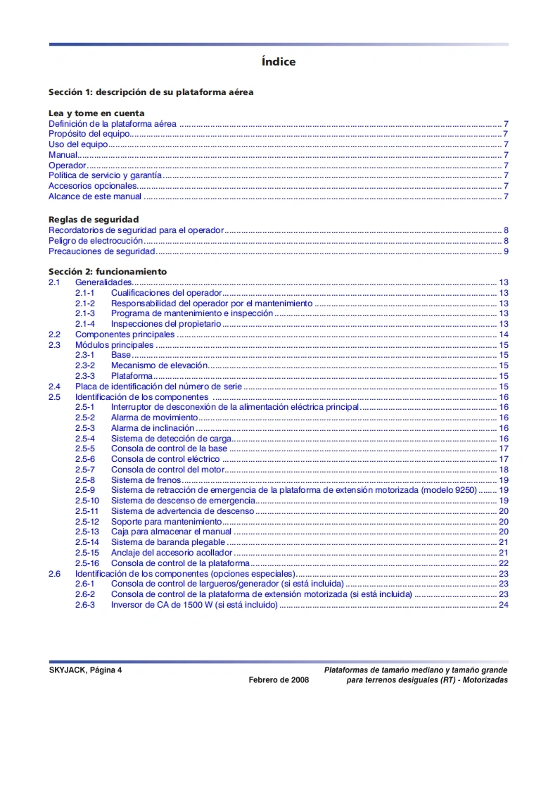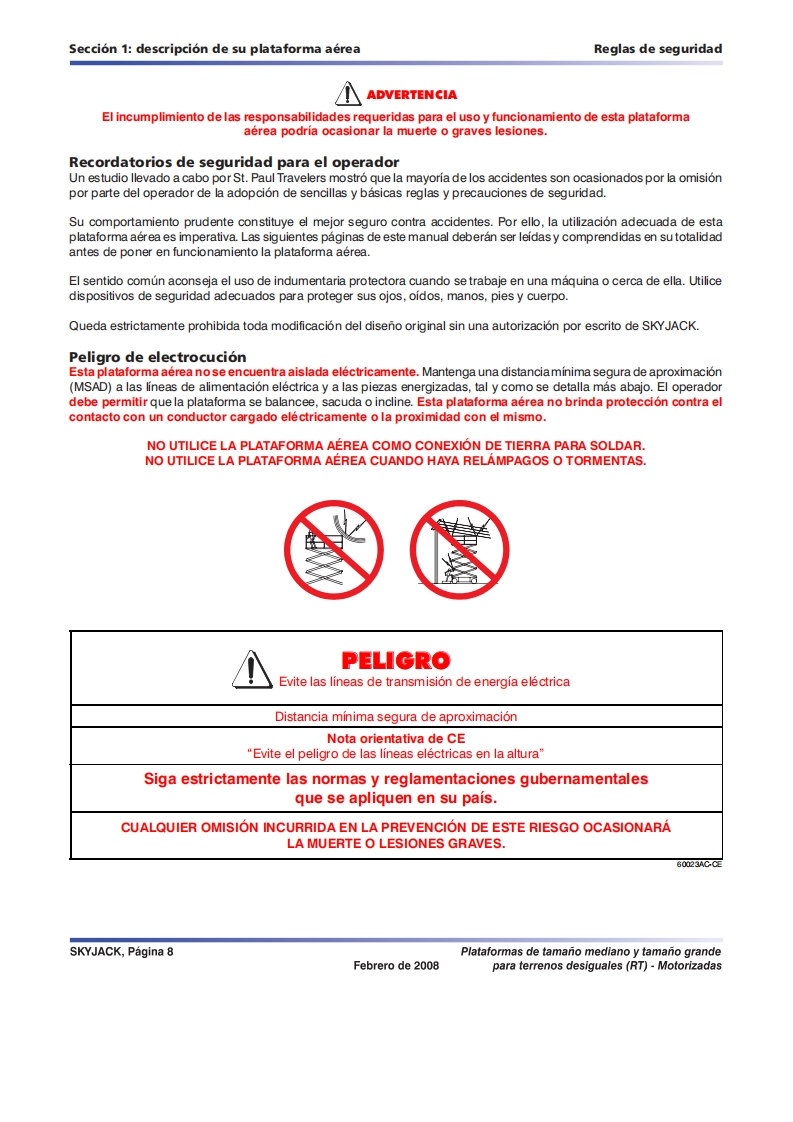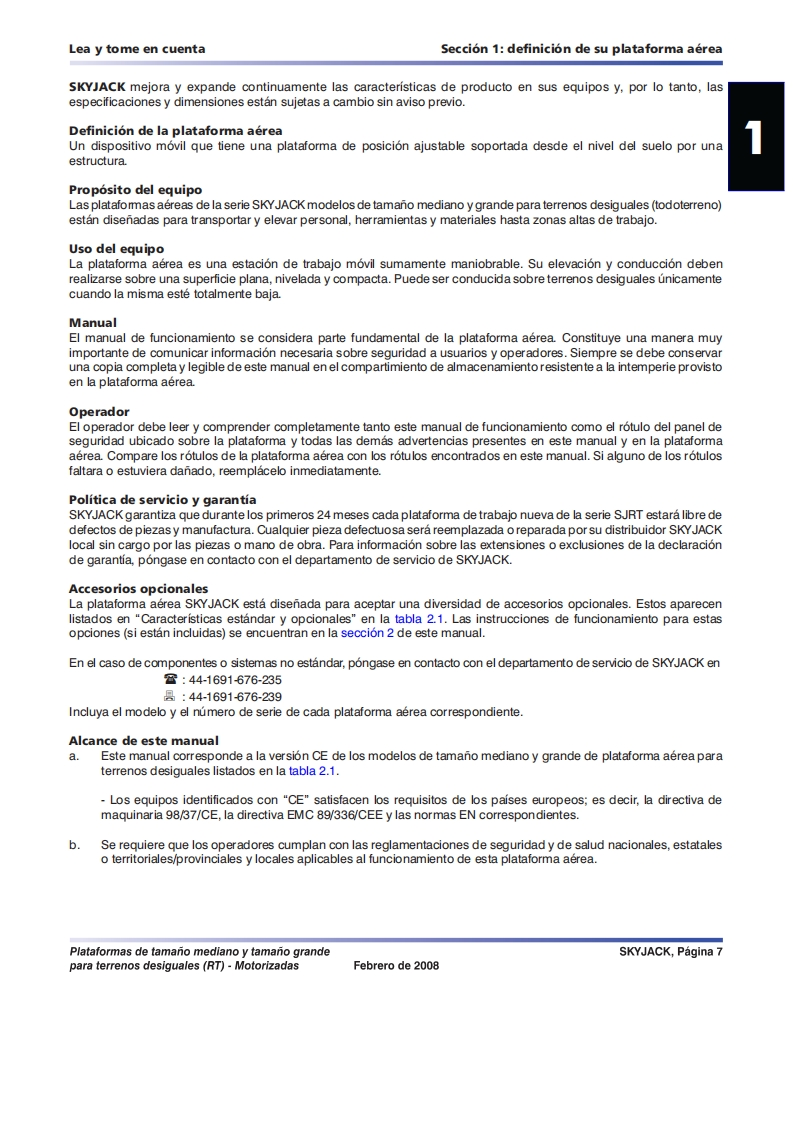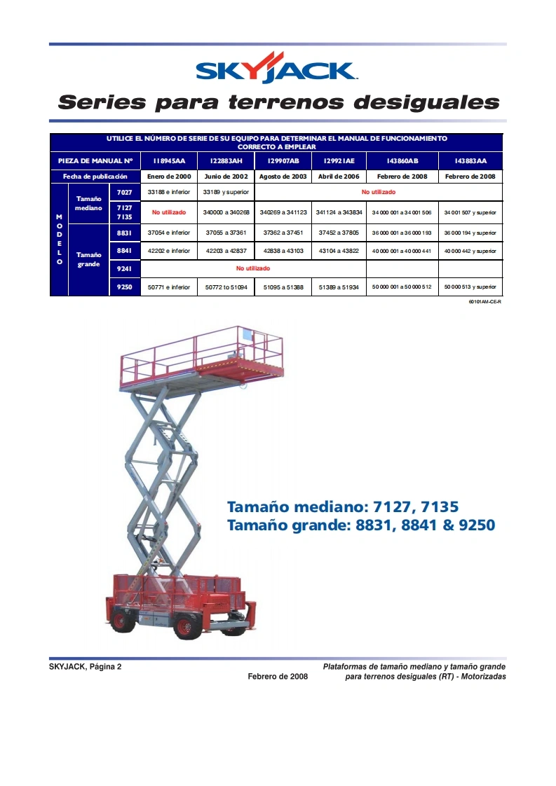 SKYACKMANUAL DE FUNCIONAMIENTOCEMotorizadosEste manual debe permanecer siempre almacenado con la plataforma aerea.SerlesManual de funcionamiento CEdesigualespara terrenosPara obtener servicio llame al.....800275-9522Tamanio grande:8831,8841Tamafo mediano:7127,7135Modelos:Skyjack Service Center 3451 Swenson Ave.,St.Charles,IL 60174 EE.UU............FAX630 262-0006Para obtener piezas en Norteamerica y Asia llame al.............800965-4626Skyjack Parts Center 3451 Swenson Ave.,St.Charles,IL.60174 EE.UU..............FAX888 782-4825Para obtener piezas y servicio en Europa llame al....................441691-676-235Skyjack Europe,Glovers Meadow,Maesbury Rd.,Oswestry,Shropshire,Reino Unido........FAX 44-1691-676-2393250143860AB-BImpreso en CanadaFebrero de 2008