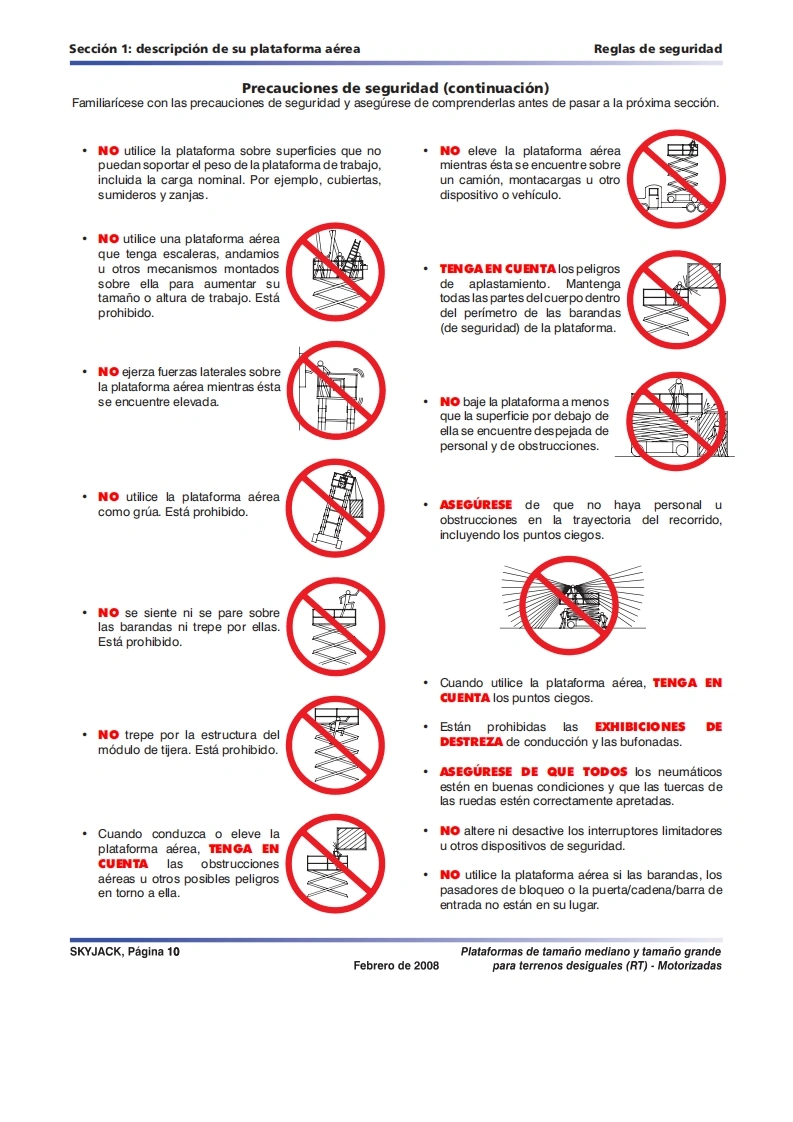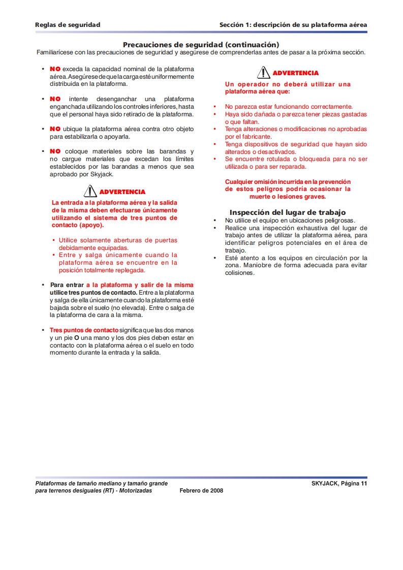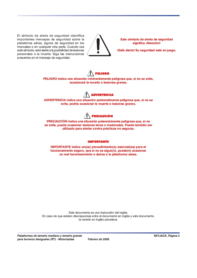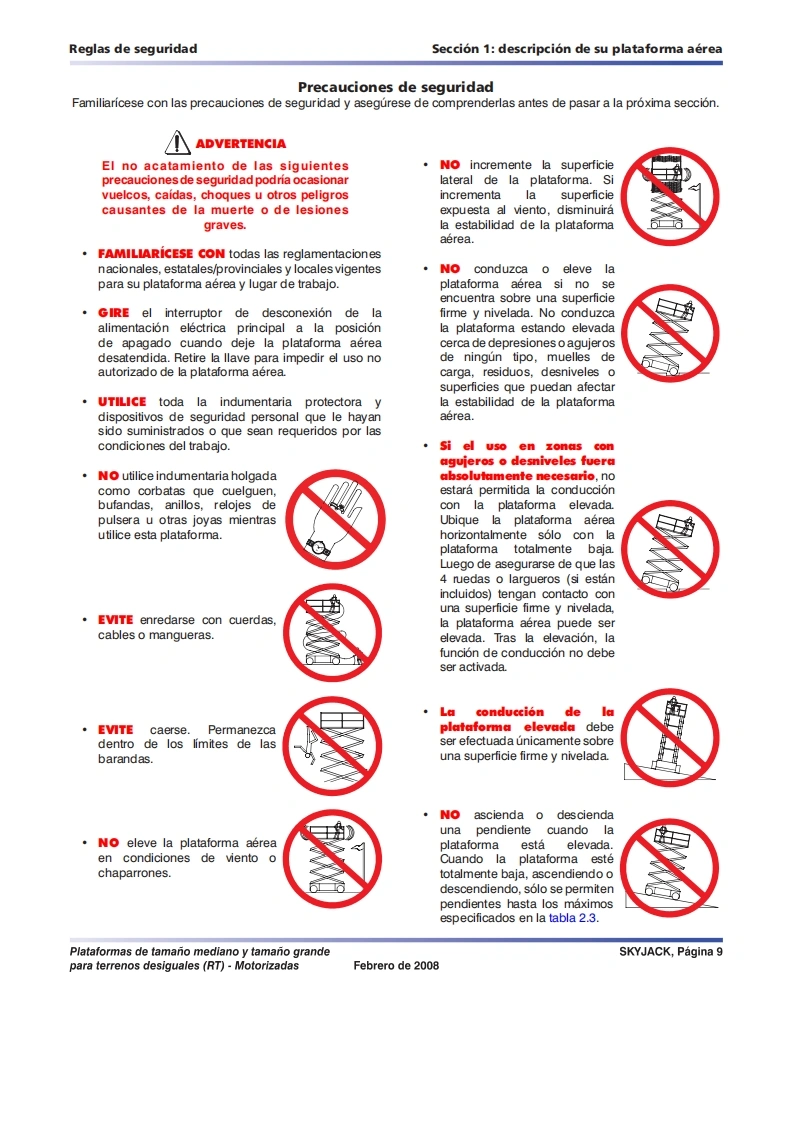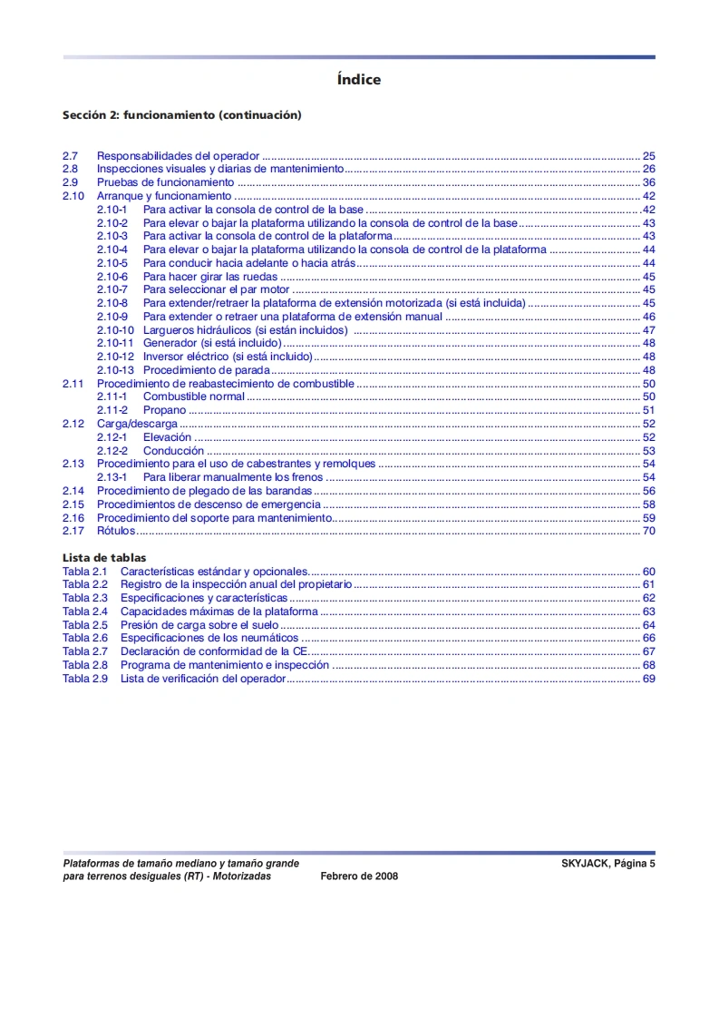 SKYACKMANUAL DE FUNCIONAMIENTOCEMotorizadosEste manual debe permanecer siempre almacenado con la plataforma aerea.SerlesManual de funcionamiento CEdesigualespara terrenosPara obtener servicio llame al.....800275-9522Tamanio grande:8831,8841Tamafo mediano:7127,7135Modelos:Skyjack Service Center 3451 Swenson Ave.,St.Charles,IL 60174 EE.UU............FAX630 262-0006Para obtener piezas en Norteamerica y Asia llame al.............800965-4626Skyjack Parts Center 3451 Swenson Ave.,St.Charles,IL.60174 EE.UU..............FAX888 782-4825Para obtener piezas y servicio en Europa llame al....................441691-676-235Skyjack Europe,Glovers Meadow,Maesbury Rd.,Oswestry,Shropshire,Reino Unido........FAX 44-1691-676-2393250143860AB-BImpreso en CanadaFebrero de 2008