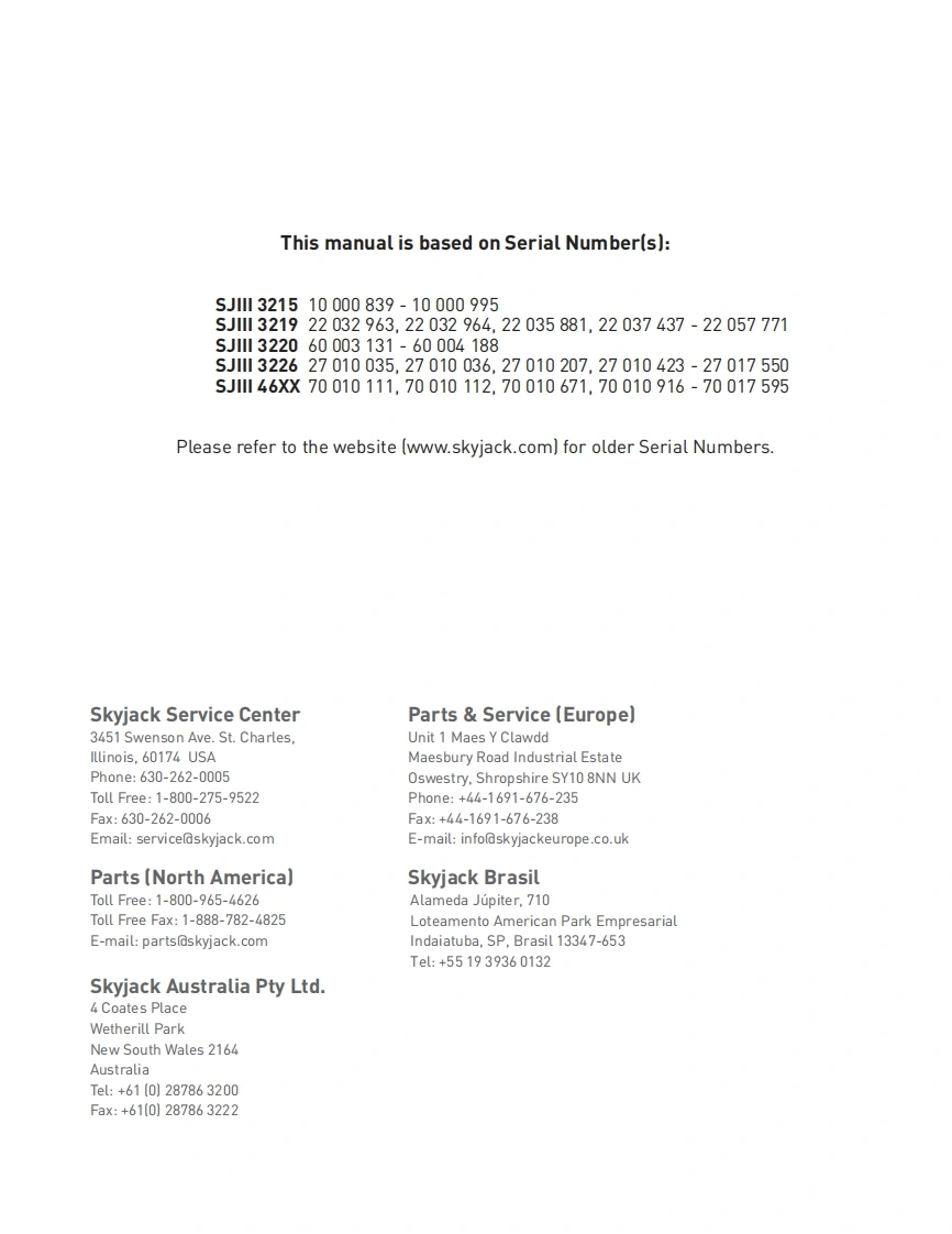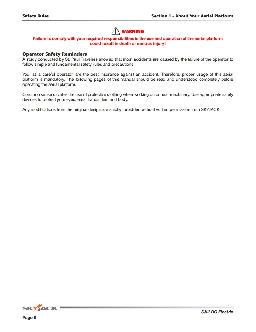 Skyjack-S111-4626-Operators-Manual操作与维护保养说明书手册找手册网18小时前发布关注私信9.53MB106页022Skyjack-S111-4626-Operators-Manual操作与维护保养说明书手册此内容为付费资源,请付费后查看¥29¥31黄金会员免费钻石会员免费立即购买您当前未登录!建议登陆后购买,可保存购买订单付费资源 第1页 / 共106页 第2页 / 共106页 第3页 / 共106页 第4页 / 共106页 第5页 / 共106页 第6页 / 共106页 第7页 / 共106页 第8页 / 共106页 第9页 / 共106页 第10页 / 共106页 试读已结束,还剩96页,您可下载完整版后进行离线阅读 THE ENDJCB/鼎力/诺力/Skyjack 文本预览 SKYACKSJIII 32193219 DC ELECTRICOPERATING MANUAL (ANSI/CSA)DC ELECTRIC SCISSORSMODELS SJIII 3215 SJIlI 3219 SJIII 3220 SJIlI 3226 SJIII 4626 SJIlI 4632158000AC-A February 2014SKYACK 查看更多 收起部分 喜欢就支持一下吧收藏