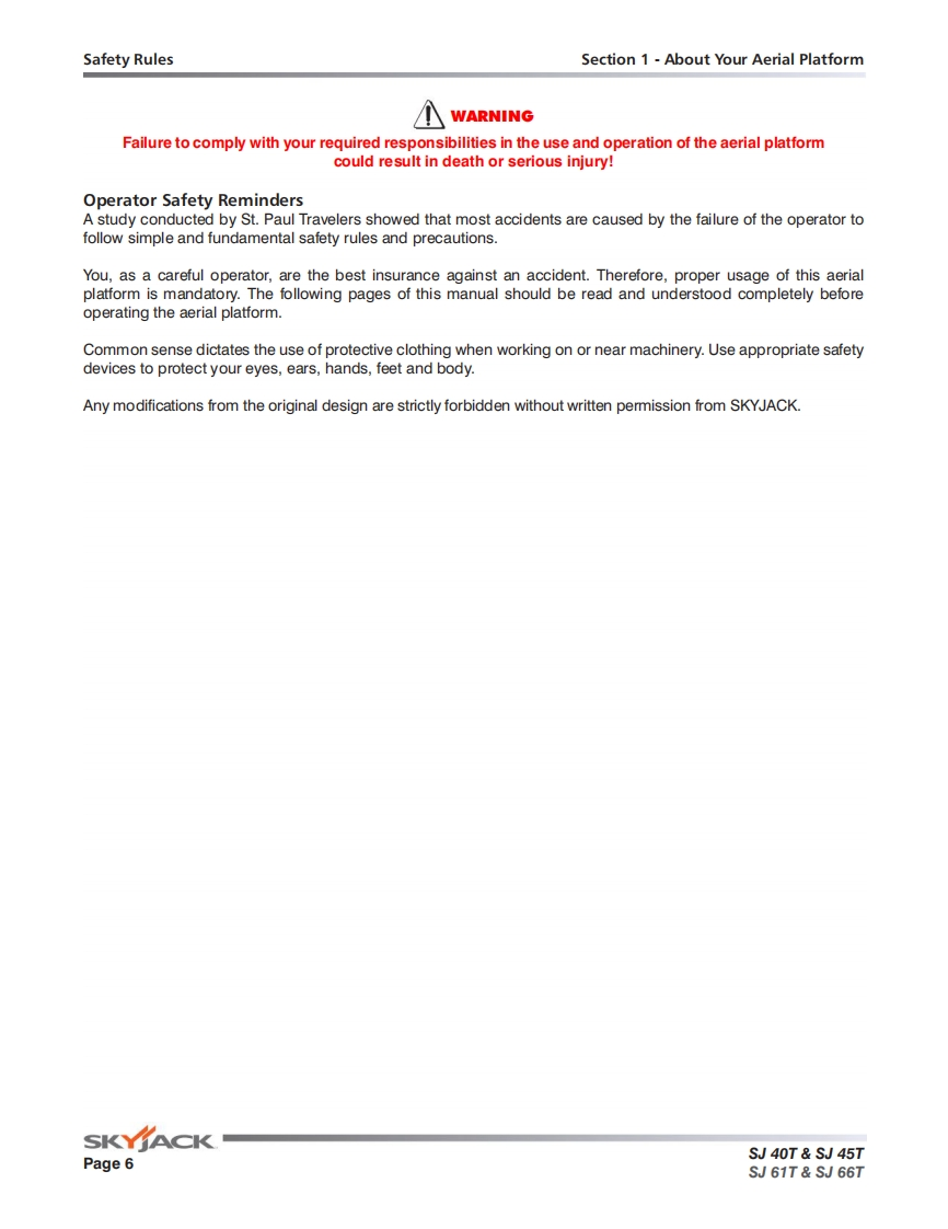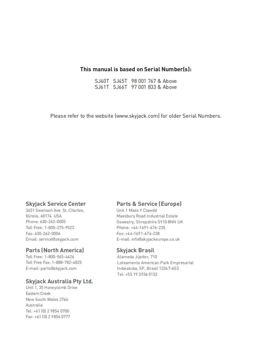 Skyjack-SJ-45T-Operations-Manual操作与维护保养说明书手册找手册网18小时前发布关注私信10.11MB106页041Skyjack-SJ-45T-Operations-Manual操作与维护保养说明书手册此内容为付费资源,请付费后查看¥29¥31黄金会员免费钻石会员免费立即购买您当前未登录!建议登陆后购买,可保存购买订单付费资源 第1页 / 共106页 第2页 / 共106页 第3页 / 共106页 第4页 / 共106页 第5页 / 共106页 第6页 / 共106页 第7页 / 共106页 第8页 / 共106页 第9页 / 共106页 第10页 / 共106页 试读已结束,还剩96页,您可下载完整版后进行离线阅读 THE ENDJCB/鼎力/诺力/Skyjack 文本预览 GPSd5SKMACKOPERATING MANUAL (ANSI/CSA)TELESCOPIC BOOMSMODELS SJ40T SJ45T SJ61T SJ66T207518AEA November 2018SK∥ACK 查看更多 收起部分 喜欢就支持一下吧收藏